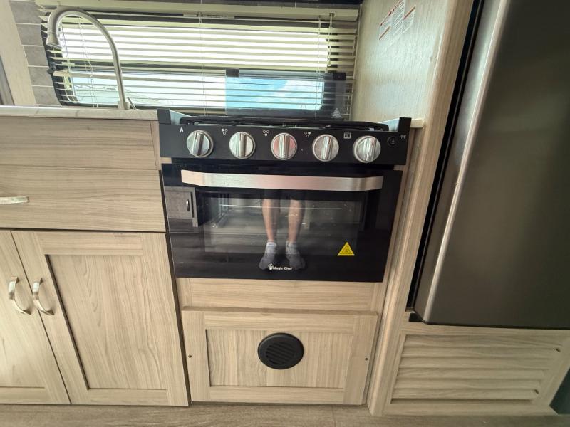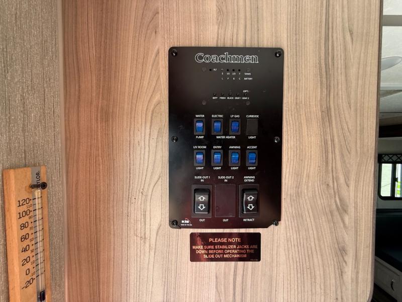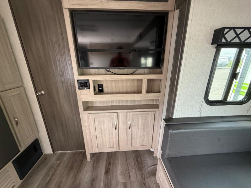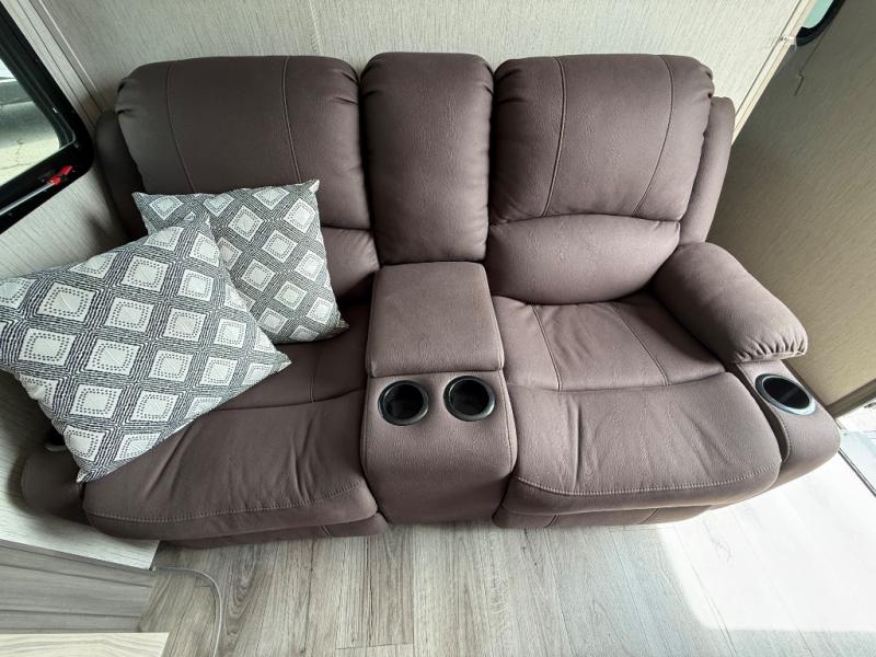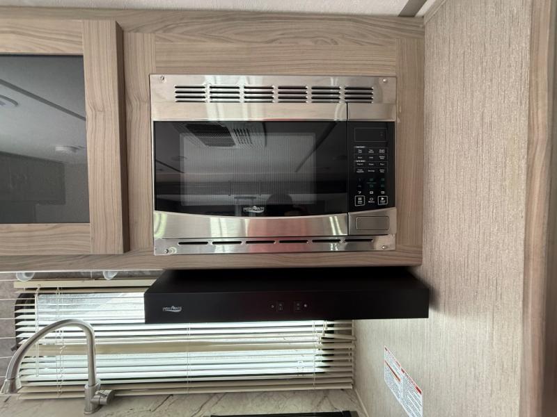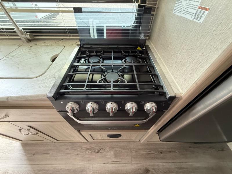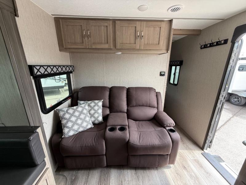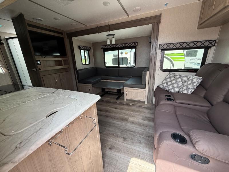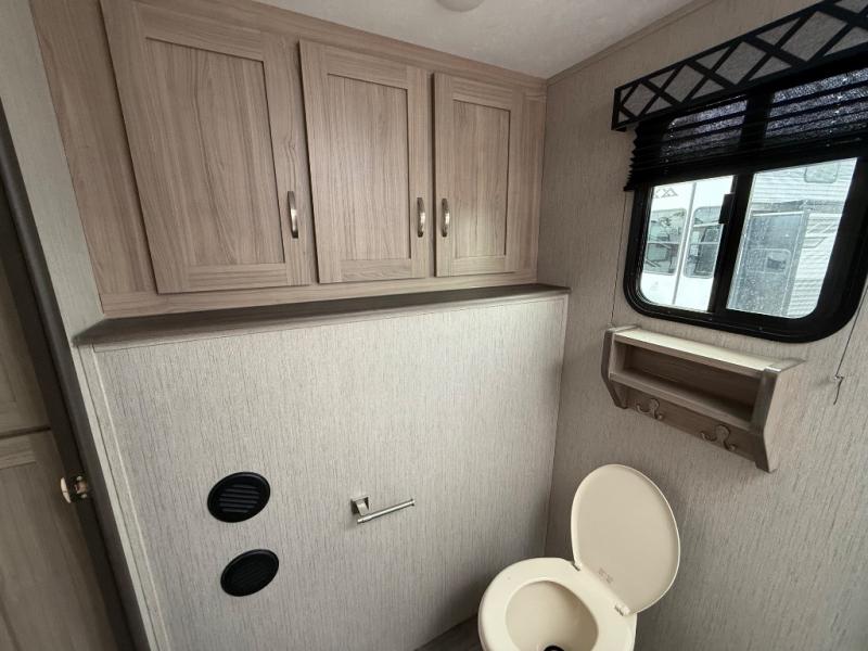 This Freedom Express Ultra Lite travel trailer allows you to relax like you do at home with more interior space thanks to the slide out in the living area. You'll appreciate the front private bedroom with a queen bed and wardrobes for your clothes. The kids can make their beds either on the U-shaped dinette or the sofa once folded down for the night. This unit features a full rear bath with a 32" radius shower and a linen closet for towels. If you enjoy cooking outdoors, then imagine making dinner for everyone at the outdoor camp kitchen!