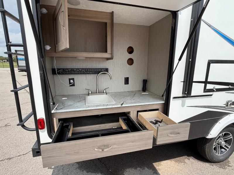 You will thoroughly enjoy the freedom that comes with the Coachmen Freedom Express Ultra Lite travel trailer! Whether it's a quick trip to your favorite backwoods campsite or a longer excursion to uncharted territory, you'll find everything that you need to camp successfully with the Freedom Express Ultra Lite. There is a Tufflex PVC roofing, a front diamond plate, E-Z lube axles, and a pet leash/bottle opener. These trailers have been prepped for a back-up camera, and they are ready for solar power. The TV and radio antenna has also been prepped for Wi-Fi and 4G, and the exterior shower is going to come in handy when you need to rinse off your outdoor toys.