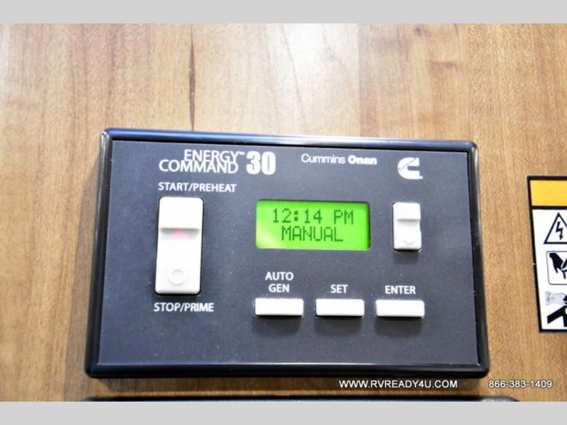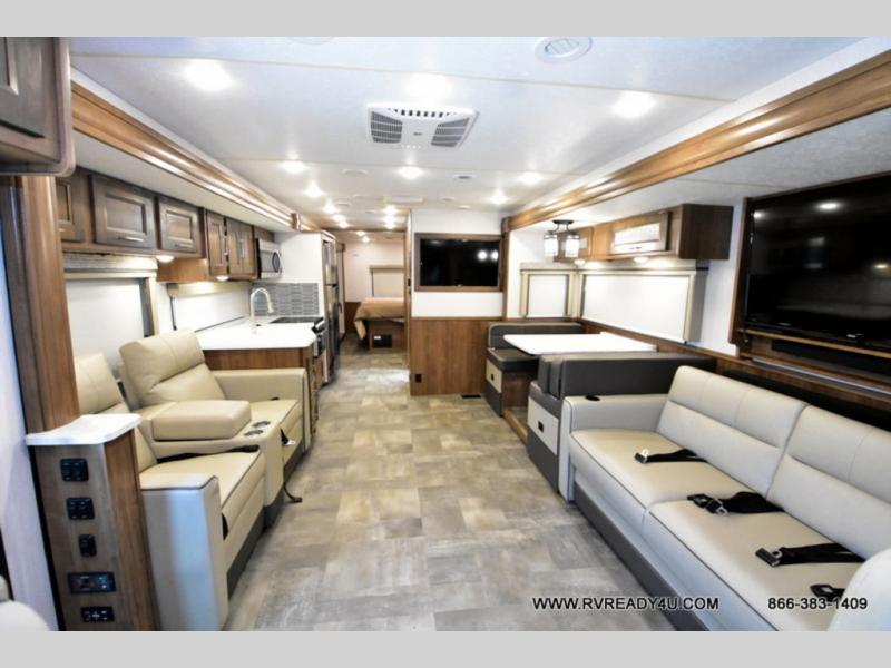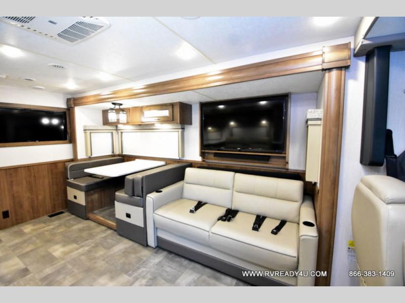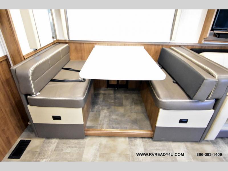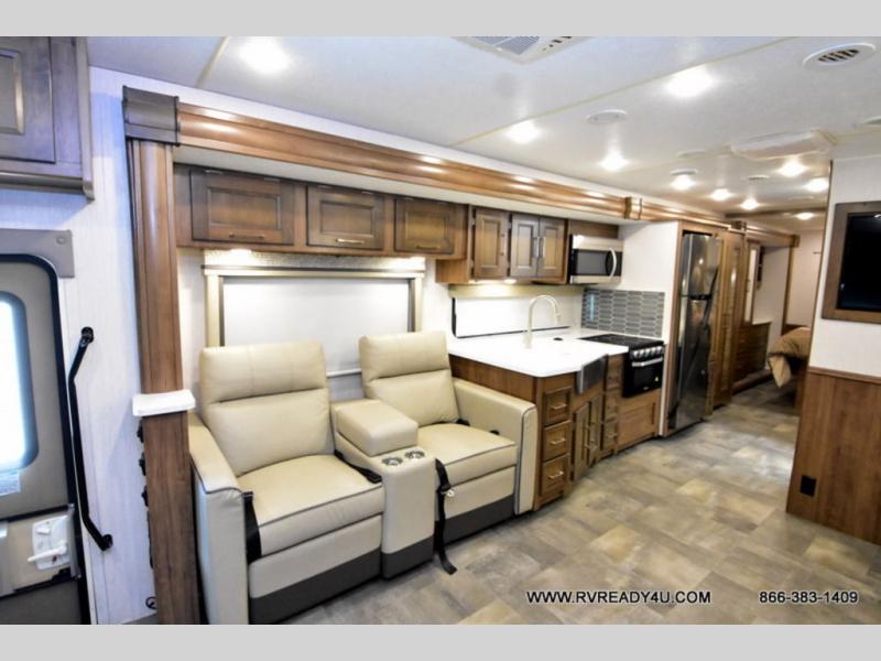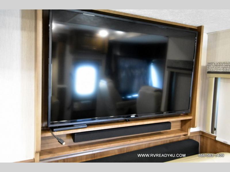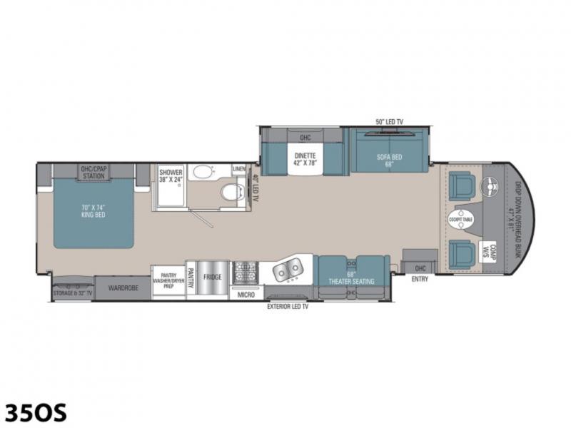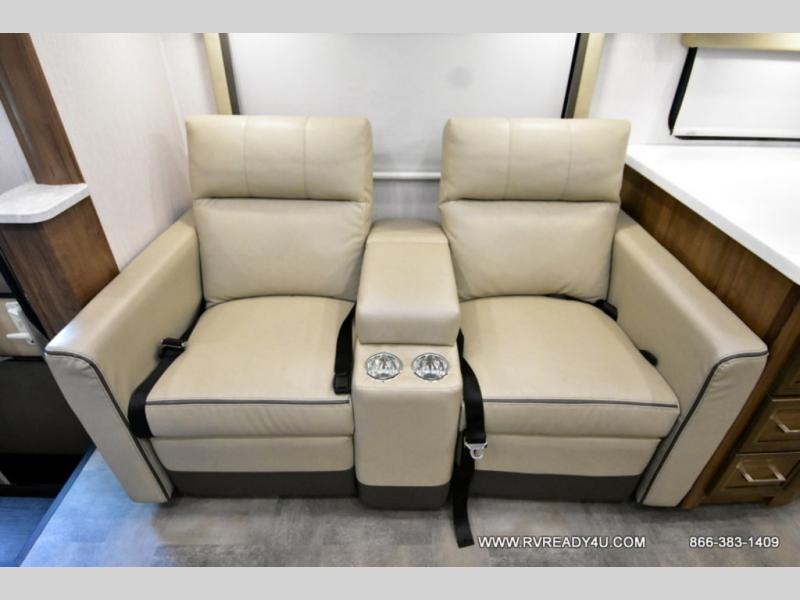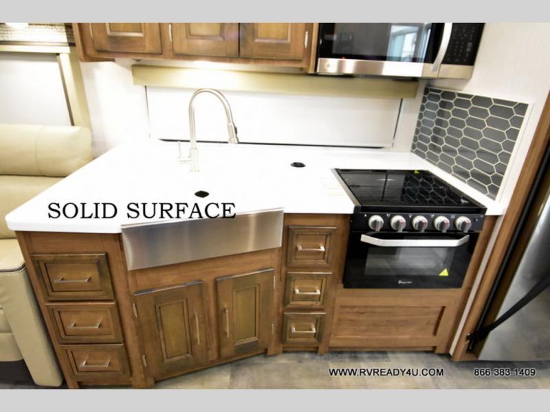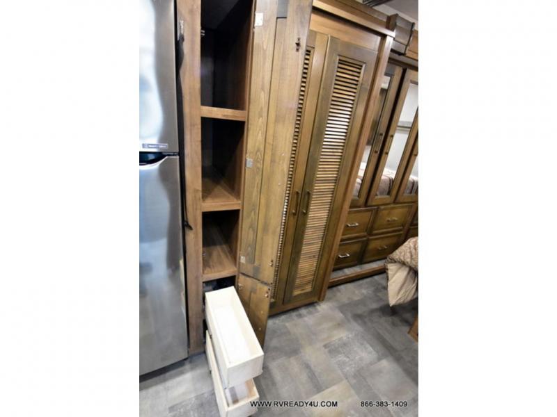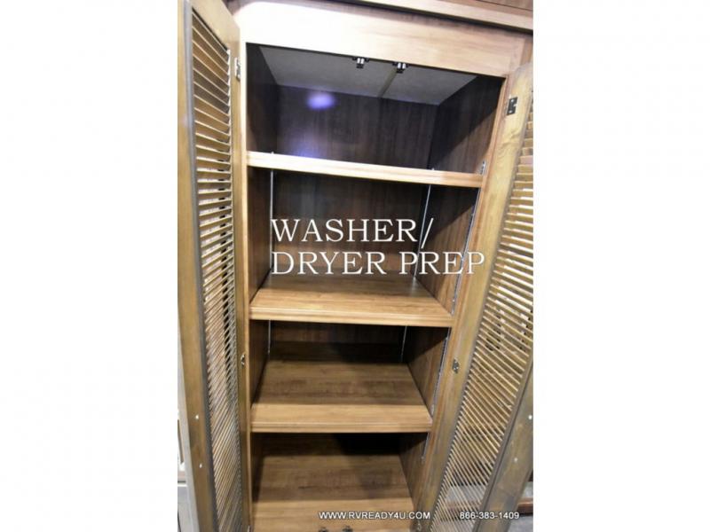 Choose to travel with your spouse and family in this coach because you will have lots of floor space inside thanks to the full wall slide plus the second slide in the main living/kitchen area. You can stretch out your legs on the sofa bed, the booth dinette as well as on the theater seats and the recline/swivel pilot seats. You might even choose the power theater seating option if you like. The cook will love the farm sink, the solid surface countertops and the stainless steel appliances to make meals for everyone. There is another option, add a washer/dryer to the prepped space if you prefer your clothing to be clean the whole trip. And your bedroom will have a walk-around king bed to sleep comfortably at night, and you will find plenty of storage for all your clothing and such.