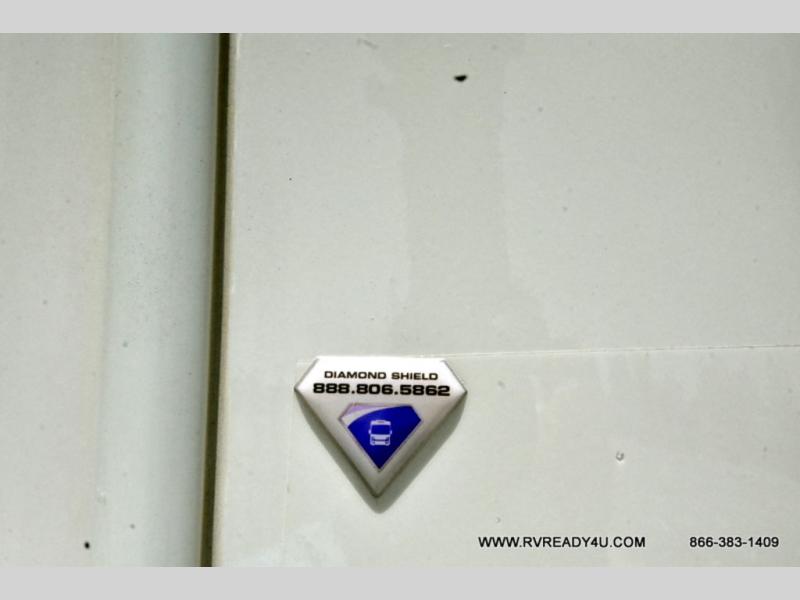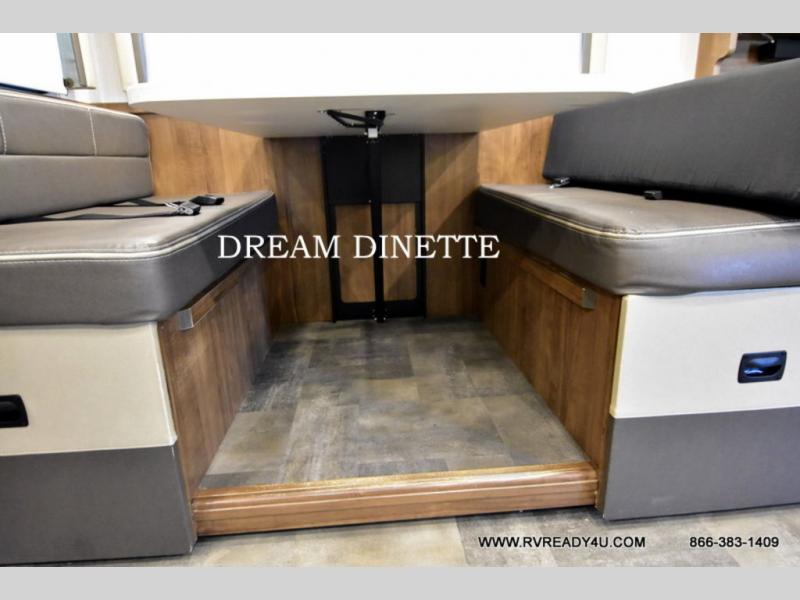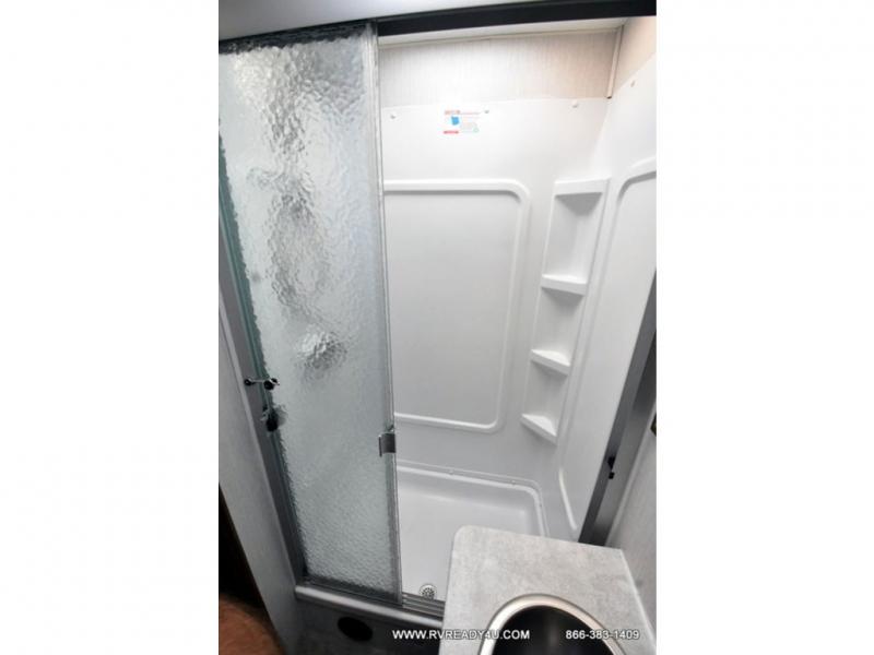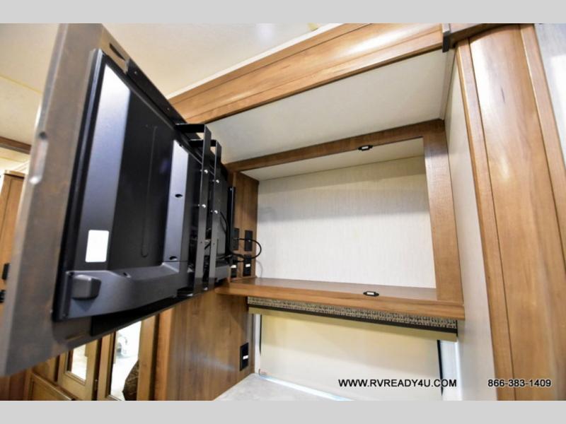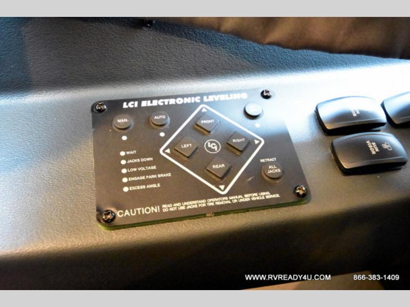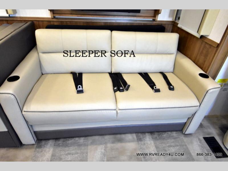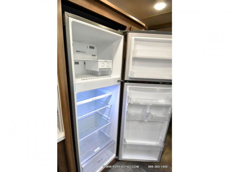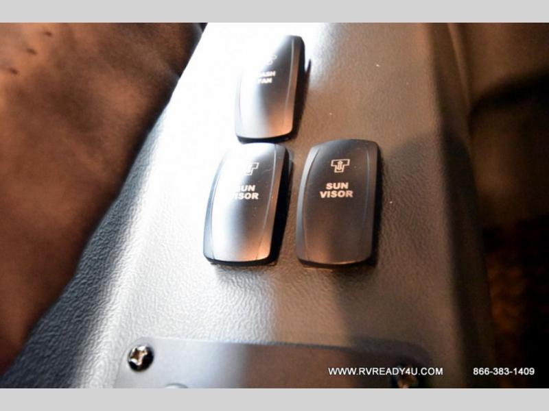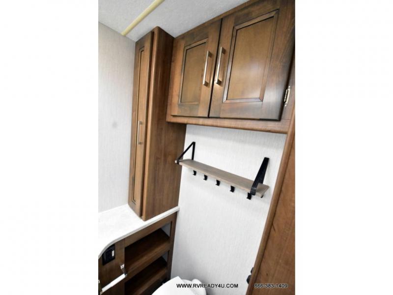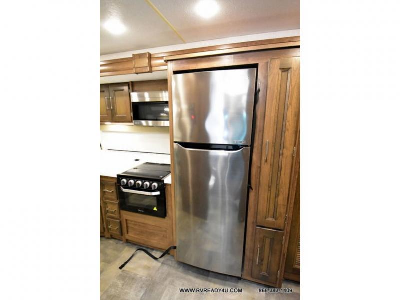 Choose to travel with your spouse and family in this coach because you will have lots of floor space inside thanks to the full wall slide plus the second slide in the main living/kitchen area. You can stretch out your legs on the sofa bed, the booth dinette as well as on the theater seats and the recline/swivel pilot seats. You might even choose the power theater seating option if you like. The cook will love the farm sink, the solid surface countertops and the stainless steel appliances to make meals for everyone. There is another option, add a washer/dryer to the prepped space if you prefer your clothing to be clean the whole trip. And your bedroom will have a walk-around king bed to sleep comfortably at night, and you will find plenty of storage for all your clothing and such.