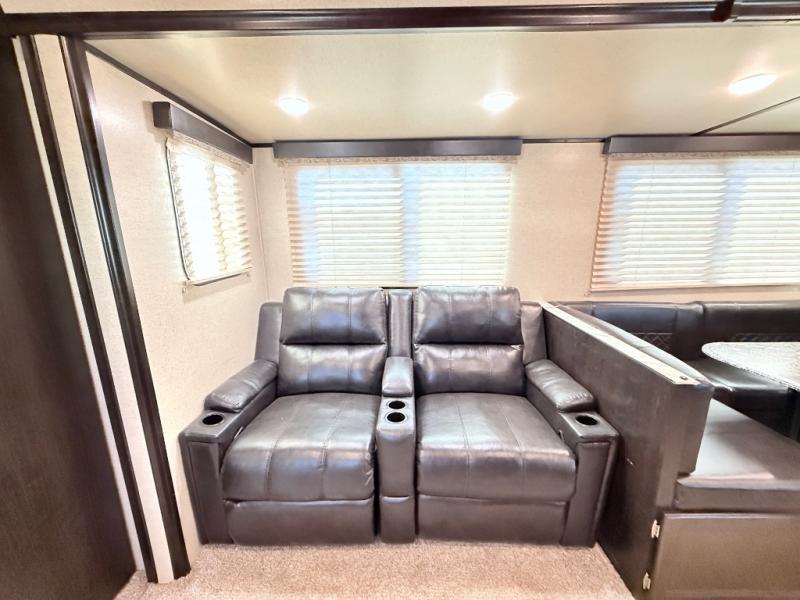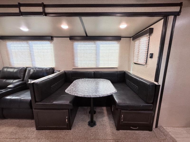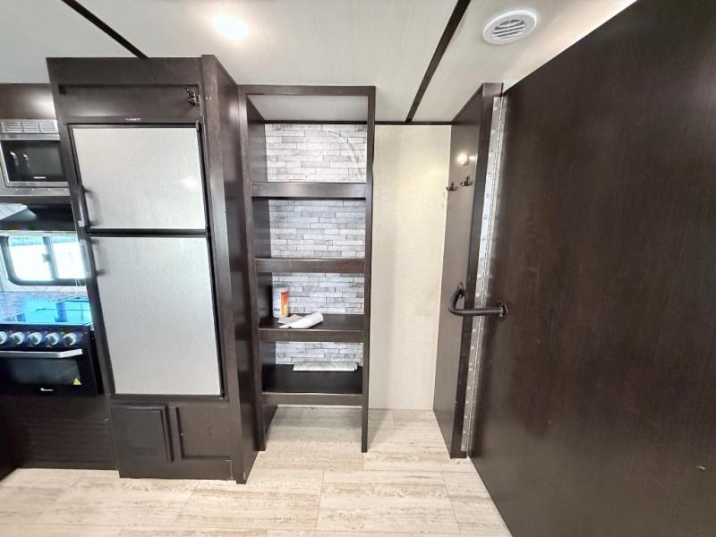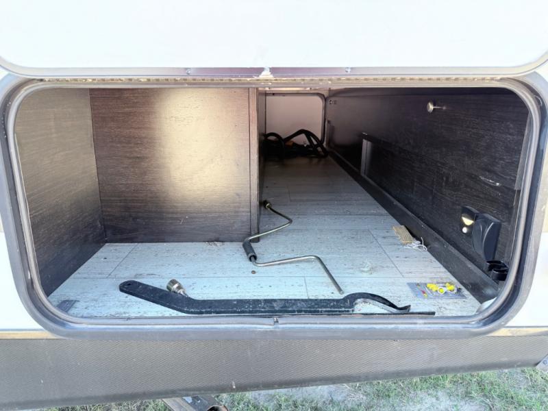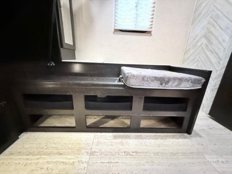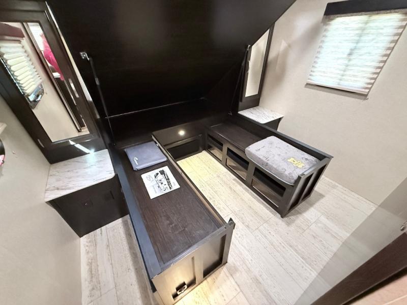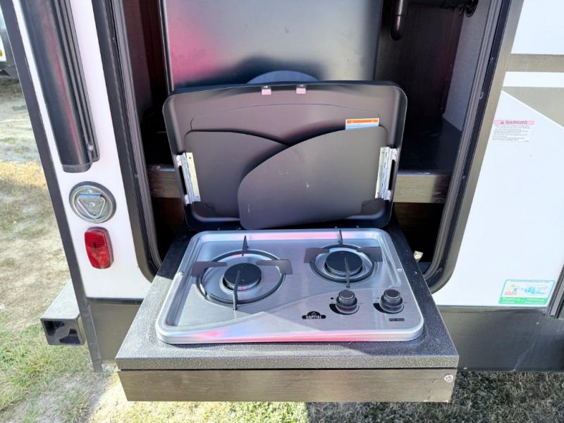 This Northern Spirit Ultra Lite travel trailer has an abundance of convenient features hidden all throughout its design, like the laundry center in the private bedroom, the pet center plus at the U-shaped dinette, the hidden closet and pantry behind the hinged entertainment center, and the flip-up countertop extension in the kitchen. Another feature that is especially handy during the summertime is the outdoor kitchen which will allow you to grill burgers outside with the neighbors or the playing kids.
