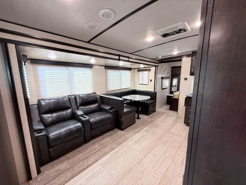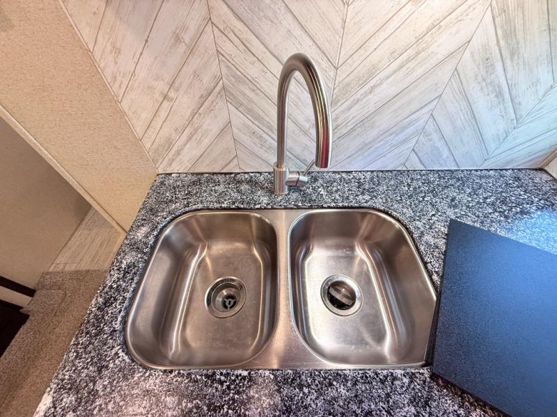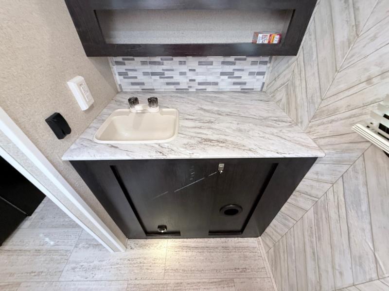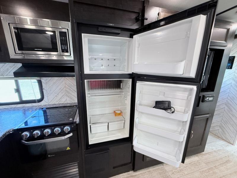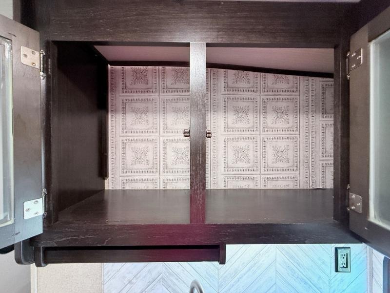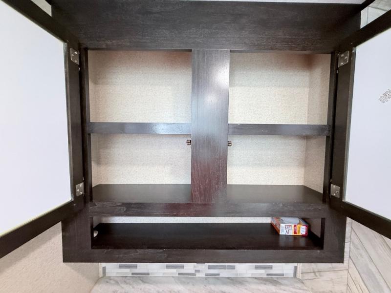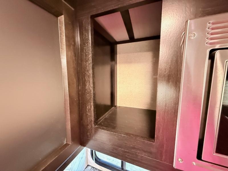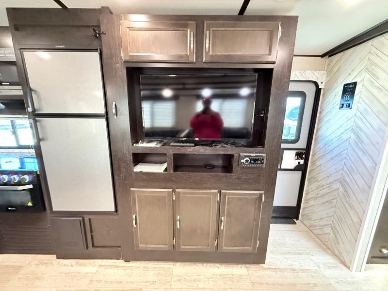 This Northern Spirit Ultra Lite travel trailer has an abundance of convenient features hidden all throughout its design, like the laundry center in the private bedroom, the pet center plus at the U-shaped dinette, the hidden closet and pantry behind the hinged entertainment center, and the flip-up countertop extension in the kitchen. Another feature that is especially handy during the summertime is the outdoor kitchen which will allow you to grill burgers outside with the neighbors or the playing kids.