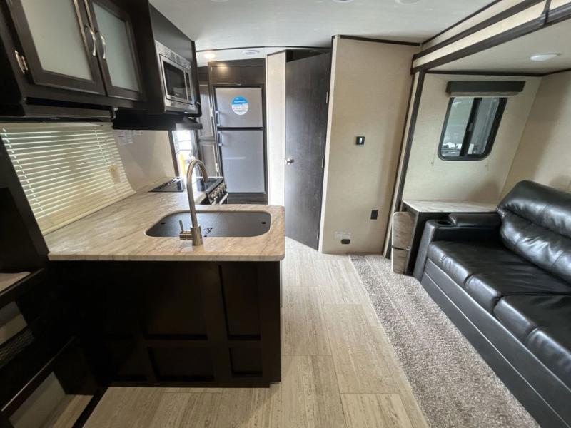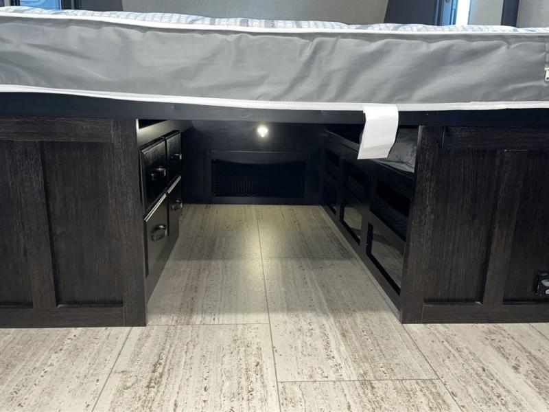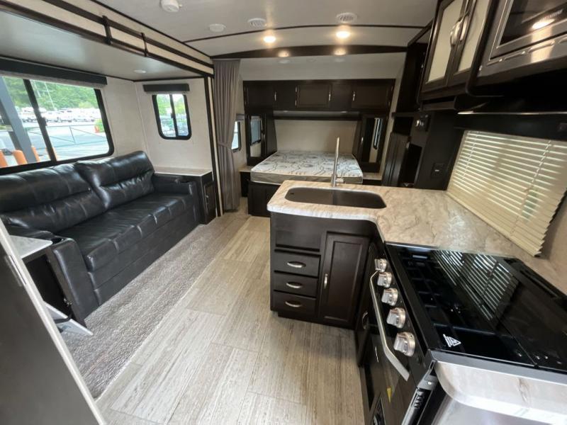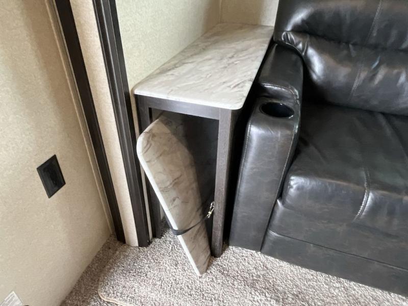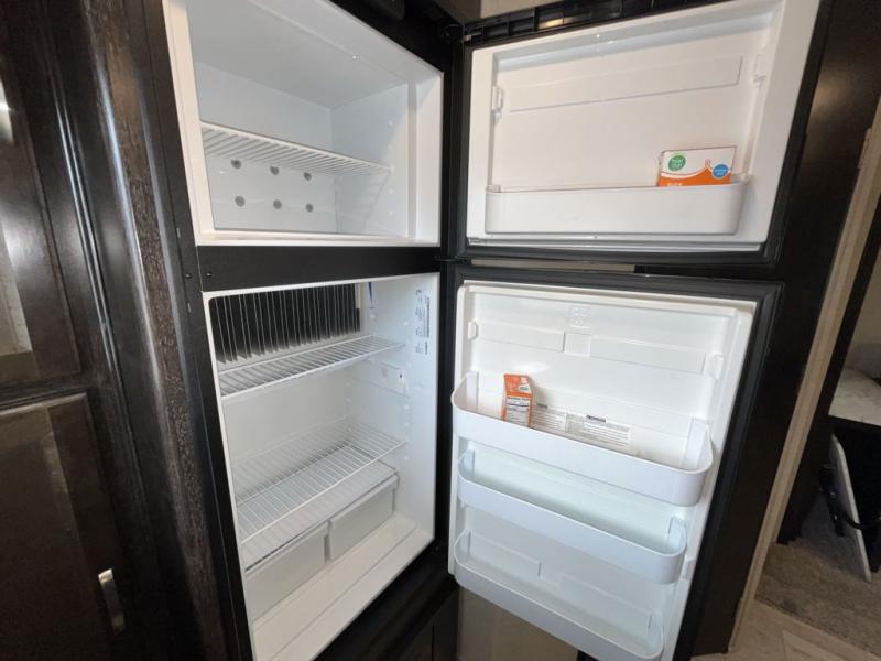 Step inside and appreciate the welcoming layout that makes efficient use of every square inch. The main living area features a comfortable dinette and seating that’s perfect for meals, game nights, or relaxing after a day of exploring. Natural light pours in through large windows, brightening the space and offering scenic views of your campsite.