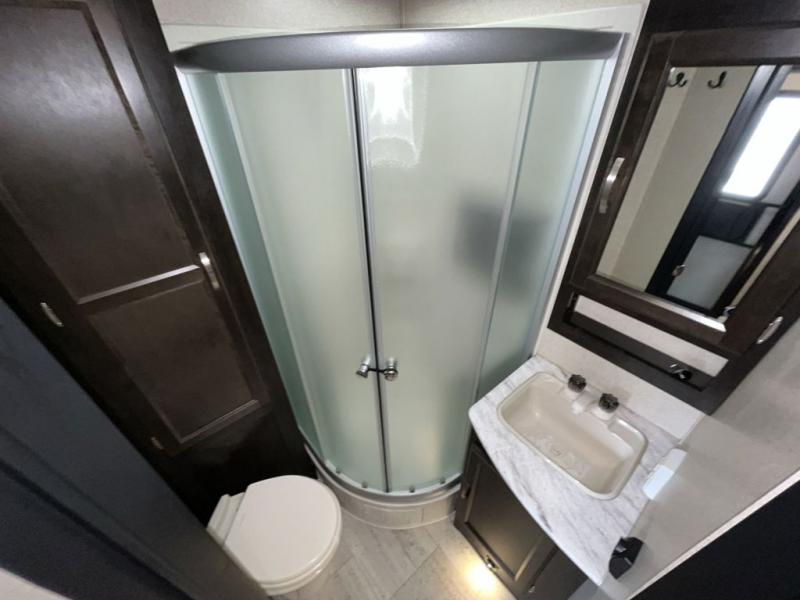 Indoor shower, toilet, and vanity make daily routines easier wherever you camp.