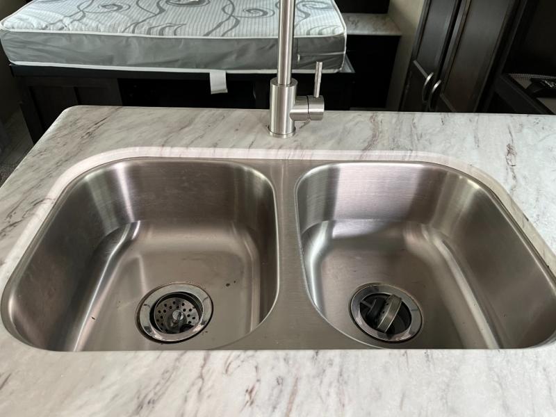 The kitchen is practical and functional, with a cooktop, microwave, refrigerator, sink, and plenty of cabinet storage. Meal preparation becomes simple and enjoyable, whether you’re fixing quick breakfasts or cooking hearty dinners for family and friends. Easy-to-reach storage ensures your cookware and essentials stay organized throughout your journey.