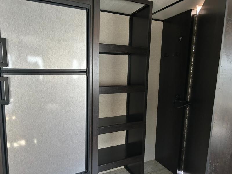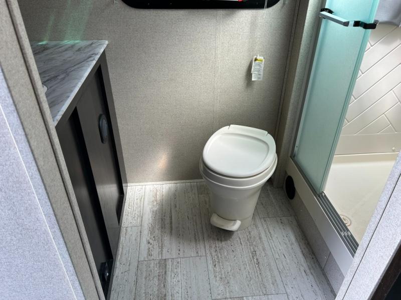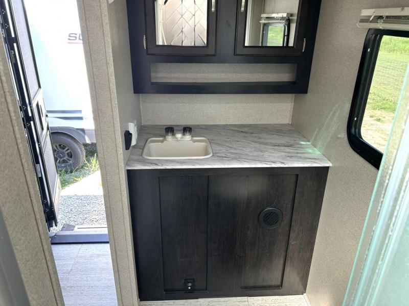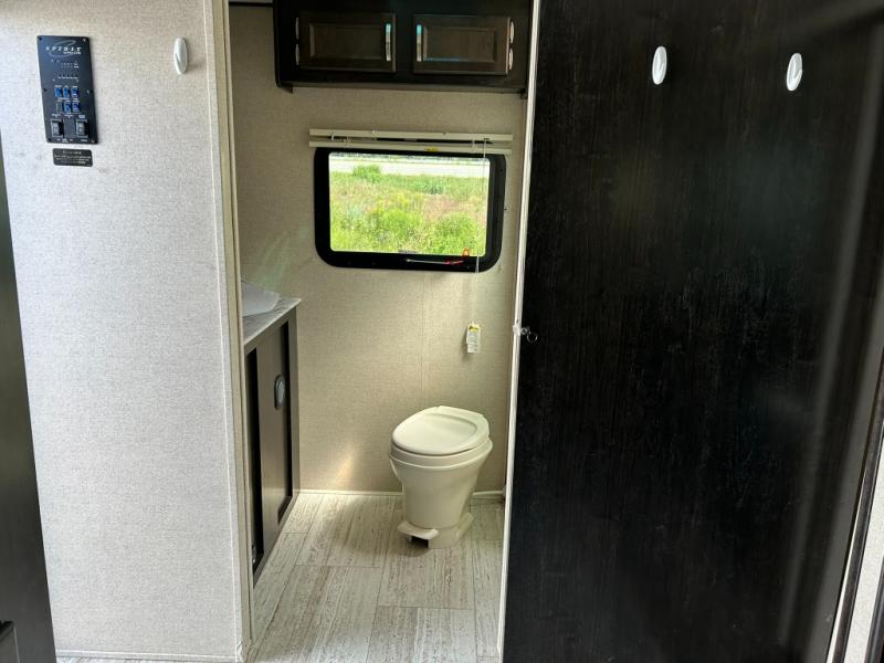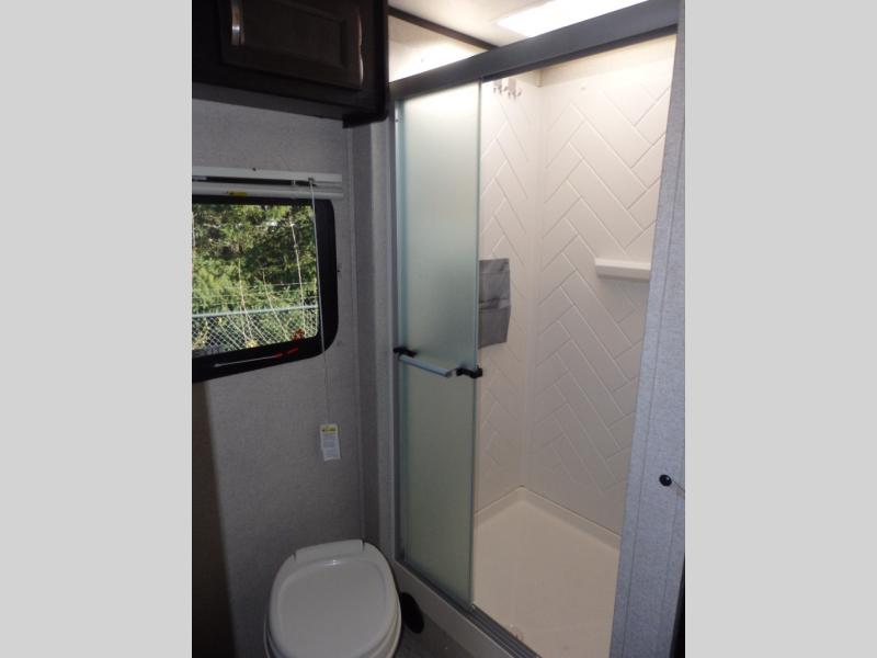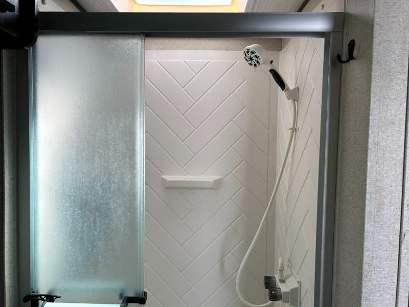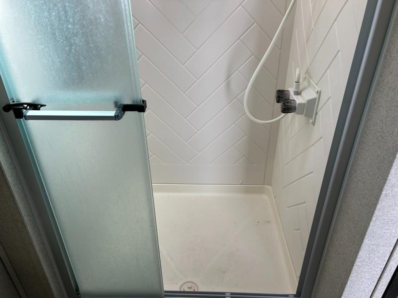 Enjoy a residential-style full rear bathroom with a large shower, vanity, and storage—perfect for relaxing after a day outdoors. -
