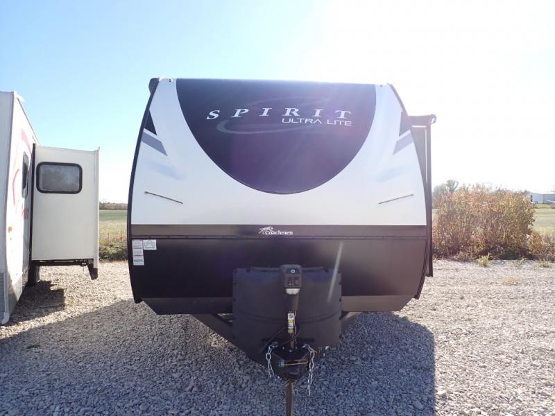 With any Coachmen Spirit Ultra Lite travel trailer, you can simplify your camping without missing any features you would want in your RV! Enjoy years of use during any season with the heated and enclosed underbelly, and feel secure in the lightweight construction of the laminated, aluminum-framed floor and sidewalls, the Azdel composite panels, the Tufflex PVC roof membrane, and the 5" trusses with interior vault. Some other exterior features you will appreciate include the motion-activated light in the pass-through storage, the fishing pole storage, and the dog leash clip. The interior offers lighted USB ports to keep the electronics charged, an AM/FM Bluetooth stereo to listen to tunes, a laundry center to keep everything tidy, and many more storage solutions giving you more relaxation and fun adventures!