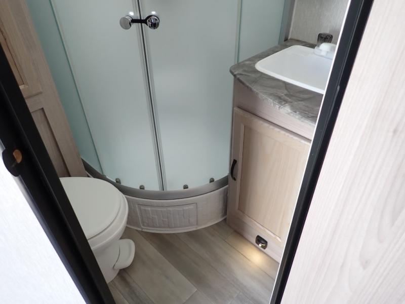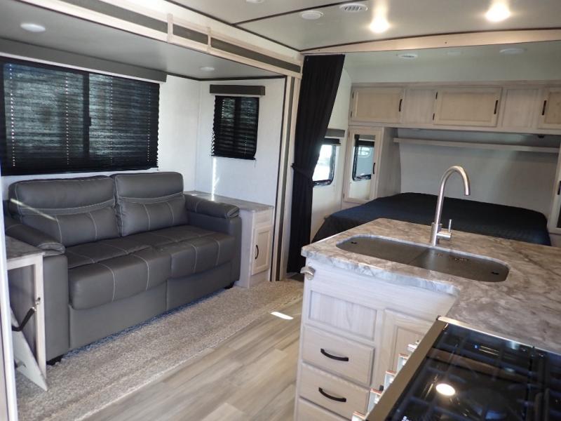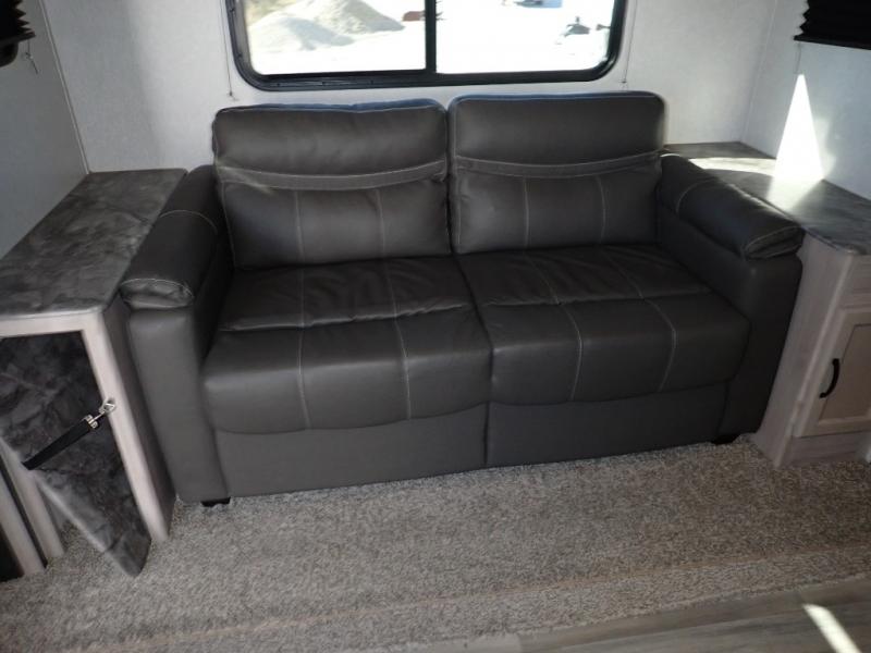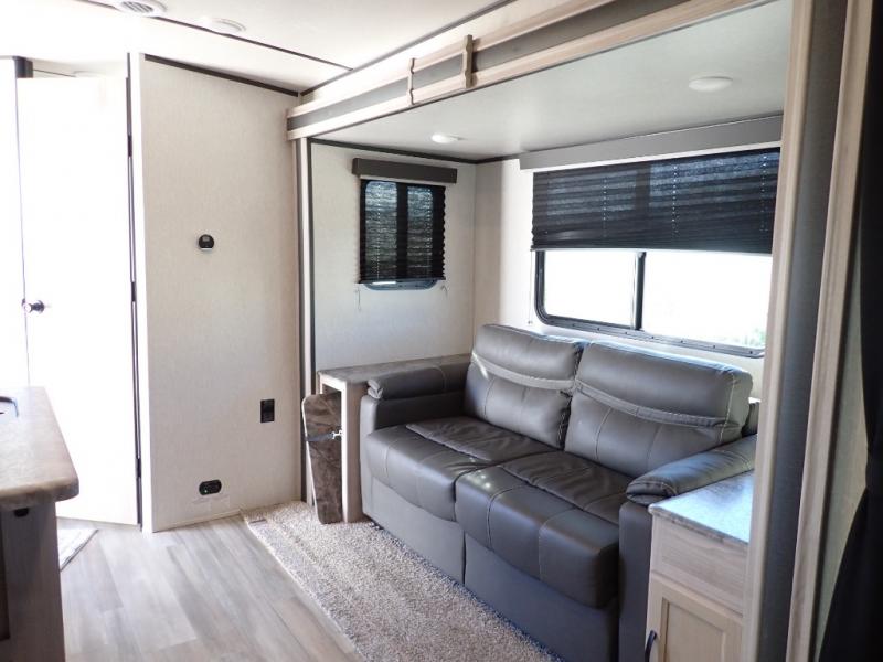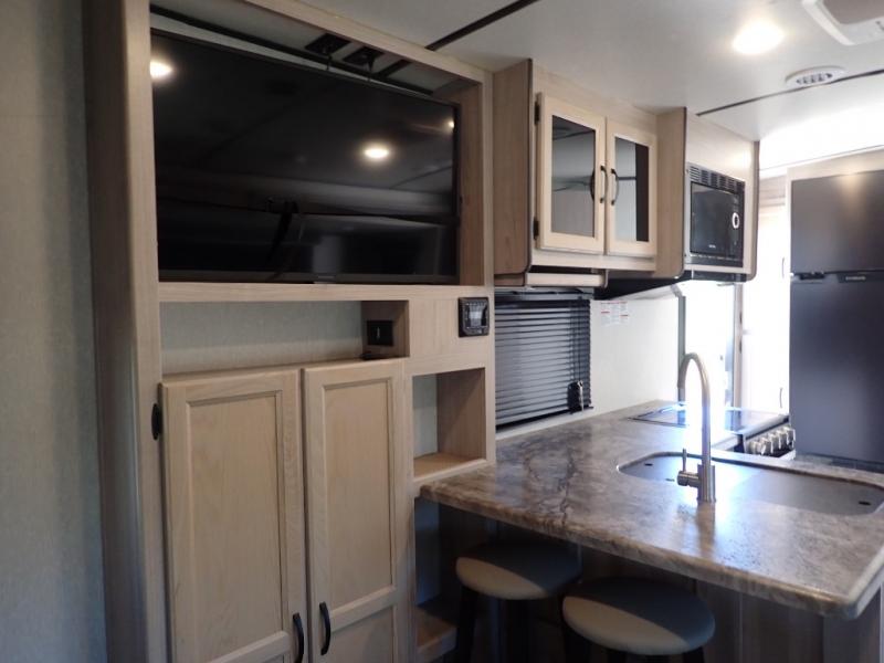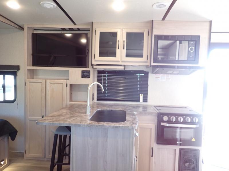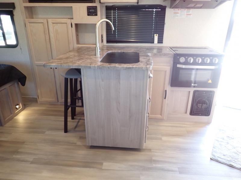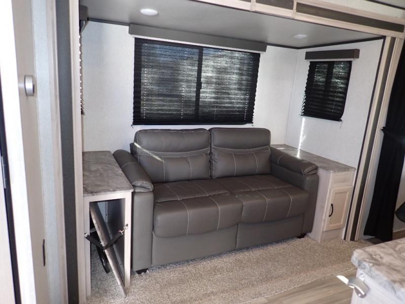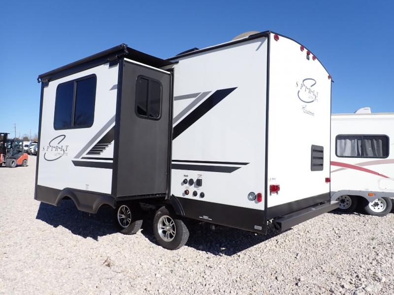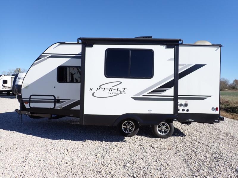 This perfect couple's Spirit Ultra Lite travel trailer offers a spacious interior with a slide out and everything you need to eat, sleep, and relax in comfort! The full kitchen with its three-burner range top and microwave will be extremely helpful each morning as you prepare a batch of pancakes and a pan of bacon. You will be grateful for the radius shower in the full bathroom so that you can easily get cleaned up and prepared for the day ahead. The sofa slide is convenient because it extends out which means that you have more interior living space, and the two end tables will be perfect for holding drinks and snacks as you sit and relax on the sofa.