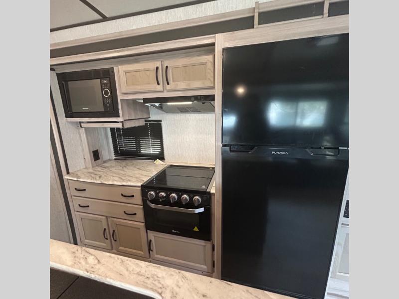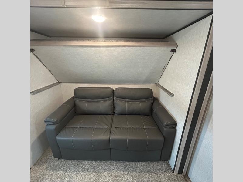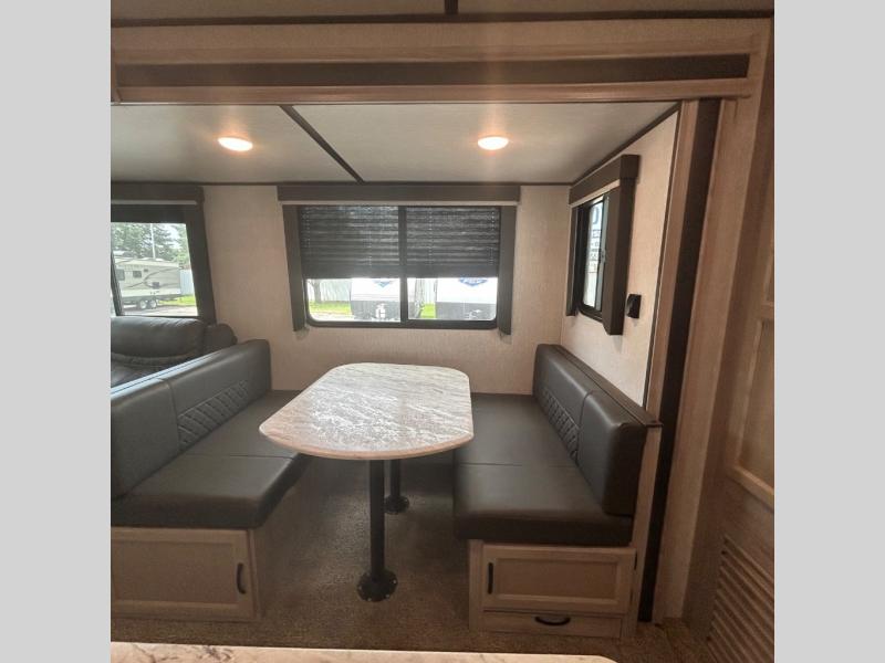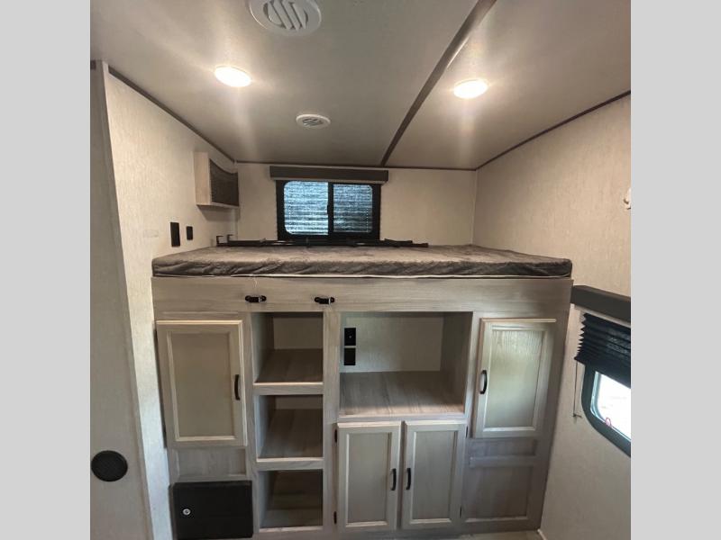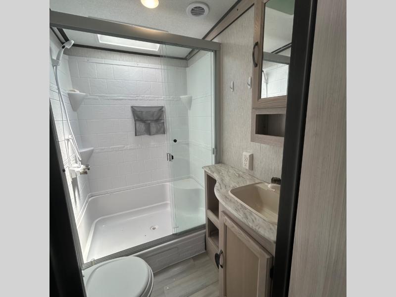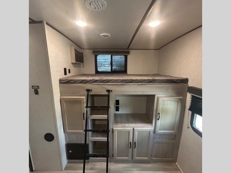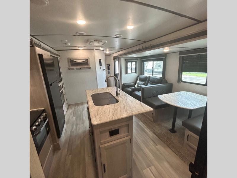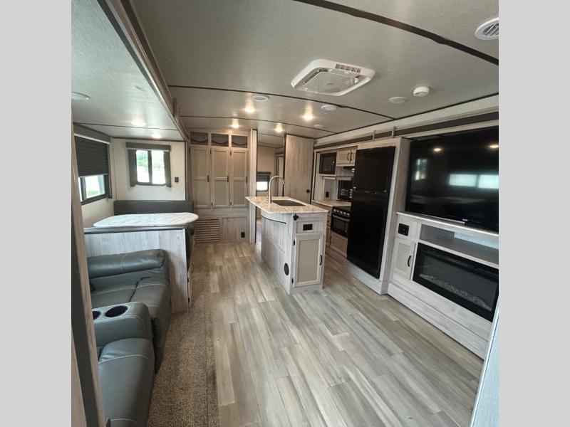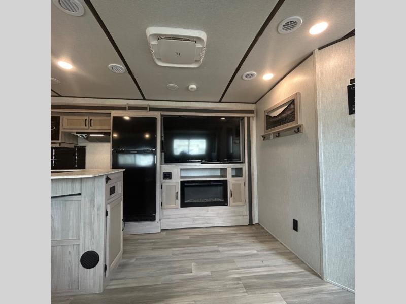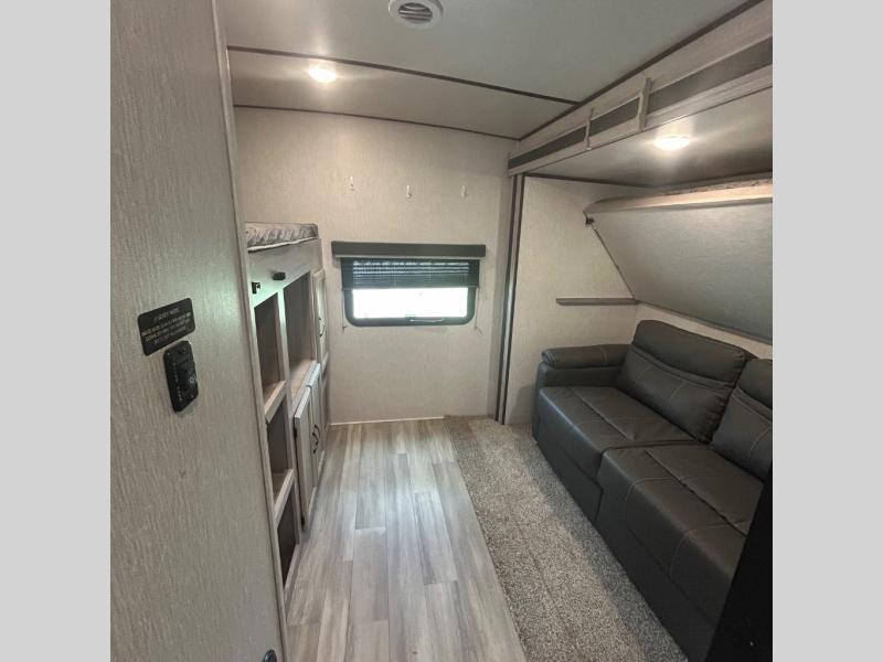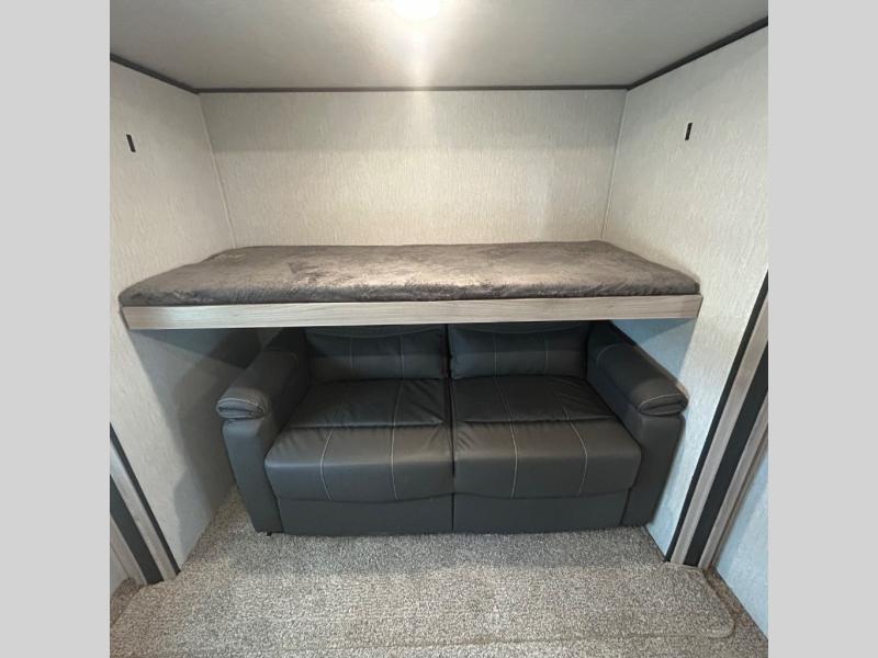 Your family might never want to go home after camping in this Spirit Ultra Lite travel trailer! With its rear private bunkhouse and front private bedroom, you will have the perfect trailer for fun with extra sleeping space for guests, and the three slides give you extra floor space so that no one feels crowded. You will love having a shower with seat in the full bathroom after a long hike or run. The fireplace will keep you cozy when traveling in cooler temperatures, and the air conditioner is nice in the summer. The kids can play and sleep in the bunkhouse that has two bunks and a tri-fold sofa. Making your famous meals is easy in the full kitchen, and you can make a few meals on the outside camp kitchen.