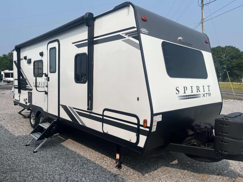 Each Spirit XTR travel trailer by Coachmen is constructed with a laminated, aluminum framed floor, sidewalls and rear wall, plus Azdel composite panels in place of Luaun plywood, and a Tufflex PVC roof membrane to provide a lightweight, sturdy and easy to tow trailer by a smaller tow vehicle. The interior includes lumber core cabinets stiles, mortis and tenon cabinet doors, and seamless thermo foil wrapped countertops for easy care. You will also find the MAX BED storage feature which offers a walk-through area under the bed with drawers, extra storage for pillows, blankets and shoes, plus a padded seat allowing you to easily put on your shoes each morning. A few more features you are sure to appreciate include a wireless phone charger, motion activated floor lights, a battery disconnect switch and a digital level. Make your selection today!