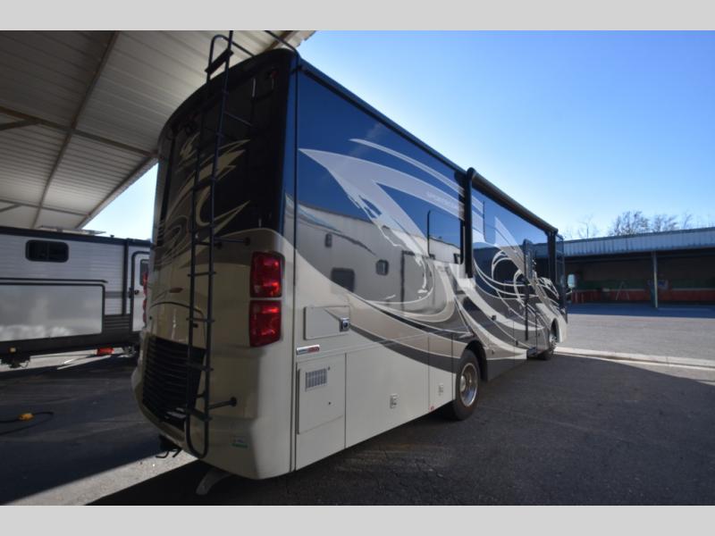 Plan to see the country in this comfortable motorhome that will feel just like home. The large slide out in the main living area will provide added interior space, and your crew will find seating space on the booth dinette or theater seating. This model includes a three burner cooktop with a glass cover, a residential refrigerator, plus two pantries for snacks and paper goods. You can be sure to get a great night's rest on the king bed slide out and you'll appreicate two wardrobes for all your clothes. You won't have to worry about missing out on your favorite shows because this model includes three TV's; a 40" TV above the dinette, a 32" TV in the bedroom, and an exterior TV!