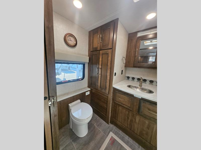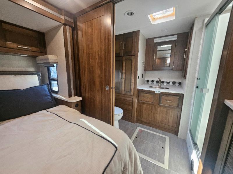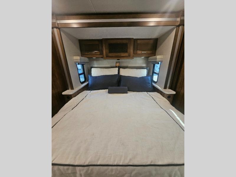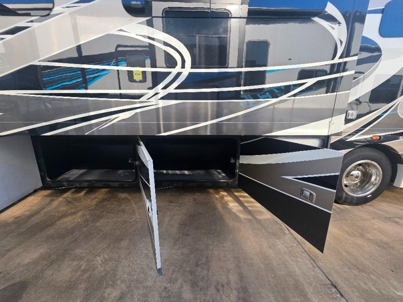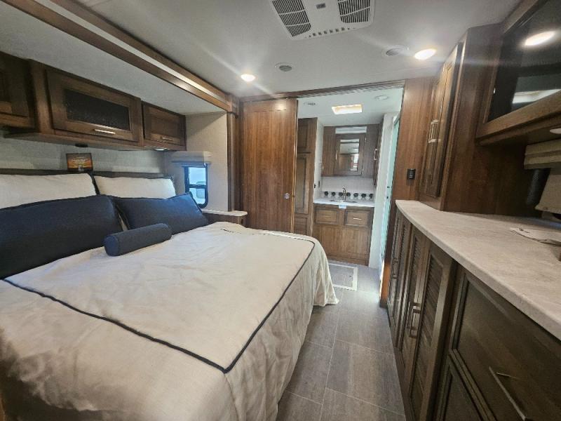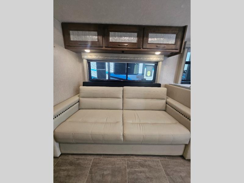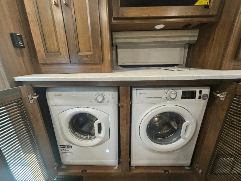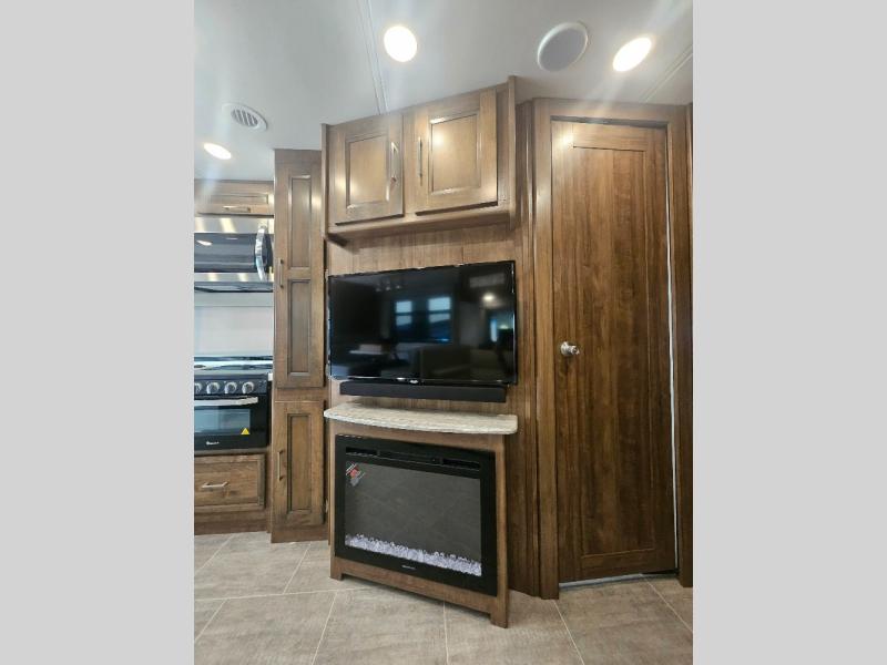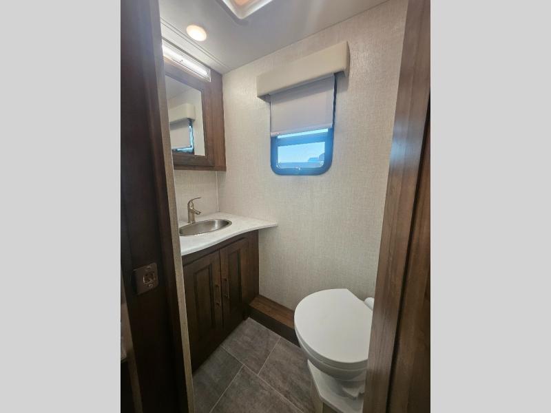 Comfortable and convenient are the adjectives you will be using when traveling in this coach. Imagine having a master suite with a king bed slid out and storage as well as a full bathroom with a closet including a hamper, linen storage, and a shower. You even have a half bath for your guests that might enjoy sleeping on the sofa bed, the dinette or the drop-down overhead bunk. You can enjoy your morning coffee at the cockpit table or the dinette, plus the power awning offers an outdoor living space. You can turn on the exterior TV if you like, or listen to sounds of nature while relaxing in your own camp chair.
