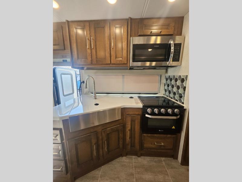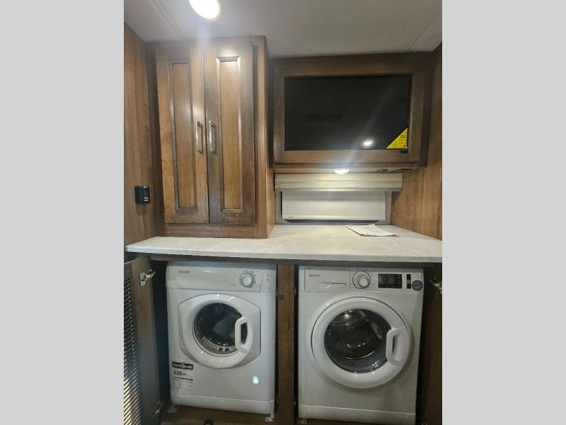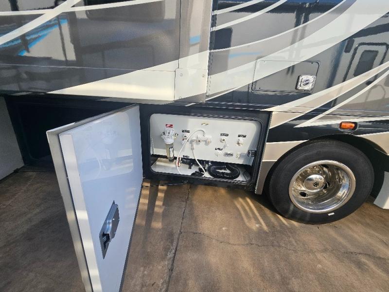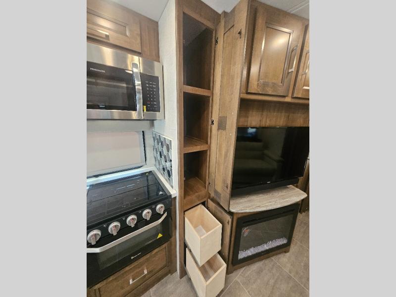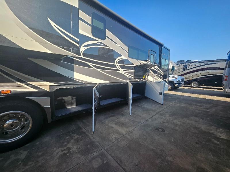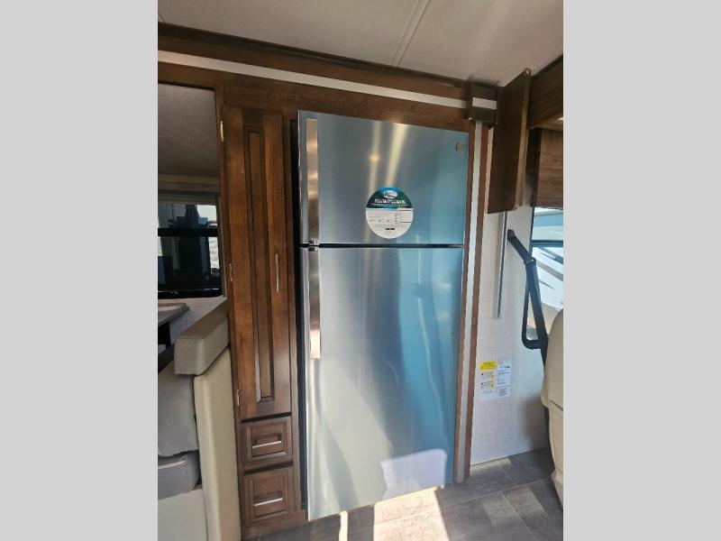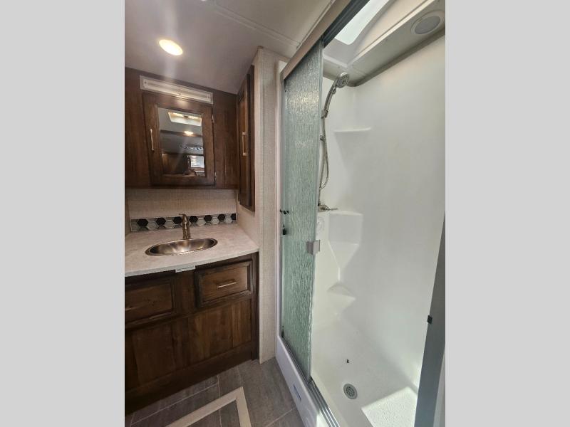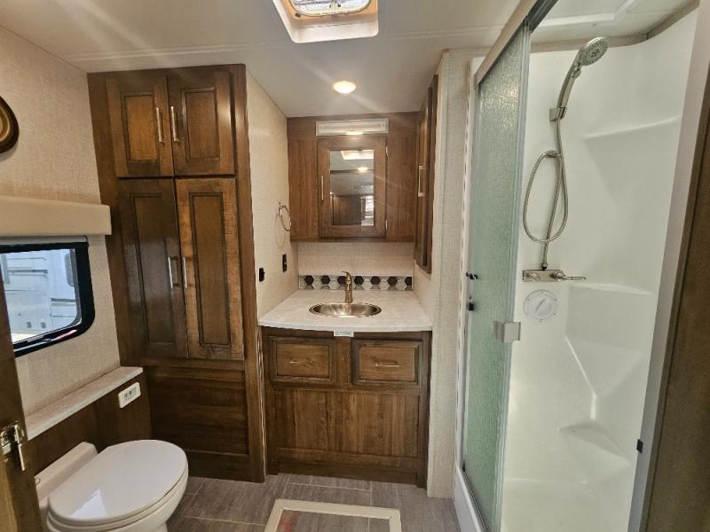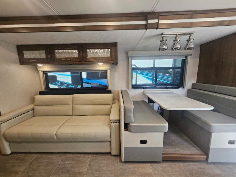Comfortable and convenient are the adjectives you will be using when traveling in this coach. Imagine having a master suite with a king bed slid out and storage as well as a full bathroom with a closet including a hamper, linen storage, and a shower. You even have a half bath for your guests that might enjoy sleeping on the sofa bed, the dinette or the drop-down overhead bunk. You can enjoy your morning coffee at the cockpit table or the dinette, plus the power awning offers an outdoor living space. You can turn on the exterior TV if you like, or listen to sounds of nature while relaxing in your own camp chair.