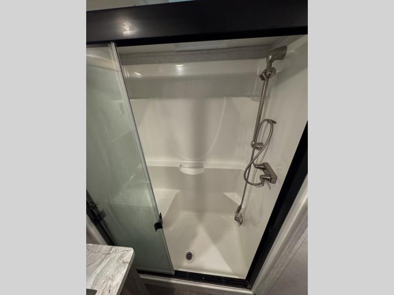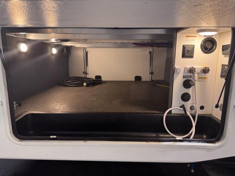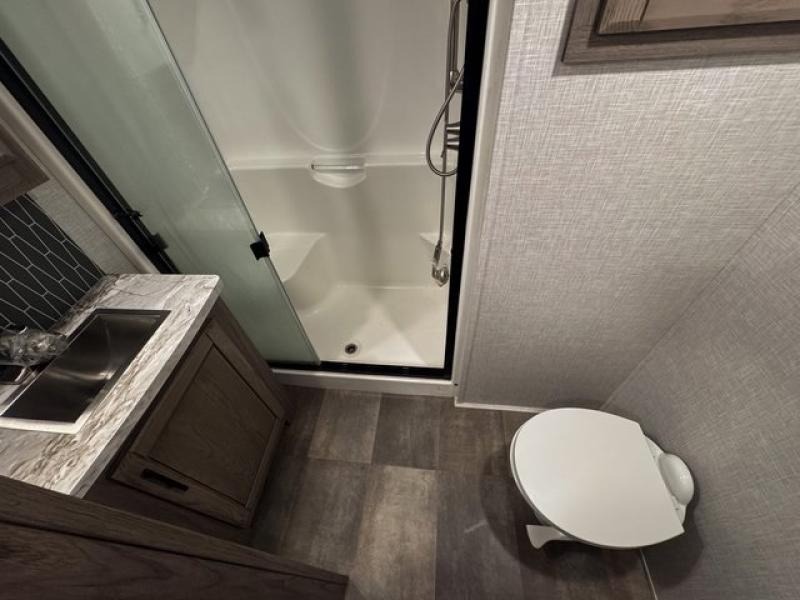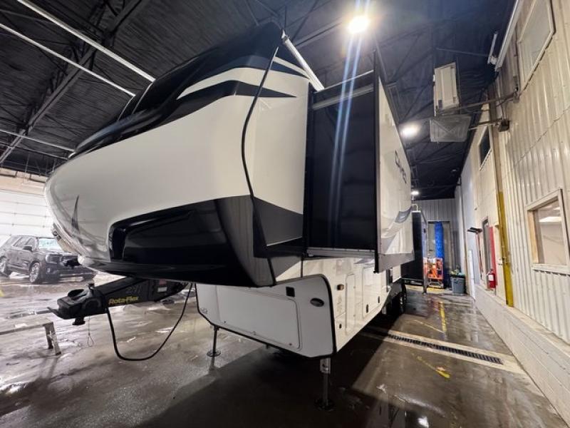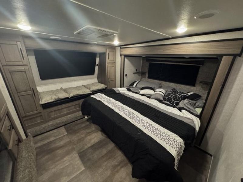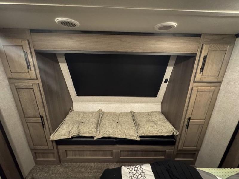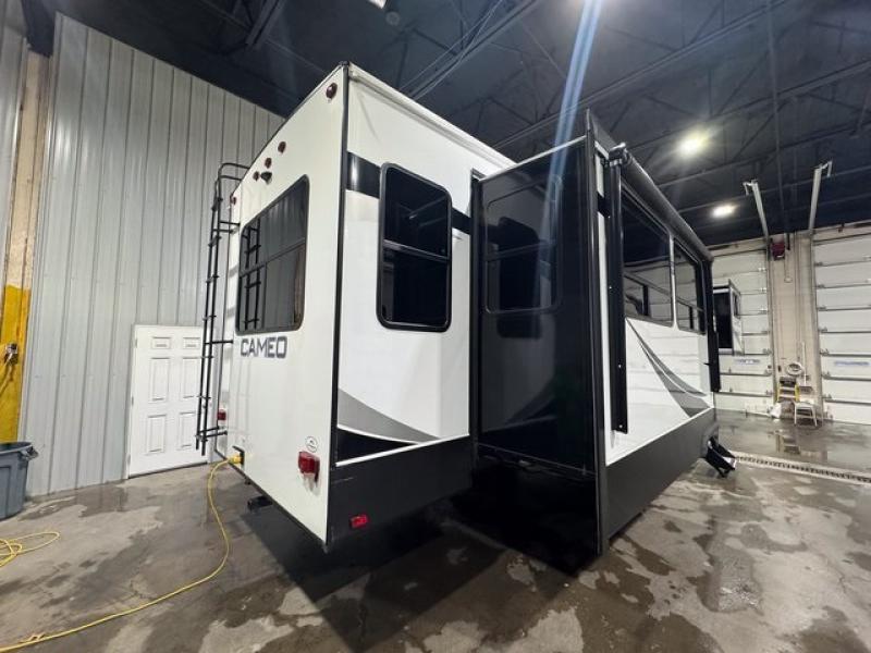 Step inside this Cameo fifth wheel and see just how much fun you will have on your next camping adventure! It features a front private bedroom that has a king-size bed, a bench seat up front, and a 39" LED HDTV for those nights when you just can't fall asleep. You will also enjoy how convenient it is to have the full bathroom just outside your bedroom door. It will be a breeze whipping up your best meals in this kitchen will full amenities, a center island, and a 21-cu. ft. residential refrigerator, especially if you grab your favorite beverage from the wine cooler first. You can enjoy each meal at the dinette table, as well as play card games there too, and if you're not one for games, then you can head to either the sofa or the power theater seating and watch a movie on the 50" LED HDTV. You might even like to add a washer/dryer option to the prepped space.
