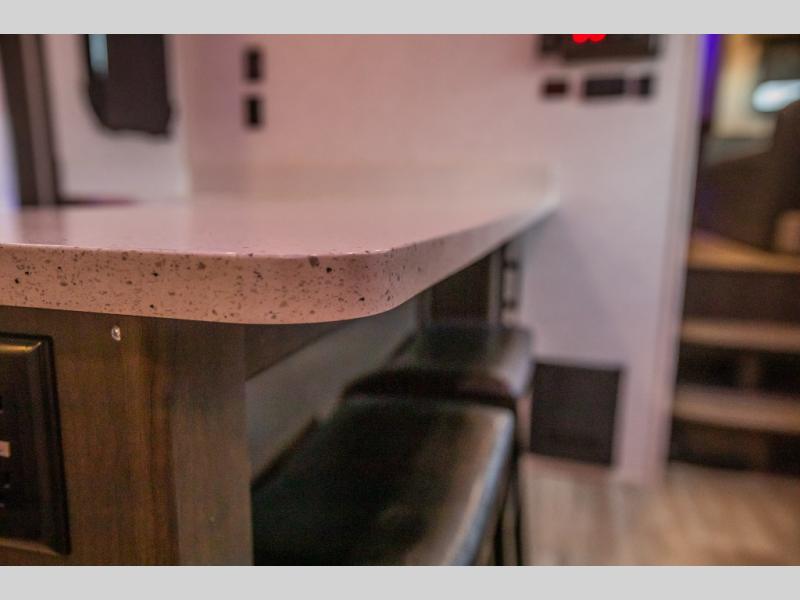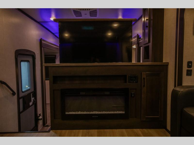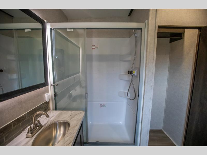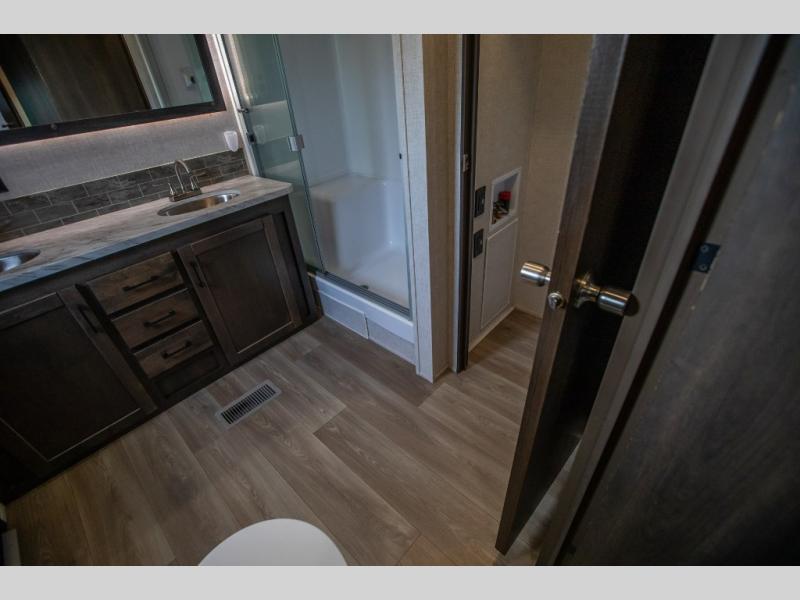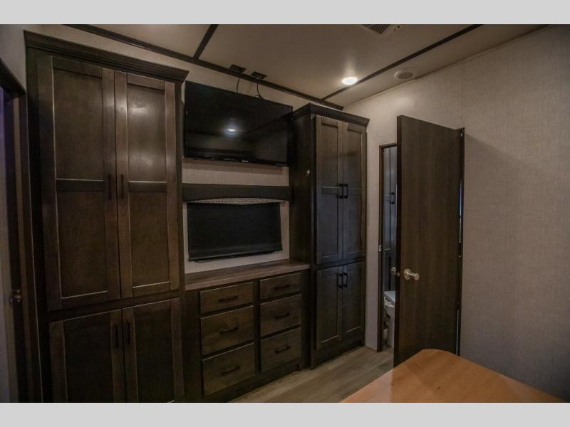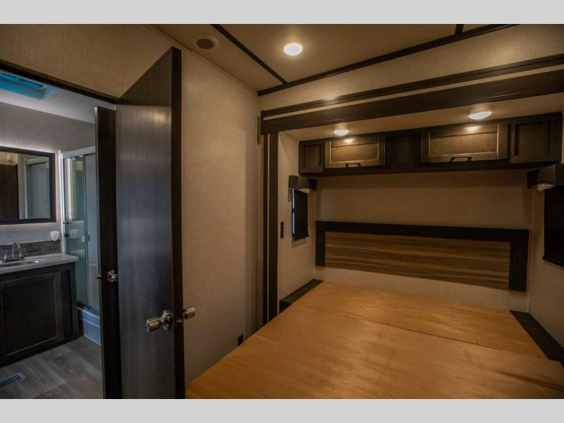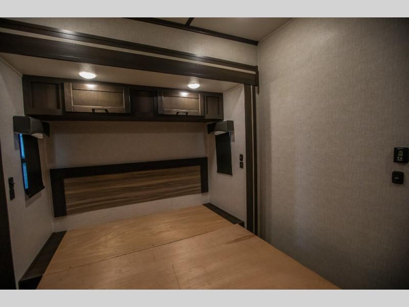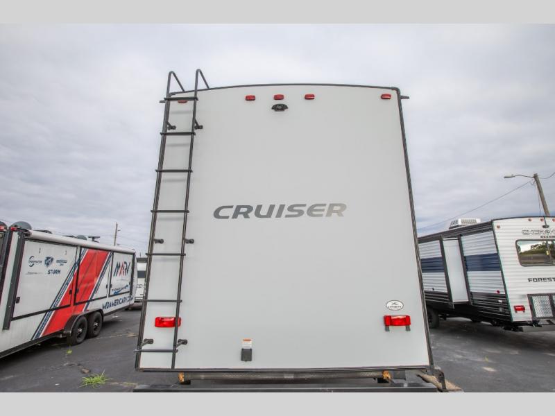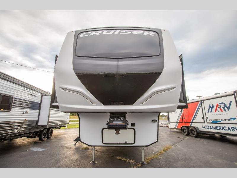 This stunning Cruiser fifth wheel is absolutely packed to the brim with amazing features that will enhance all of your road trips! You won't be at a loss for comfort within this model because the separate living room up front has everything needed for a great movie night, like two tri-fold sofa slides, theater seating, and an entertainment center with a 50" LED HDTV and fireplace. Another extremely comfortable location will be the master suite in the back of this model. The bedroom area has a king bed slide for more space, and the full bathroom that is attached to the bedroom has a dual-sink vanity, as well as the second exterior entry door into this unit. You will also be blown away by the great kitchen features, like the wine bar, hutch, and island peninsula.