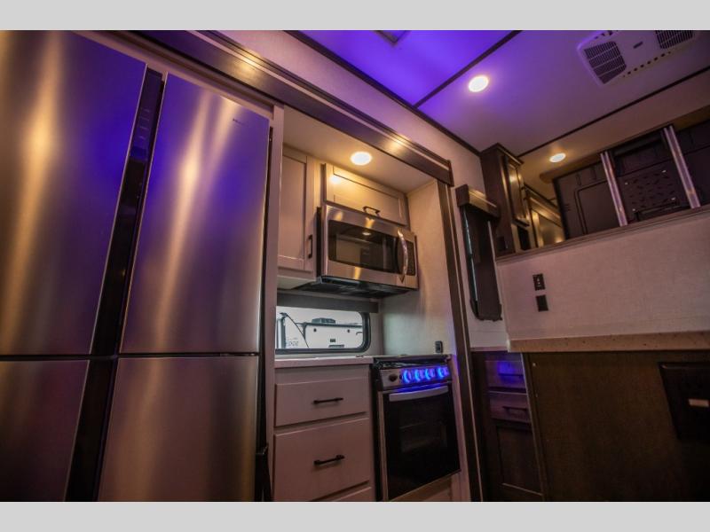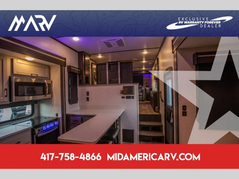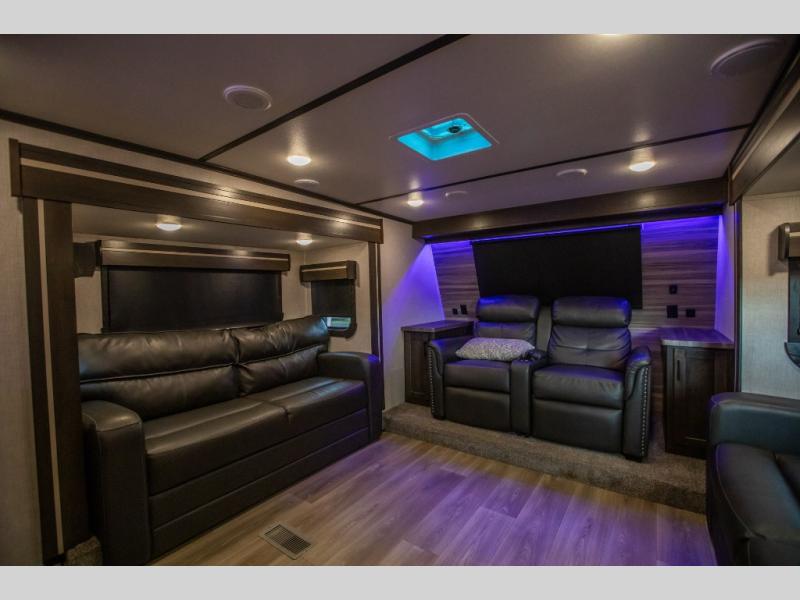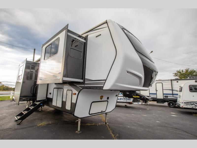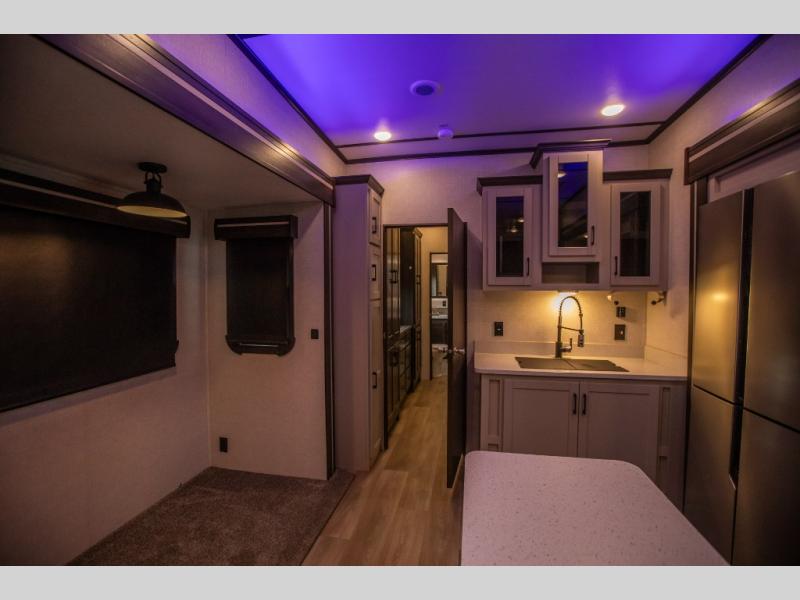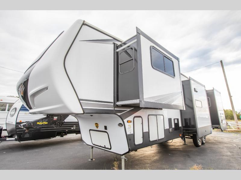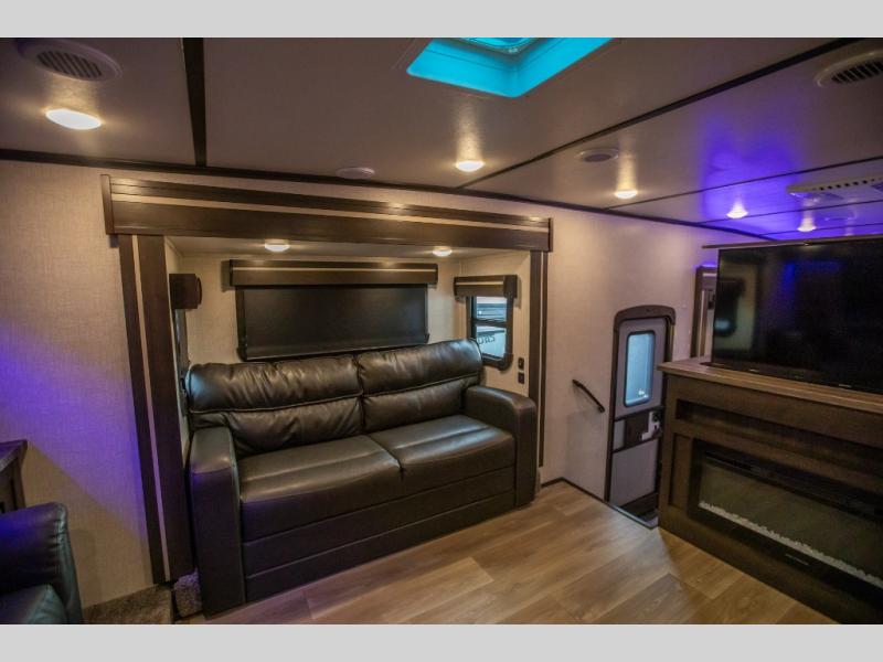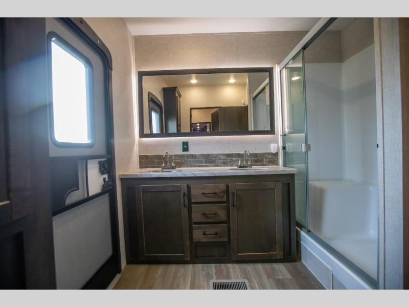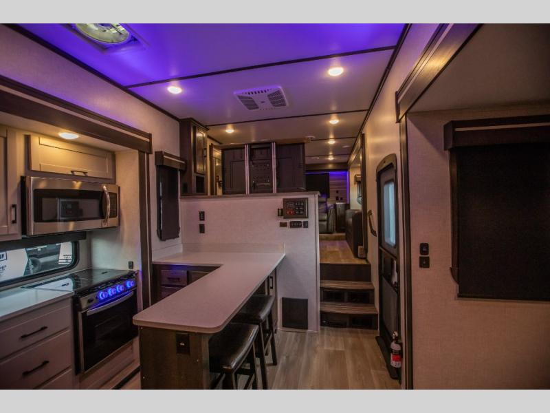 This stunning Cruiser fifth wheel is absolutely packed to the brim with amazing features that will enhance all of your road trips! You won't be at a loss for comfort within this model because the separate living room up front has everything needed for a great movie night, like two tri-fold sofa slides, theater seating, and an entertainment center with a 50" LED HDTV and fireplace. Another extremely comfortable location will be the master suite in the back of this model. The bedroom area has a king bed slide for more space, and the full bathroom that is attached to the bedroom has a dual-sink vanity, as well as the second exterior entry door into this unit. You will also be blown away by the great kitchen features, like the wine bar, hutch, and island peninsula.