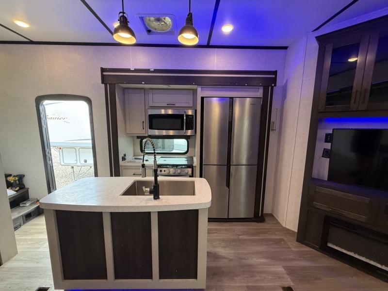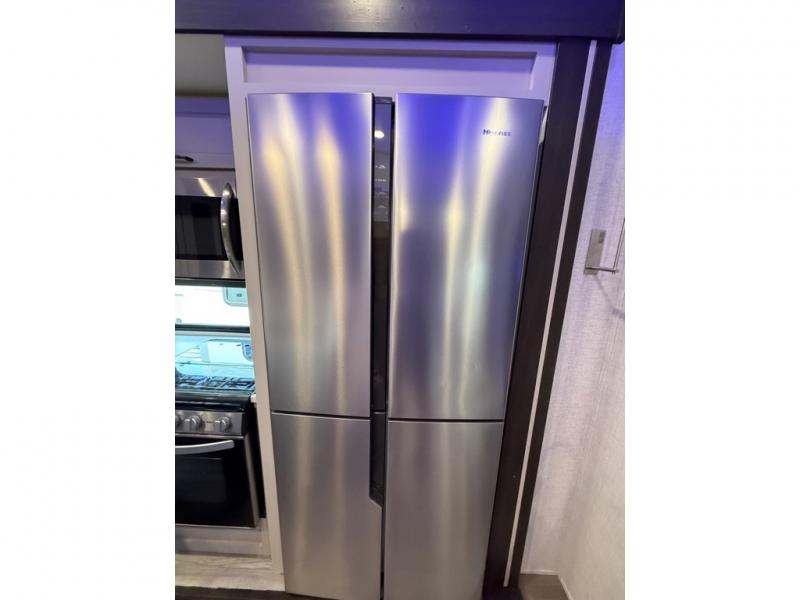 LARGE LIVING AREA WITH THEATER SEATING & TRIFOLD SLEEPER SOFA. ELECTRIC FIREPLACE & BIG FLAT SCREEN TV. BEAUTIFUL ISLAND KITCHEN with residential refrigerator, STAINLESS STEEL APPLIANCES, and LOTS OF CABINET STORAGE.