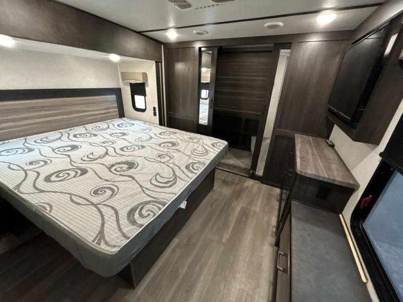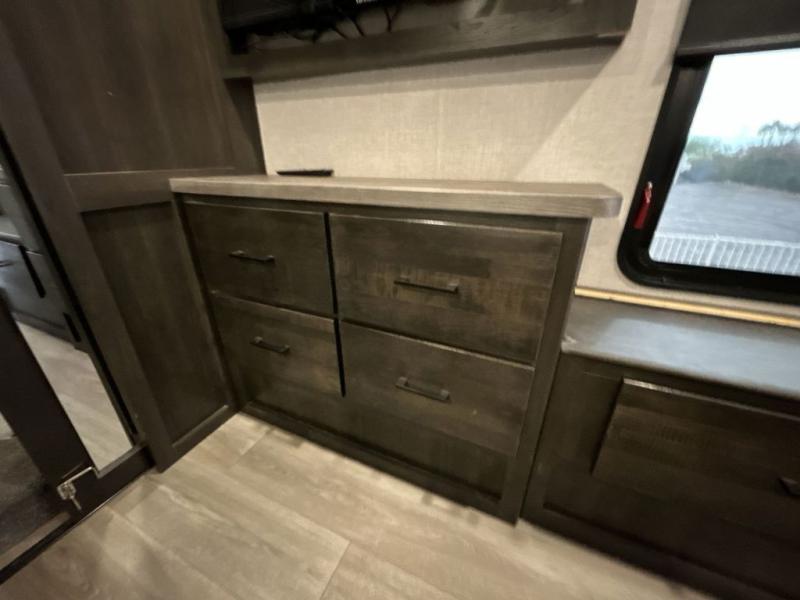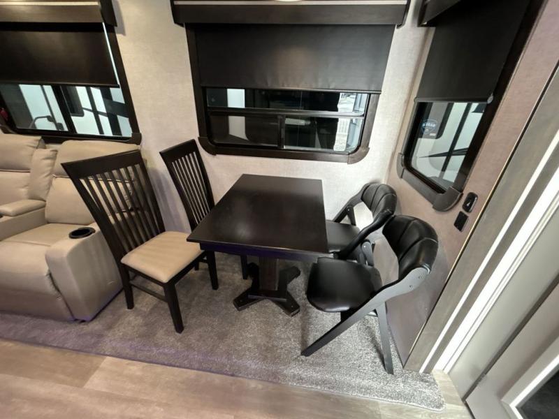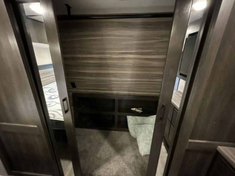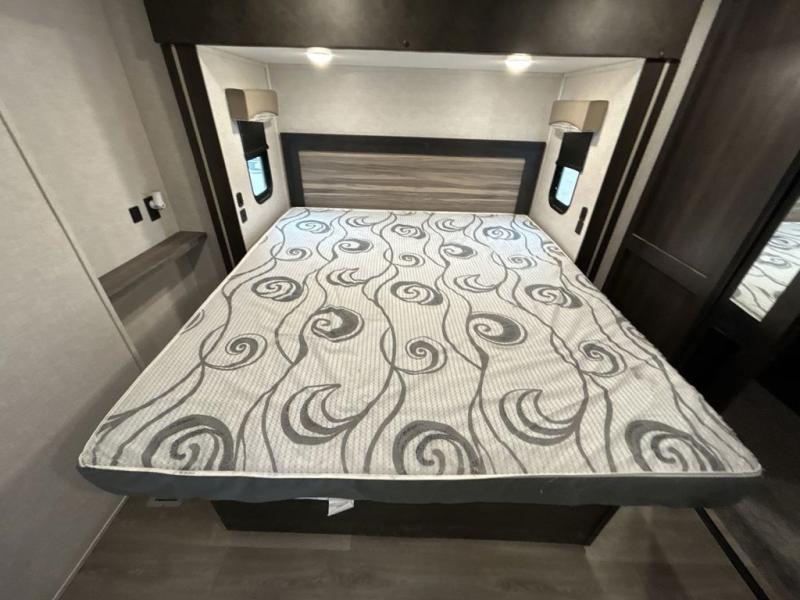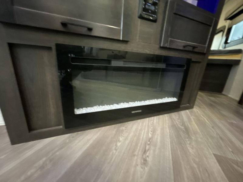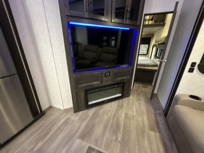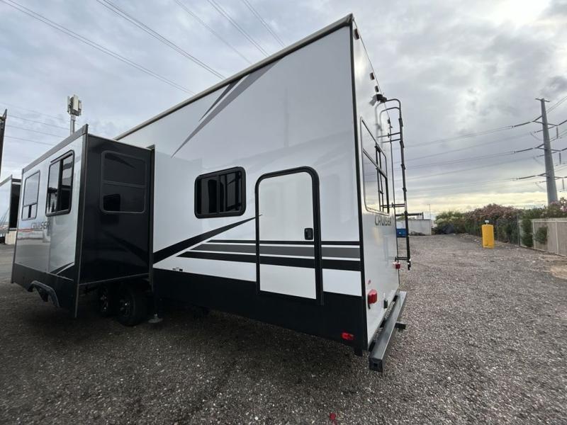 This award-winning Cruiser fifth wheel literally has it all! You will be completely impressed by the many fabulous features found all throughout this model, like the king bed slide in the front private bedroom, the rear bunkhouse suite that has its own half bath and second exterior entry door, and the comfortable living area with a free-standing table with chairs, 50" LED HDTV, and a fireplace. Since there are a set of opposing slides in the main living area, you'll have plenty of room to work around the kitchen island while you prepare dinner. If you are tired of remaining indoors, you can simply take your ingredients outside to use the outdoor kitchen.
