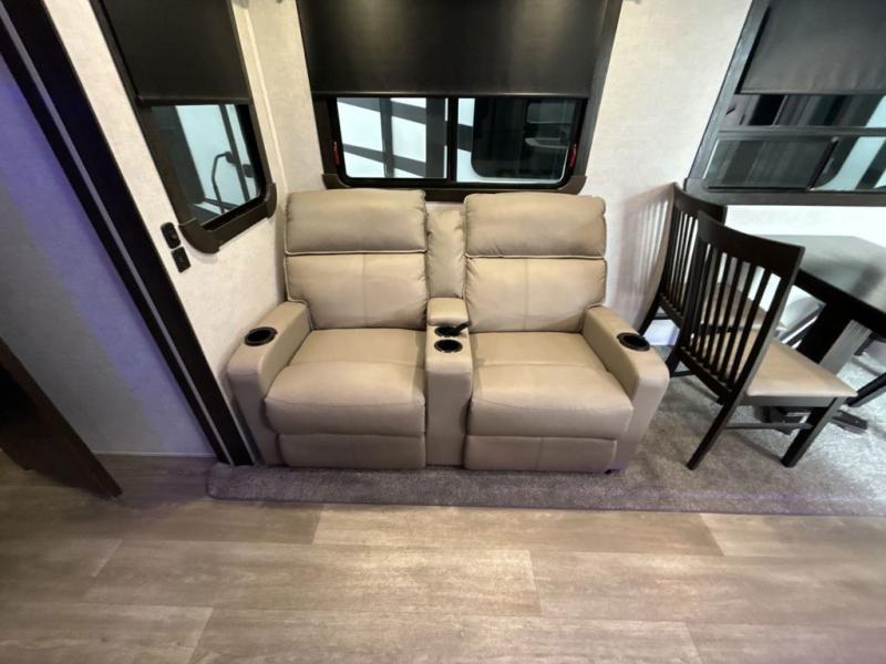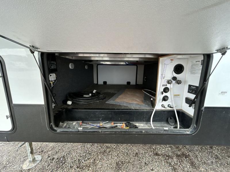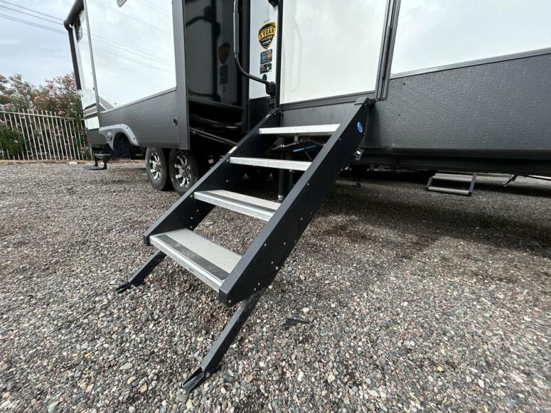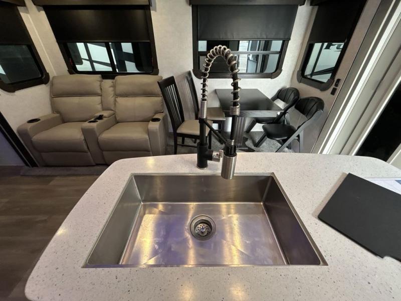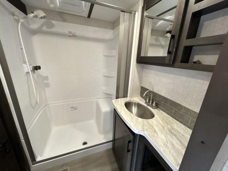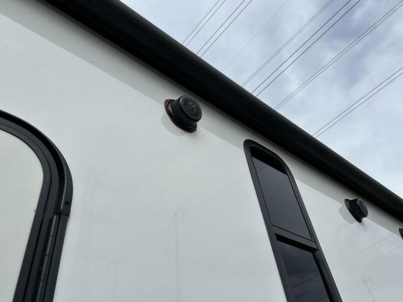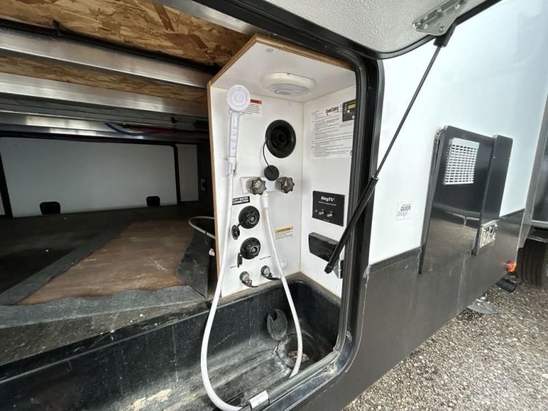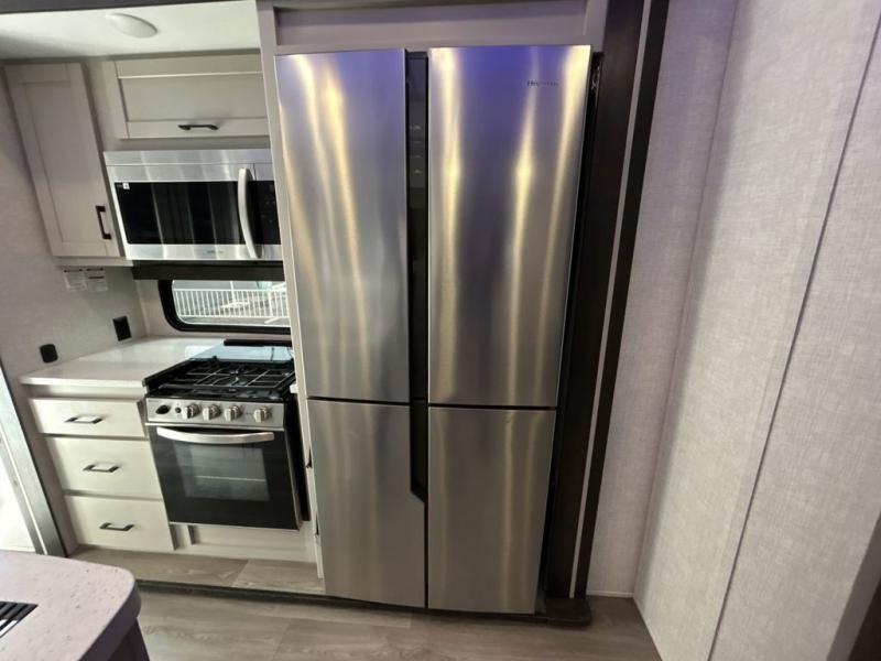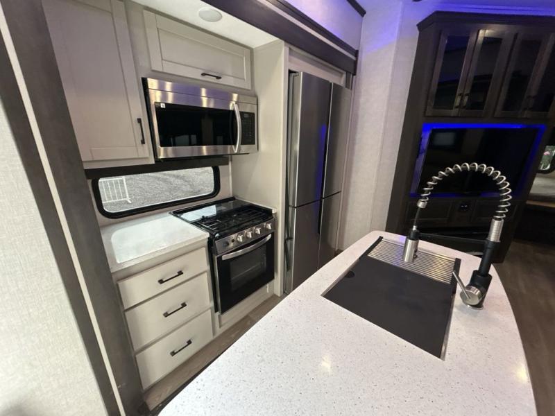 This award-winning Cruiser fifth wheel literally has it all! You will be completely impressed by the many fabulous features found all throughout this model, like the king bed slide in the front private bedroom, the rear bunkhouse suite that has its own half bath and second exterior entry door, and the comfortable living area with a free-standing table with chairs, 50" LED HDTV, and a fireplace. Since there are a set of opposing slides in the main living area, you'll have plenty of room to work around the kitchen island while you prepare dinner. If you are tired of remaining indoors, you can simply take your ingredients outside to use the outdoor kitchen.