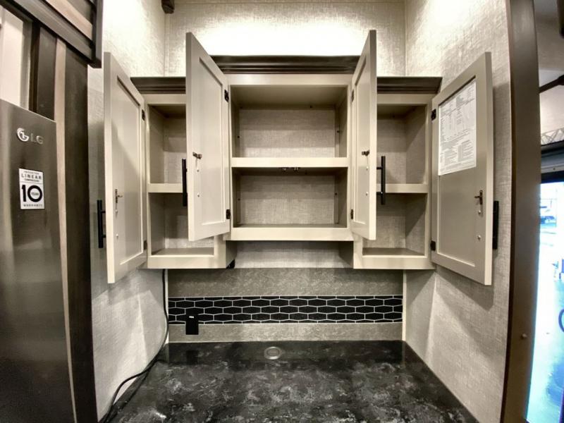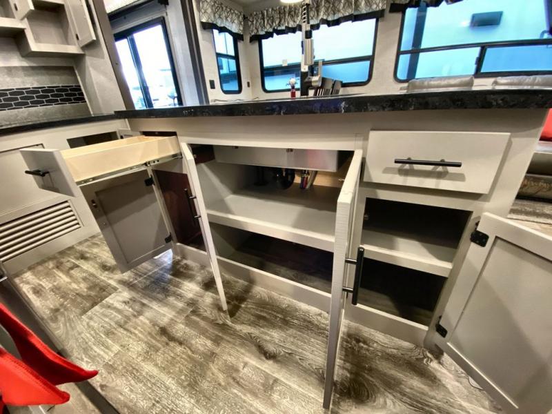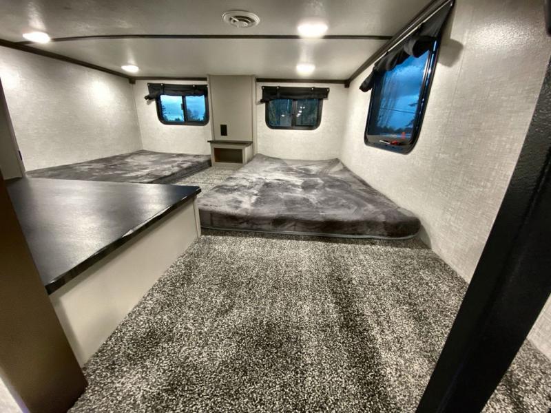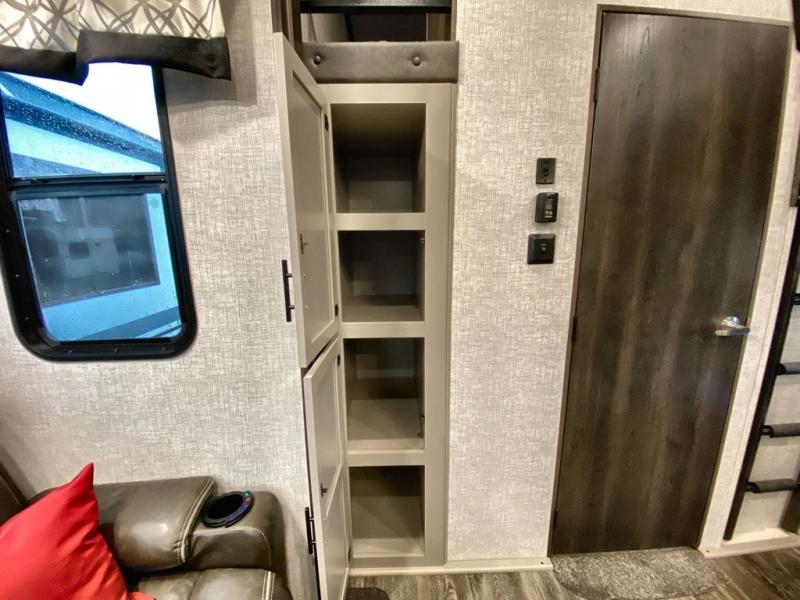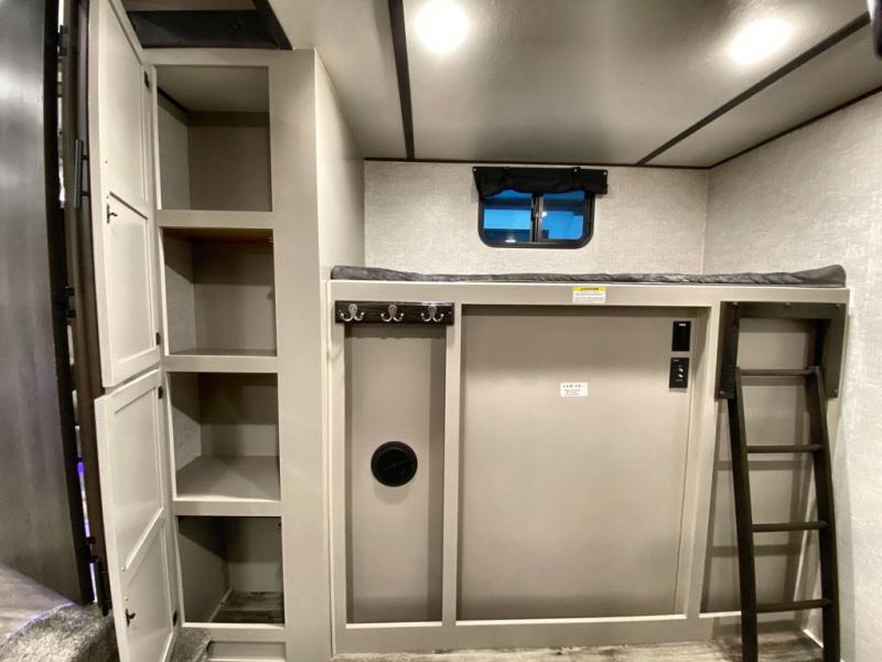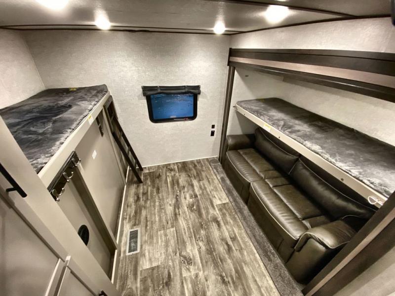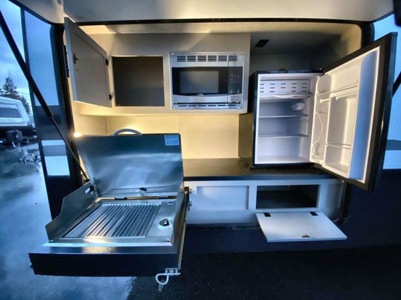 The whole family can fit in this destination trailer! You will have your own privacy with the front private bedroom which has a queen bed slide, an entertainment center with a wardrobe, a closet, a dresser, and another closet prepped to add an optional washer and dryer. The rear bedroom has a flip-up bunk above a tri-fold sofa slide, a set of bunk beds, and a loft area with two bunk mats above it all with a ladder to access it. The chef can prepare their best meals with the kitchen island, hutch, corner cabinet, and stainless steel residential style appliances or head to the exterior kitchen to breathe in some fresh air while grilling up some juicy burgers. Enjoy your meals together at the free standing table with chairs and bench seating then relax in the powered theater seating across from the entertainment center with a LED HDTV.