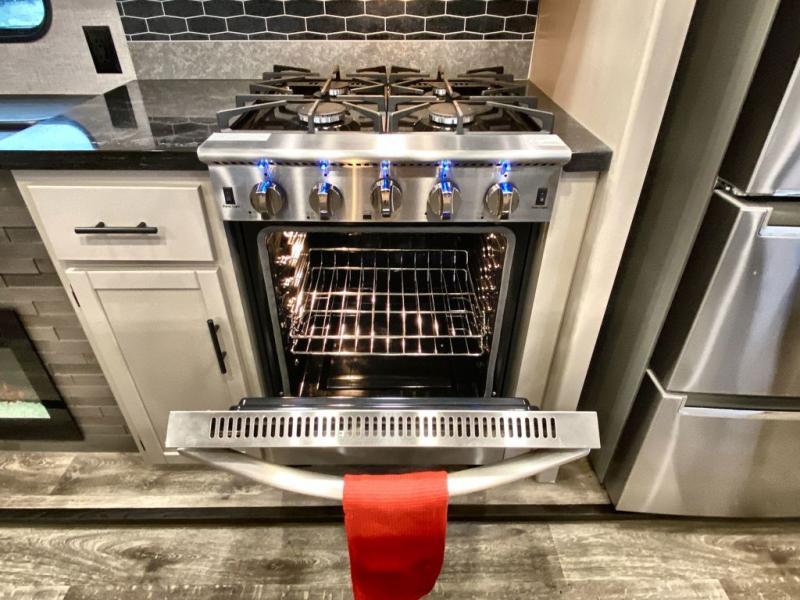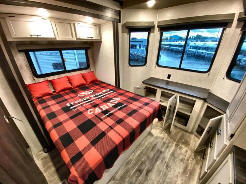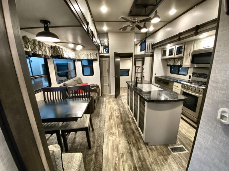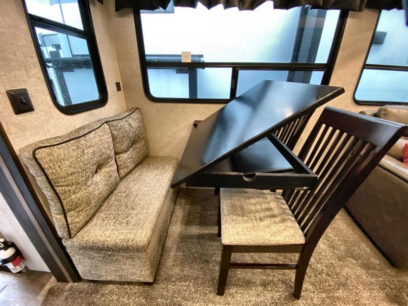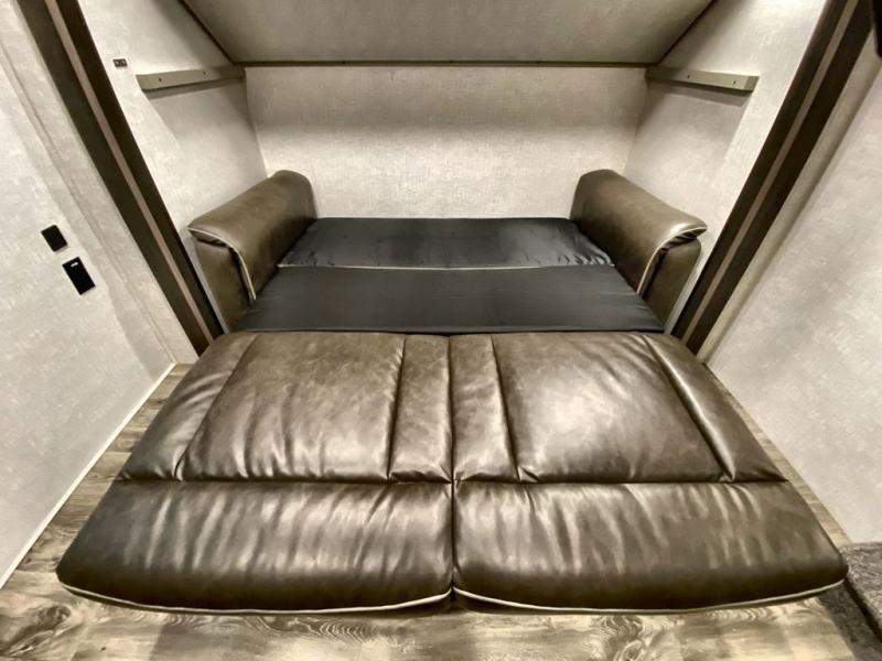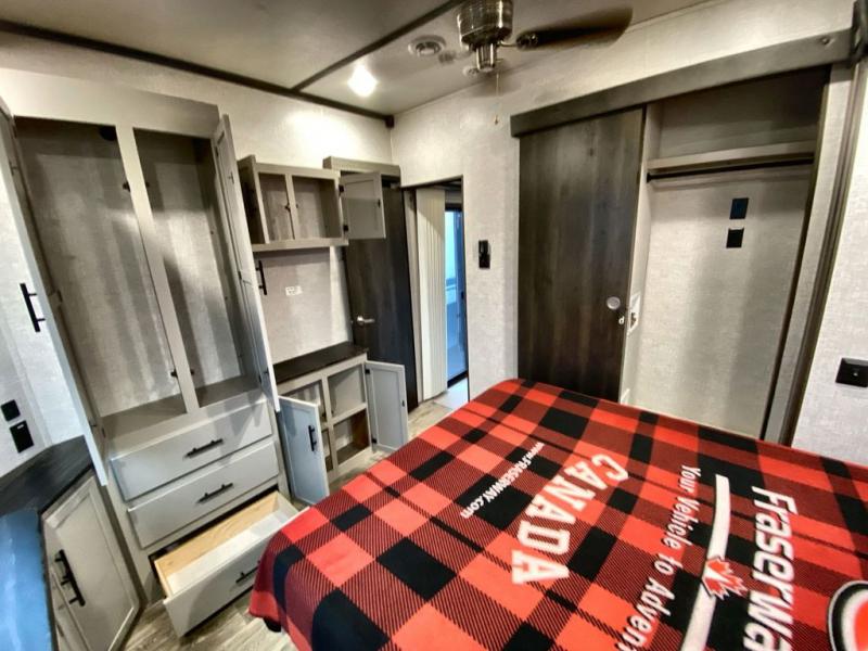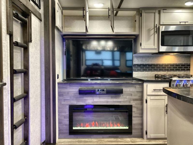 The whole family can fit in this destination trailer! You will have your own privacy with the front private bedroom which has a queen bed slide, an entertainment center with a wardrobe, a closet, a dresser, and another closet prepped to add an optional washer and dryer. The rear bedroom has a flip-up bunk above a tri-fold sofa slide, a set of bunk beds, and a loft area with two bunk mats above it all with a ladder to access it. The chef can prepare their best meals with the kitchen island, hutch, corner cabinet, and stainless steel residential style appliances or head to the exterior kitchen to breathe in some fresh air while grilling up some juicy burgers. Enjoy your meals together at the free standing table with chairs and bench seating then relax in the powered theater seating across from the entertainment center with a LED HDTV.