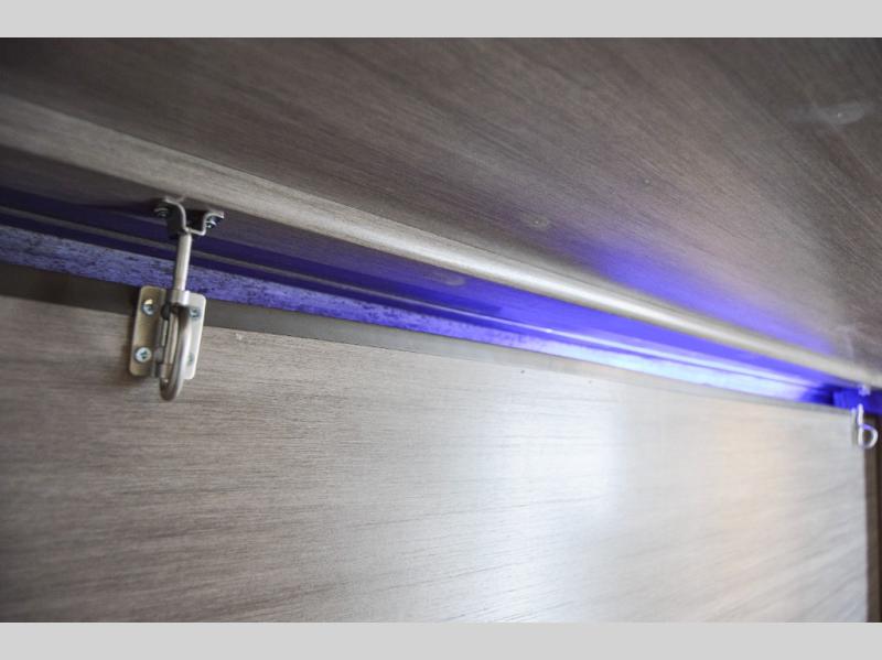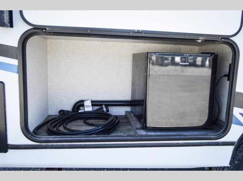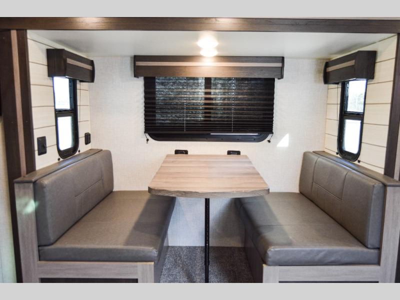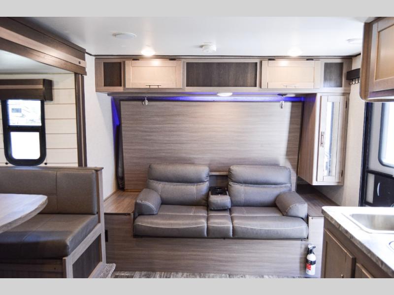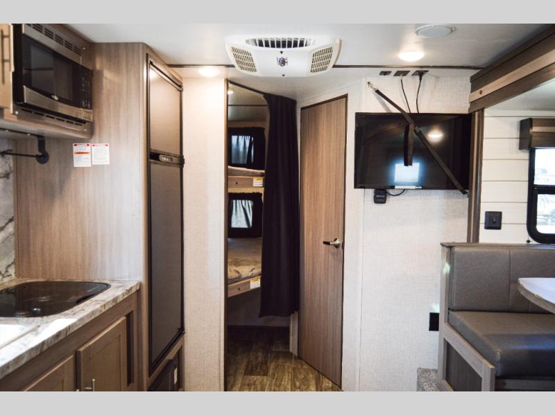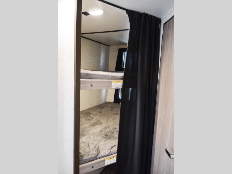 This travel trailer is easy-to-tow and can sleep seven people comfortably each night. You will love the versatile queen-size Murphy bed that can fold away to relax on the jackknife sofa during the day. The kids will love the 50" x 74" double-size bunk beds, and any other overnight guests can sleep on the slide out booth dinette. You can easily store your clothes in the wardrobe beside the Murphy bed, and the overhead cabinet in the kitchen will be perfect for snacks. This model also includes an outside kitchen refrigerator so you can grab a cold drink as you sit under the power awning with LED lights!