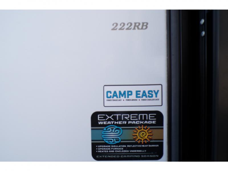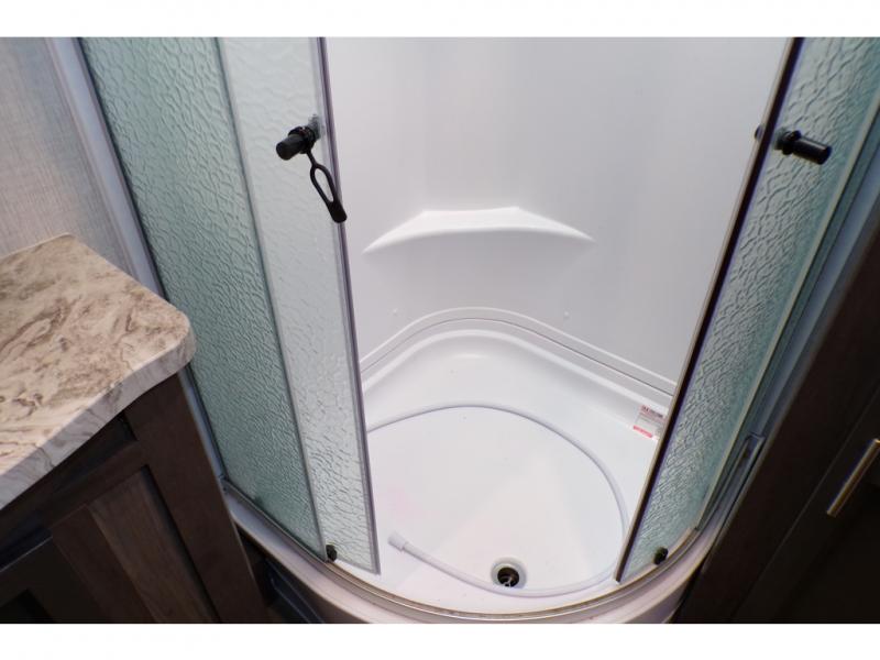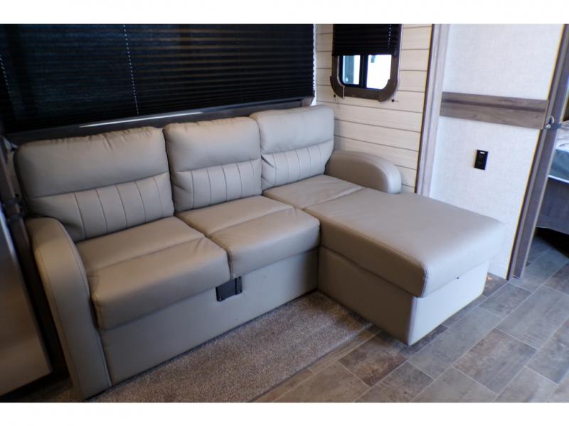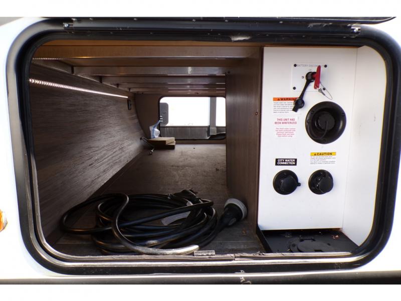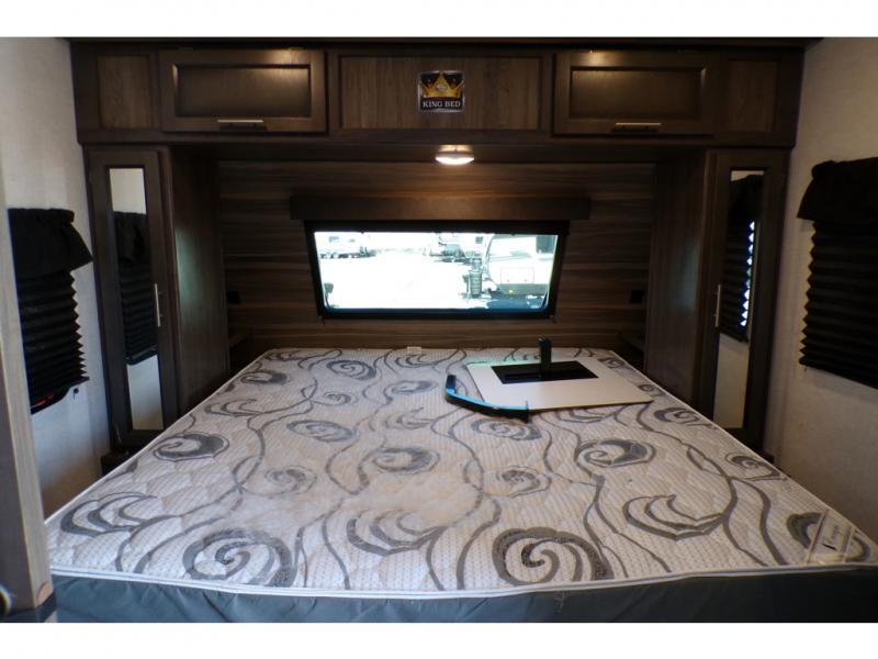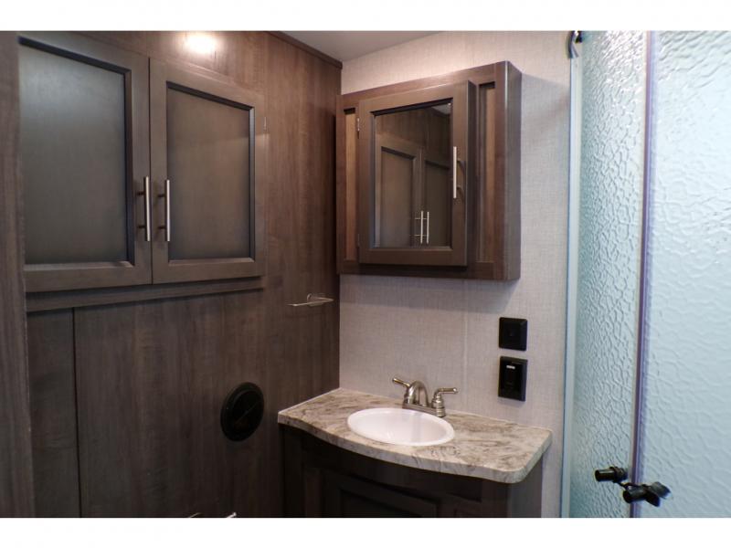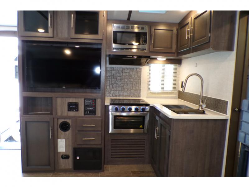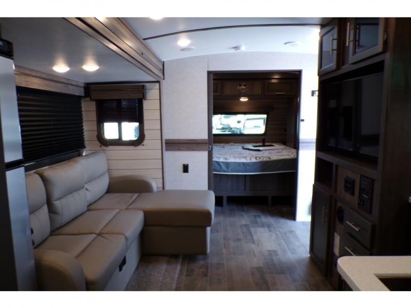 It's time to upgrade your RV to this spacious travel trailer! The slide out in the main living area will provide the dog space to stretch out, and within the slide out you'll find the tri-fold sofa/chaise lounge for your comfort. The full rear bath is both spacious and convenient with its shower skylight, medicine cabinet, and linen closet for clean towels. Head to the kitchen to prepare lunch on the glass top range or take your preparations outside to cook on the exterior camp kitchen. This model also features a front private bedroom with a king bed, dual wardrobes, plus a shoe storage and pet station for your loyal buddy!
