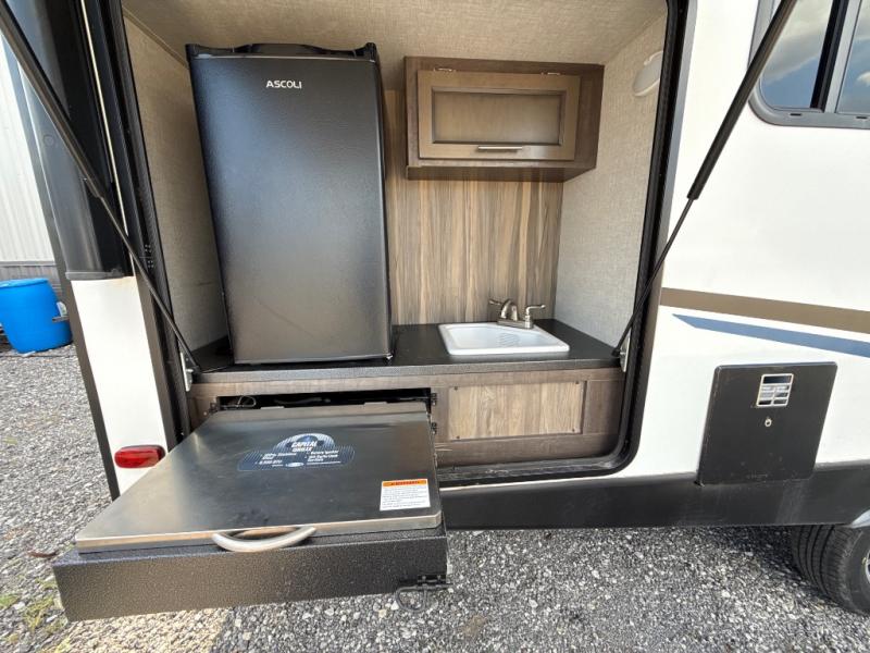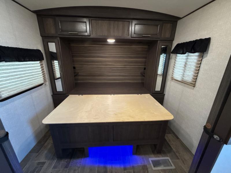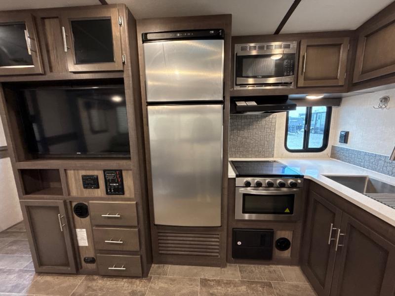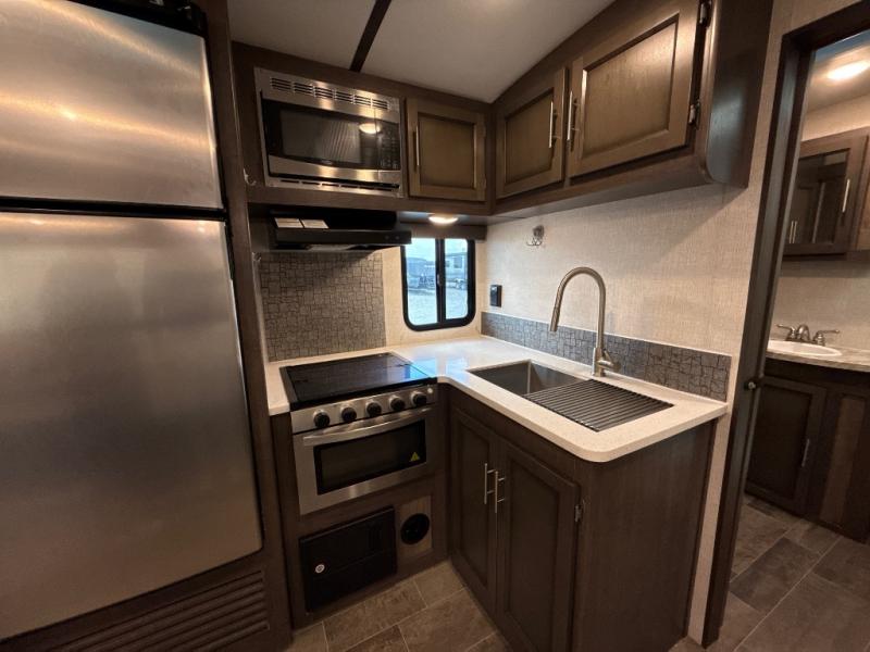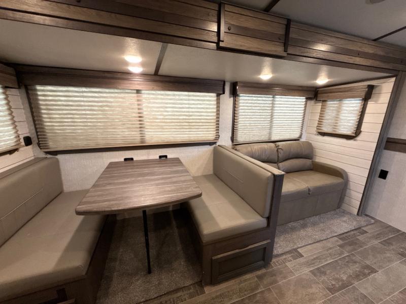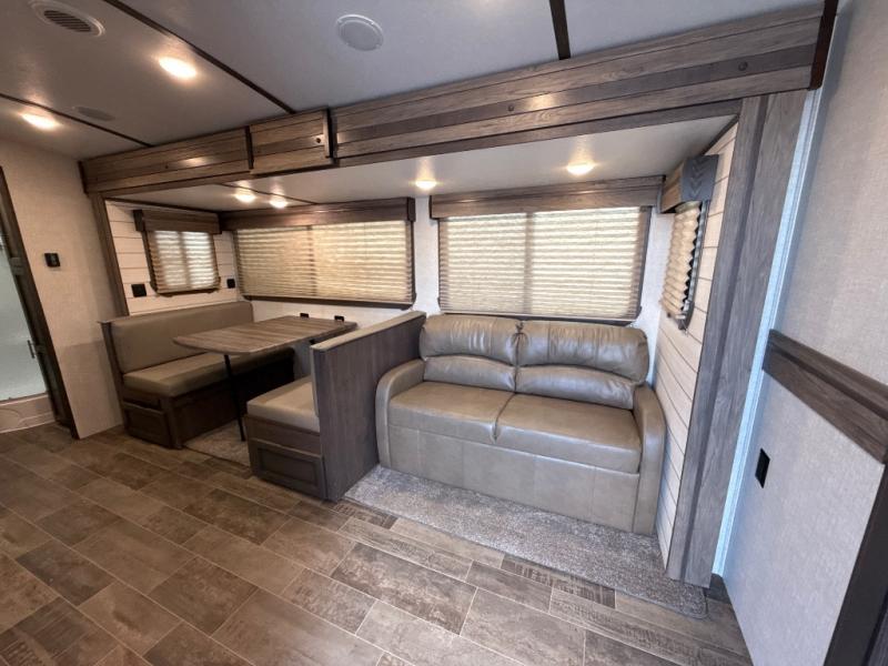 You will love the added interior space you have in this travel trailer thanks to the large slide out in the main living area. Here, you'll enjoy playing cards at the XL booth dinette and relaxing on the tri-fold sofa. Make home-cooked meals on the glass top range or use the exterior camp kitchen. There is even an exterior refrigerator for cold drinks, and the power awning will shade you from the hot summer sun. This model features a full rear bath for added privacy, and the shower skylight will allow natural light in. The front private bedroom includes a king bed, dual wardrobes, plus a shoe storage and pet station for your convenience!