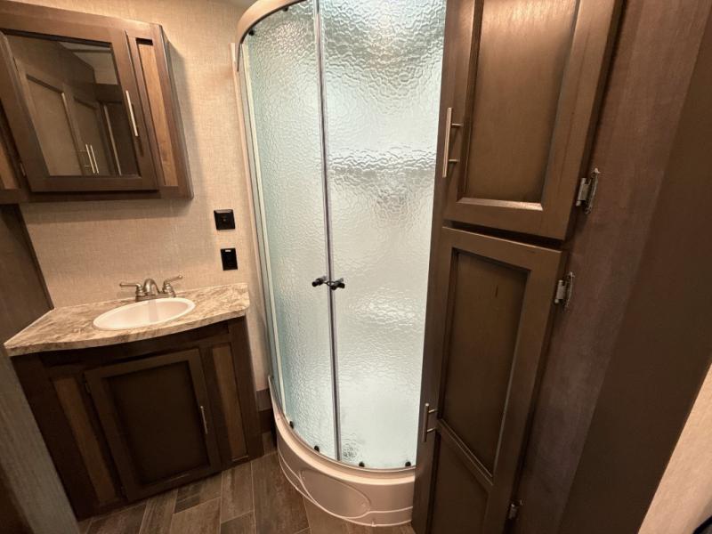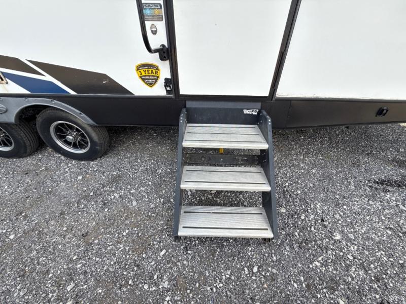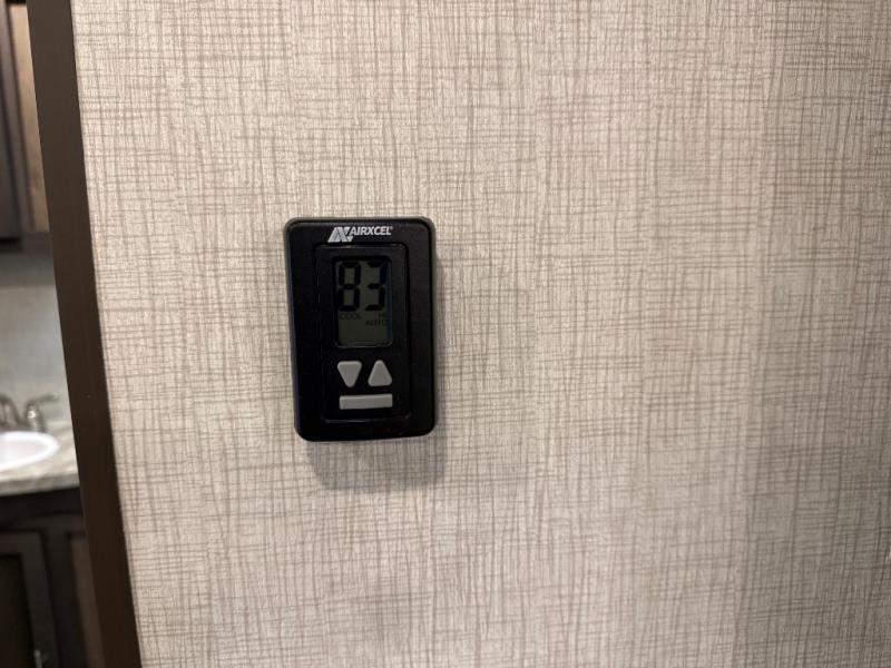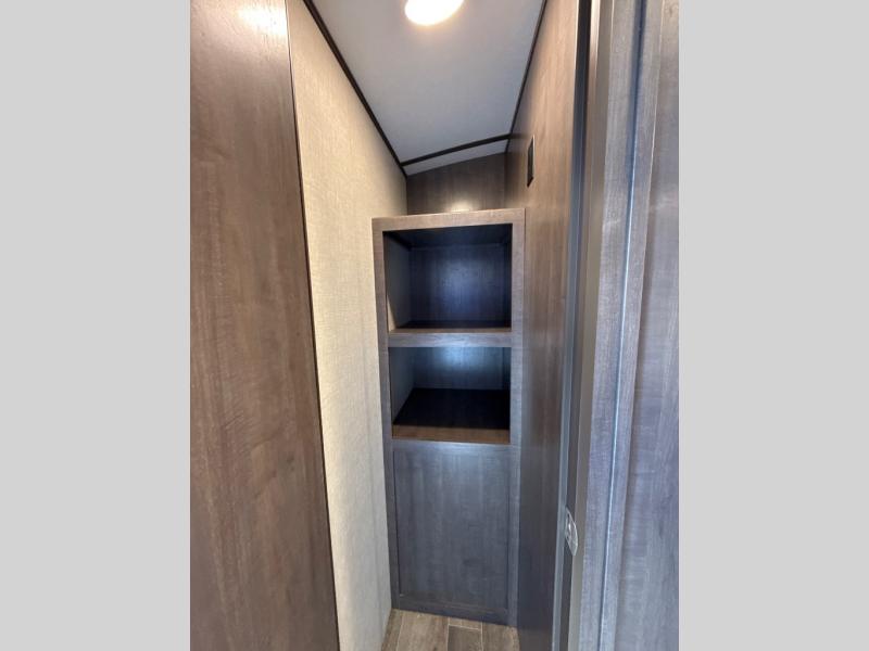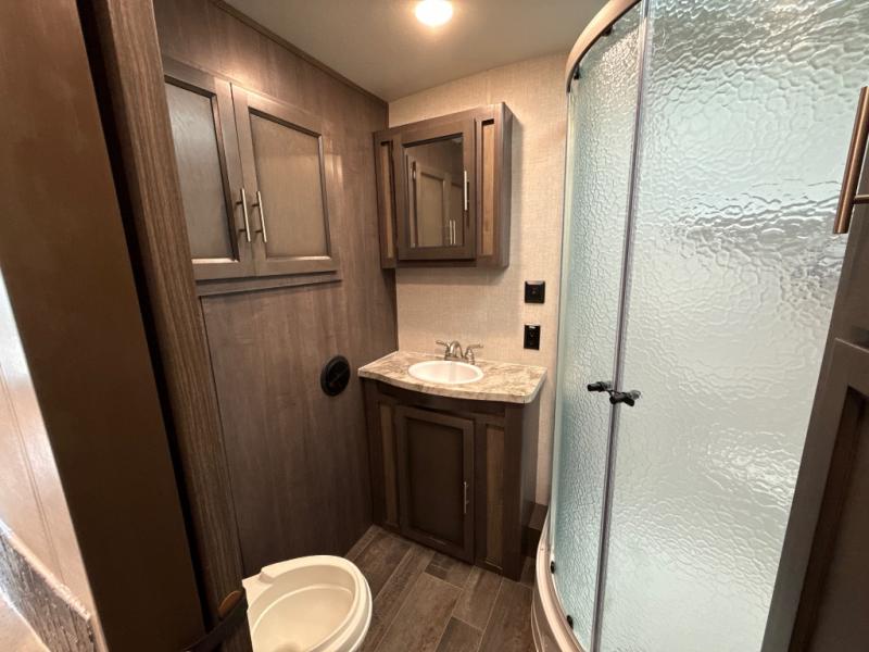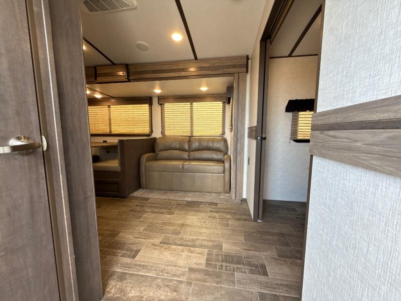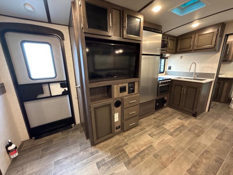 You will love the added interior space you have in this travel trailer thanks to the large slide out in the main living area. Here, you'll enjoy playing cards at the XL booth dinette and relaxing on the tri-fold sofa. Make home-cooked meals on the glass top range or use the exterior camp kitchen. There is even an exterior refrigerator for cold drinks, and the power awning will shade you from the hot summer sun. This model features a full rear bath for added privacy, and the shower skylight will allow natural light in. The front private bedroom includes a king bed, dual wardrobes, plus a shoe storage and pet station for your convenience!