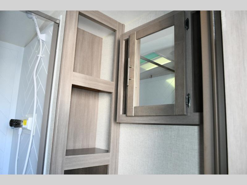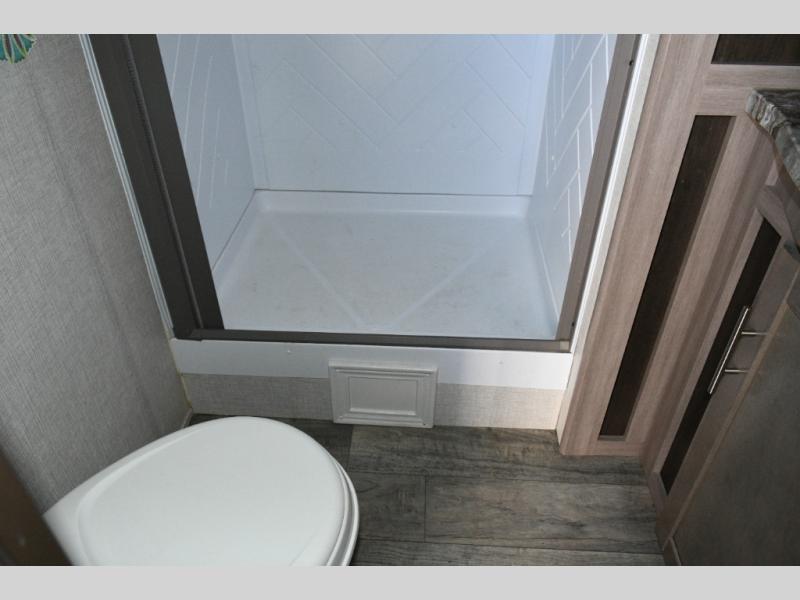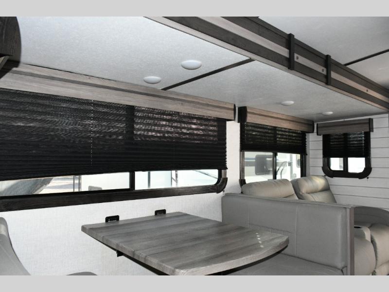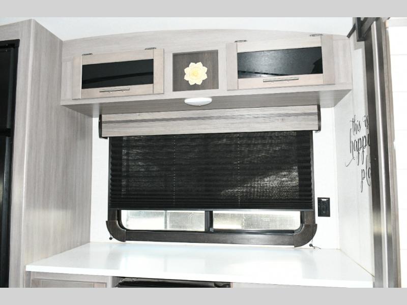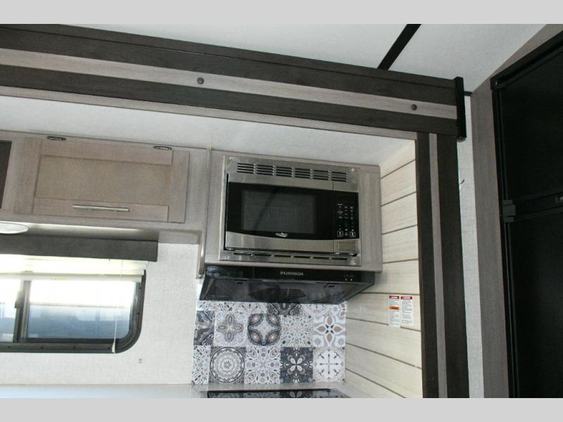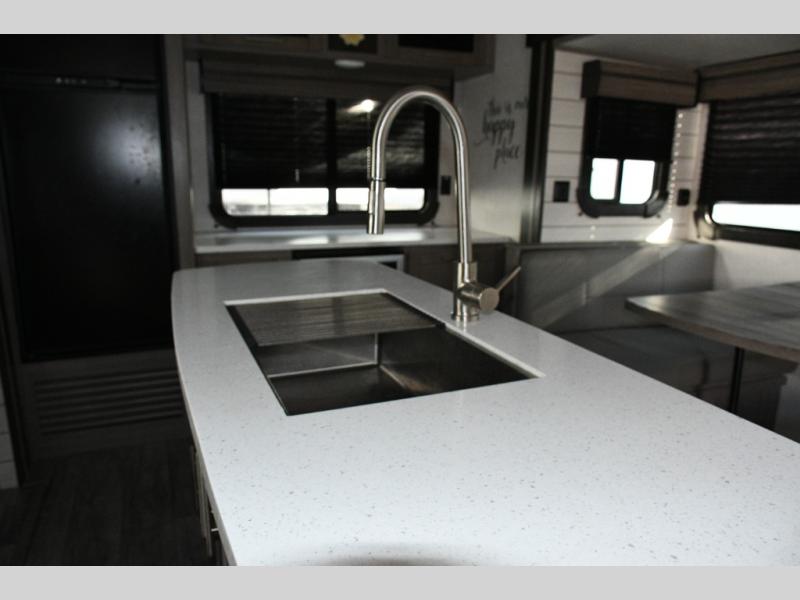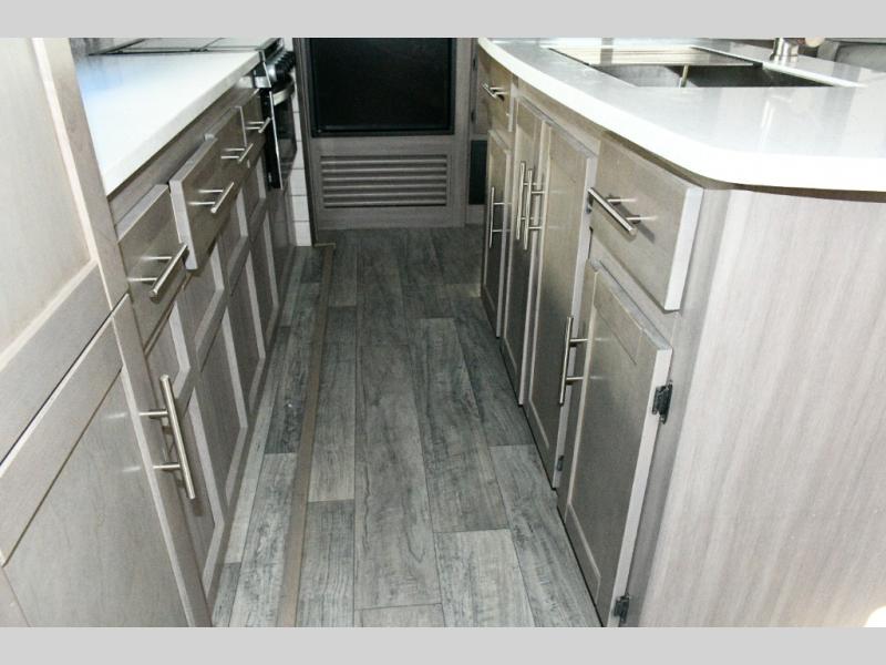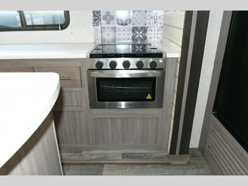 The Sunset Trail lineup is known for lightweight construction and travel-friendly design. Features include laminated sidewalls, EZ Lube axles, secure stance entry steps, and an exterior convenience center. Inside, you’ll enjoy stainless steel appliances, farmhouse-style sink, solid wood drawer construction, and bright LED lighting that creates an open and welcoming atmosphere.