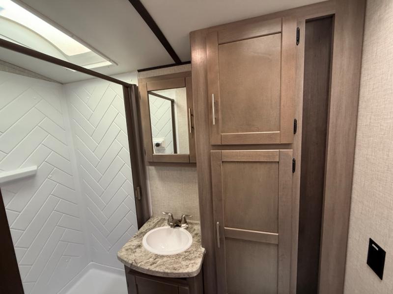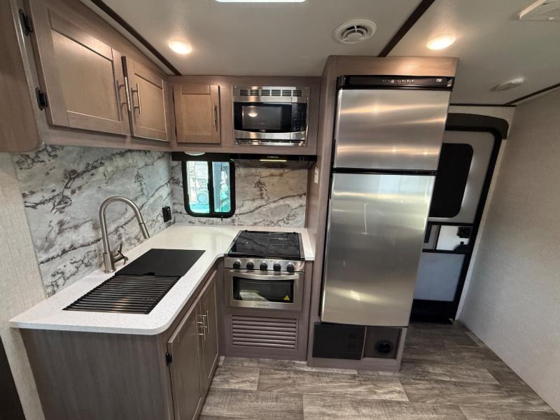 The lightweight Sunset Trail travel trailers by CrossRoads RV include EZ lube axles, laminated sidewalls, secure stance entry steps, plus an exterior convenience center to make each camping trip enjoyable. The gas oven, stainless steel microwave, and refrigerator allow you to cook and store food during your trip to the lake, and the stainless steel farmhouse sink will make clean-up a breeze. These models feature solid wood drawer construction and LED lights for an open and bright living space. You can choose to add many convenient options, such as the optional 50 amp electrical service, a second 13,500 BTU A/C, and a free-standing table and chairs in place of the booth dinette!