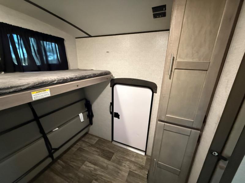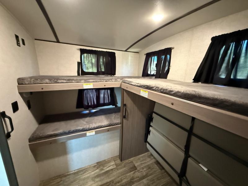 Everyone will have a great time camping in this travel trailer! From the rear private bunkhouse with a 60" fold-up sofa below a 28" x 64" flip-up bunk, a set of 28" x 74" bunk beds, and a wardrobe to the outside kitchen which even has a refrigerator to keep your beverage cold while you cook. There is a front private bedroom with a king bed that has wardrobes on either side and an overhead cabinet above it to store your items. The kids can even bring a friend or two along to sleep on the 80" x 42" XL booth dinette and the tri-fold sofa. The full bathroom has a 30" x 36" shower and a linen closet so everyone can stay squeaky clean!