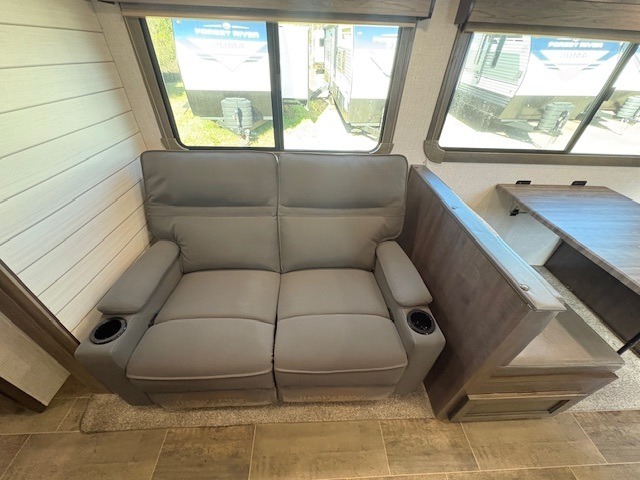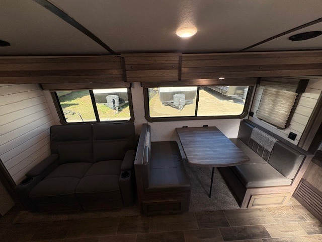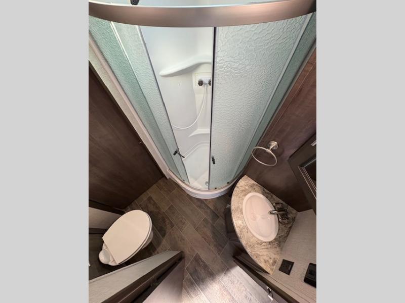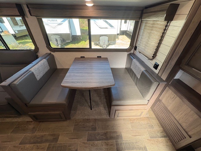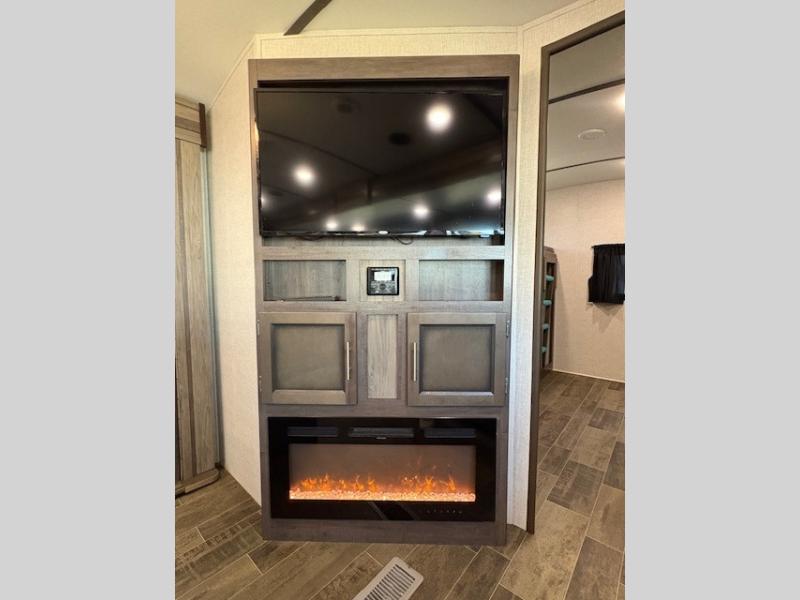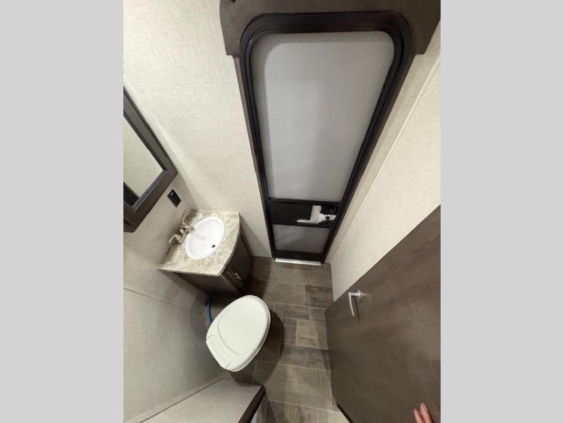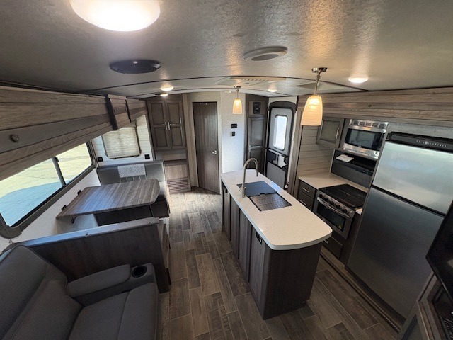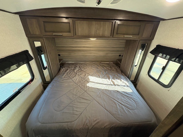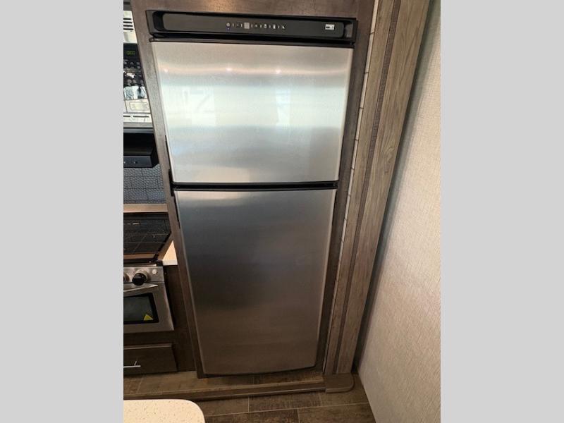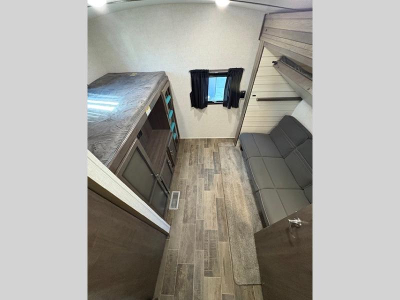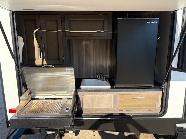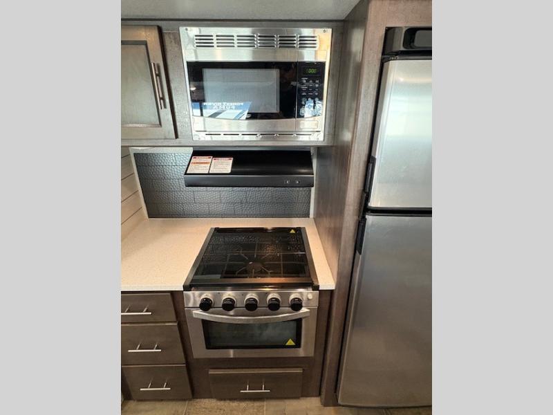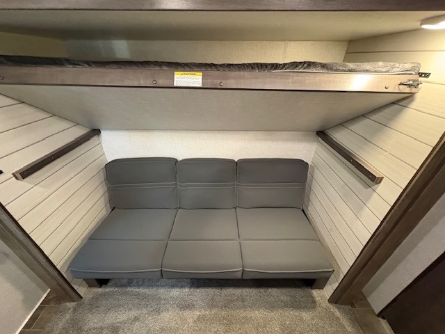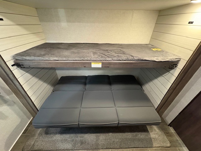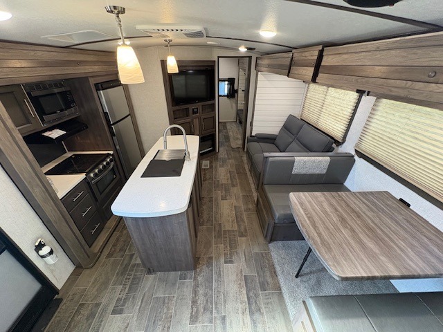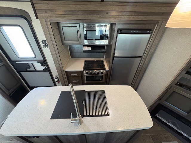 This travel trailer is packed with convenient features and luxury comforts for a camping trip you won't soon forget. Once you arrive at the campground, put out the power awning and make a quick lunch on the exterior camp kitchen. The kitchen island inside will be the perfect place to cut up all the fixings for the burgers and you can grab the chips from the pantry. The kids will love the private bunkhouse that includes two bunks, a jackknife sofa with a kick, plus a dual entry half bath for convenience. The full walk-through bath will create a front master bedroom you are sure to love. Here, the king bed will provide a great night's rest and there are dual wardrobes for all your clothes. Plus there is a convenient shoe storage and pet station for your trusted loyal friends!