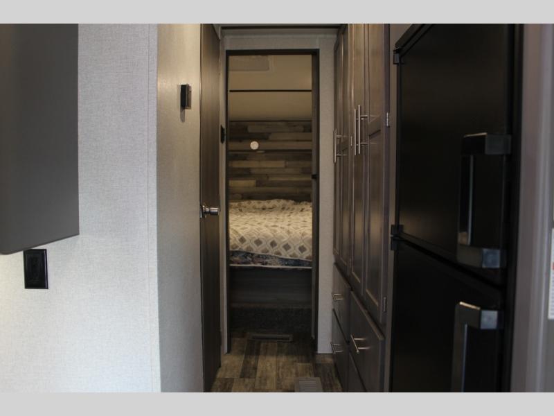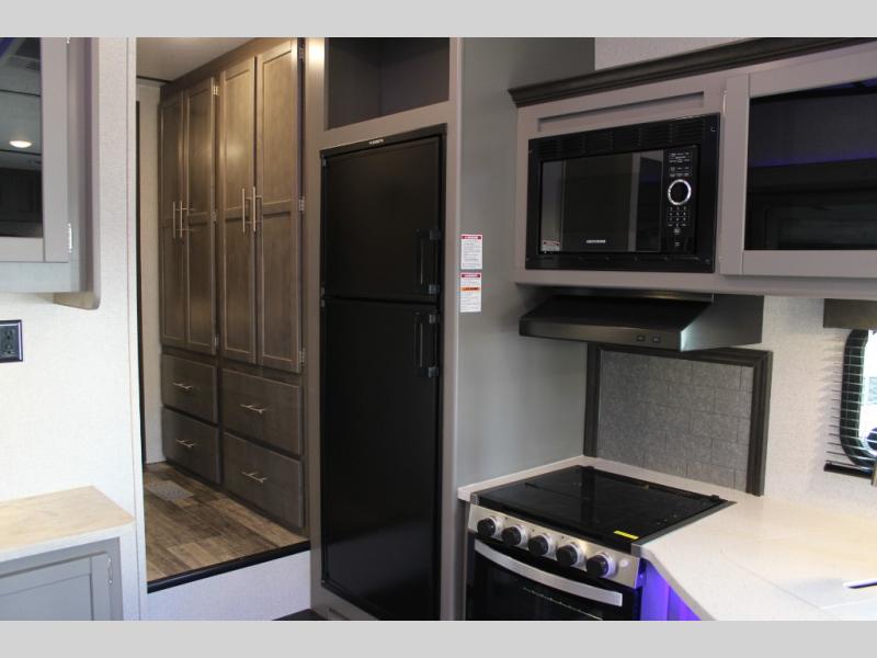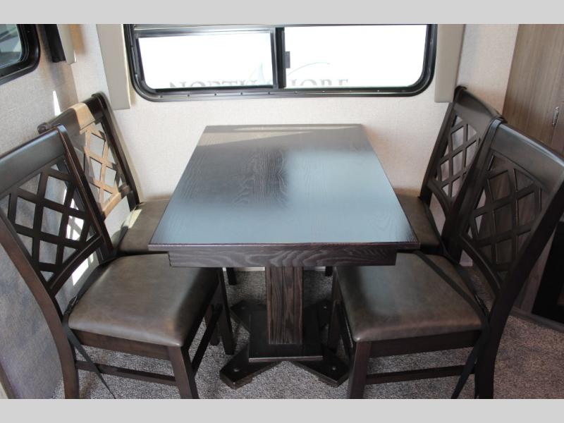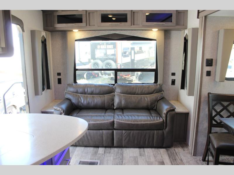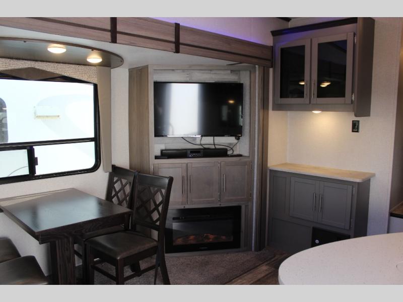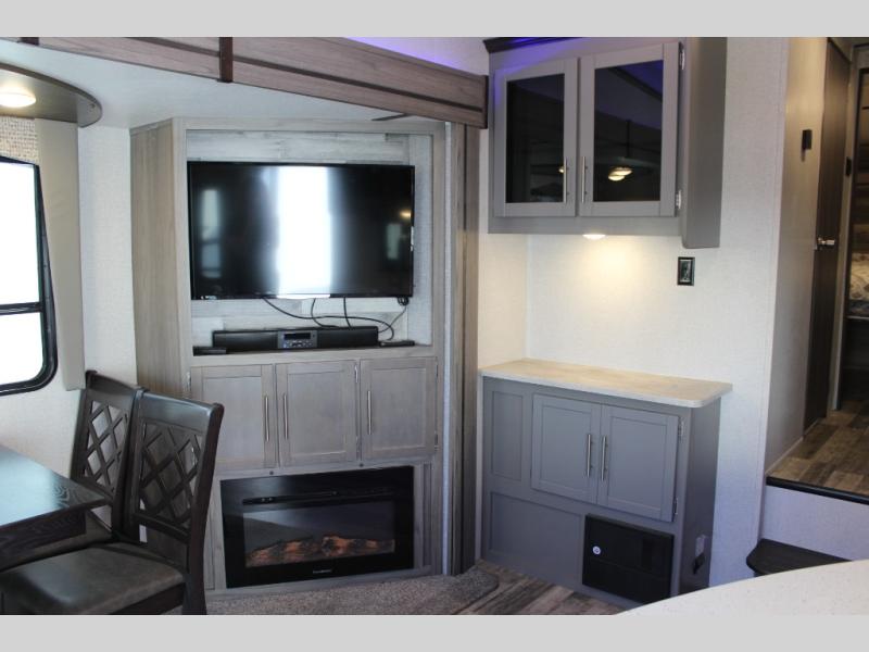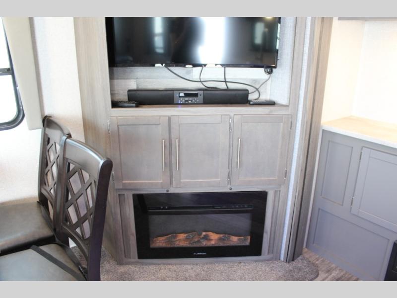 Step into this spacious fifth wheel for a camping trip you won't soon forget. The rear living area includes a tri-fold sofa for your guests to sleep on, plus there is a booth dinette for even more sleeping and seating space. The fireplace is sure to make it feel more like home, and you can bring along your nice dishes to set out on the hutch. This model features a large pantry and a large wardrobe right across the full bath so you can store necessitates and fresh towels. You and your spouse will enjoy the front private bedroom with its queen bed, dual wardrobes, plus overhead space for your special belongings.
