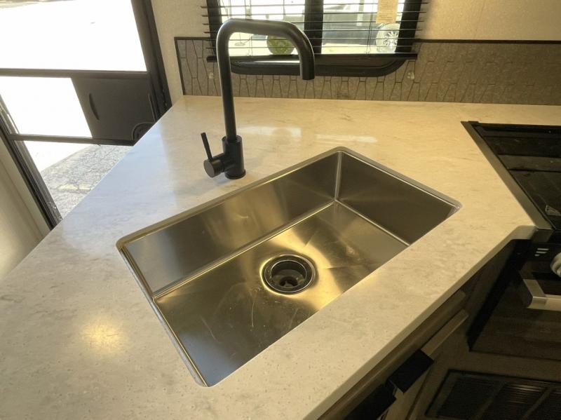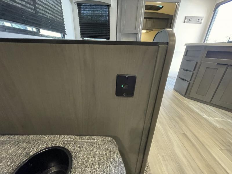 Thanks to the large slide out, the living area opens up to create a spacious, inviting environment for dining, playing games, or simply relaxing. The U-shaped dinette and sofa are perfect for family meals or movie nights, and they both convert into extra sleeping space if needed. No one gets left behind in the EL275.