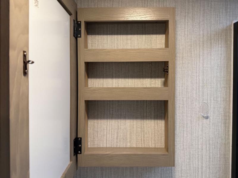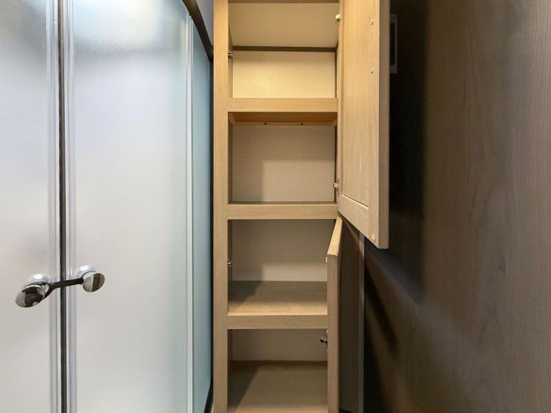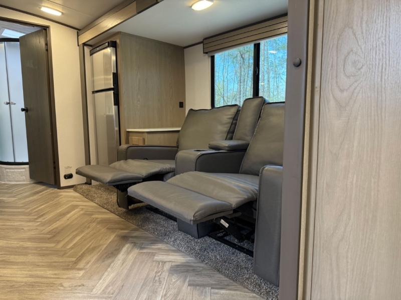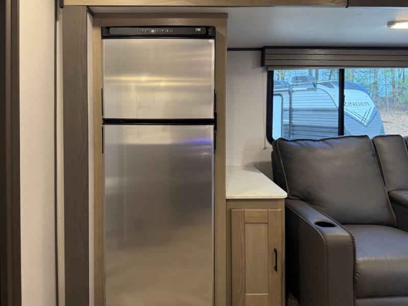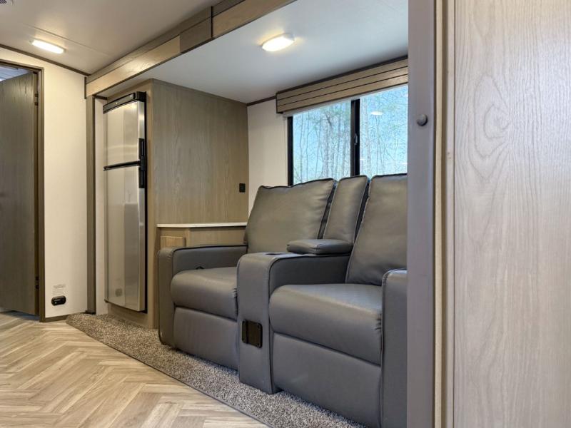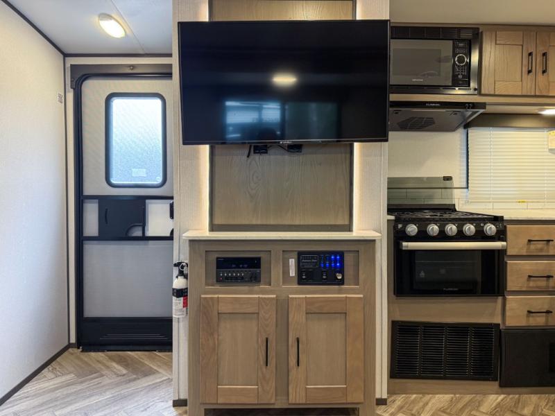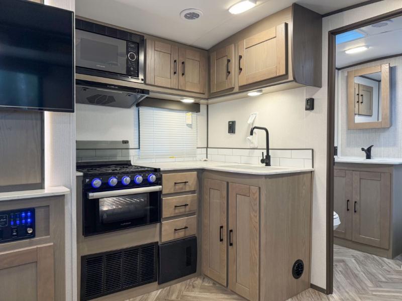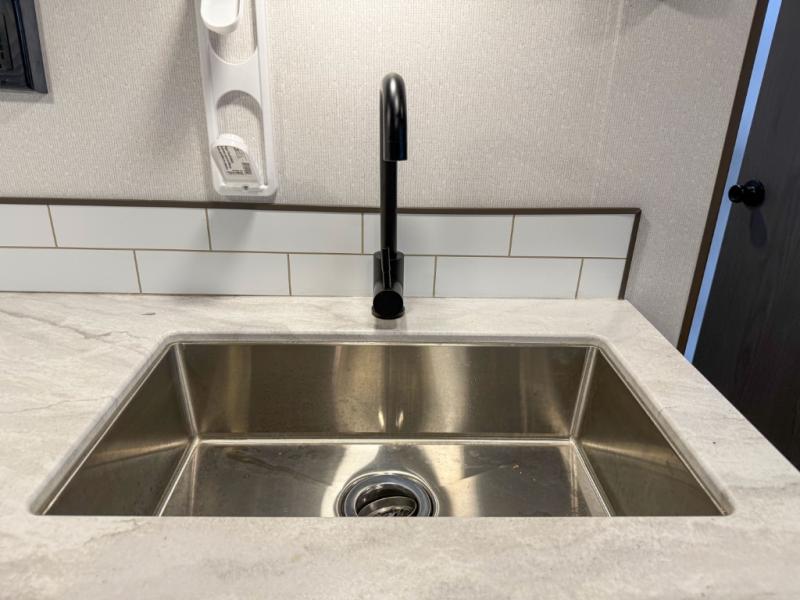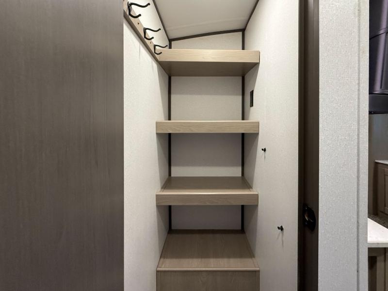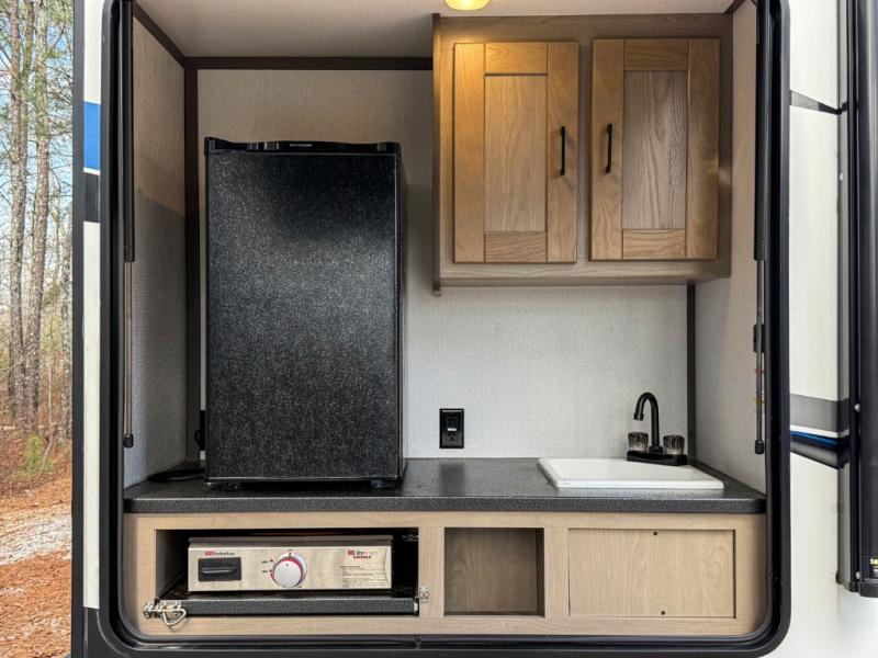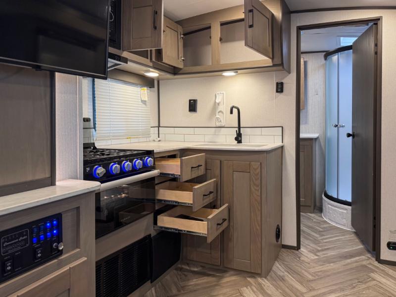 The chef will love having the choice to make meals inside with full amenities including a walk-in pantry/wardrobe by the entry, and outside at the outdoor kitchen with a griddle, sink, and storage. You and your spouse will love the spacious interior with a slide out including a U-shaped dinette and double door refrigerator, as well as the space savings sliding doors at the rear full bathroom and front private bedroom.