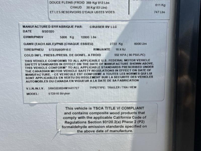 Used 2021 Cruiser Stryker ST2916 Toy Hauler Travel Trailer