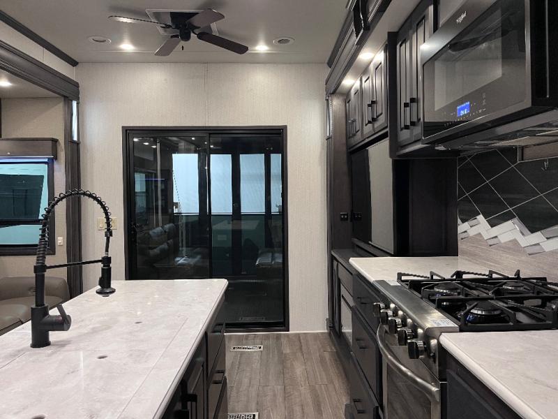 You will find full-time living at its best in the DRV Luxury Suites Full House fifth wheel toy hauler! This luxurious brand features several items that most toy haulers tend to ignore when it comes to residential living, but the Full House toy hauler truly is a full house on wheels! The garage features industrial metal cabinetry, LED lighting, a touchscreen entertainment system, a 50" LED HDTV, and dual 30-gallon fuel tanks. You can even choose to amp up the garage to the next level by adding the optional patio and the electric drop-down bed. A six-point hydraulic leveling system keeps your Full House in place, and the Onan gasoline generator supplies power to your unit. The interior is rather glamorous with its hand-laid vinyl floor tile, its crown molding, its plush residential high-durability carpet, and its ceiling fan, and the residential kitchen is undoubtedly going to be an essential feature for full-time living.