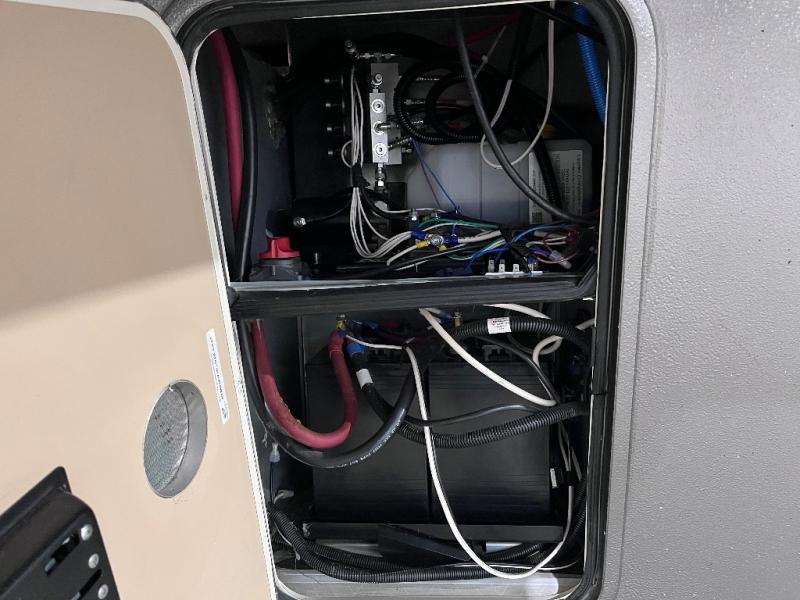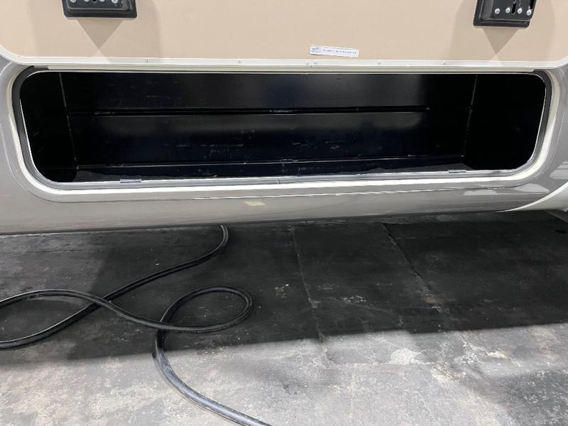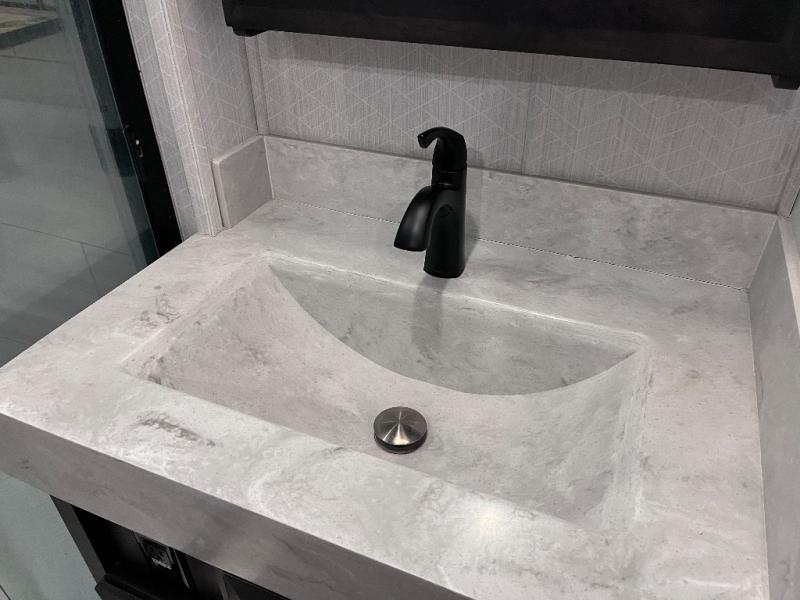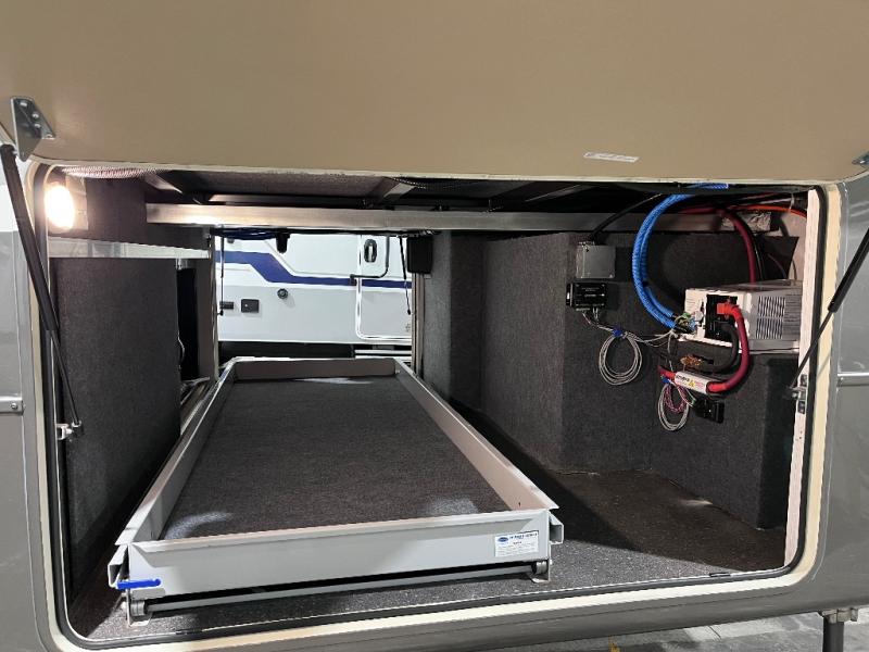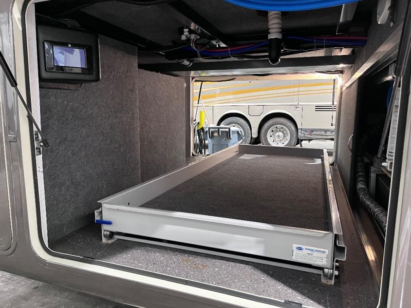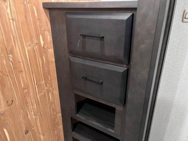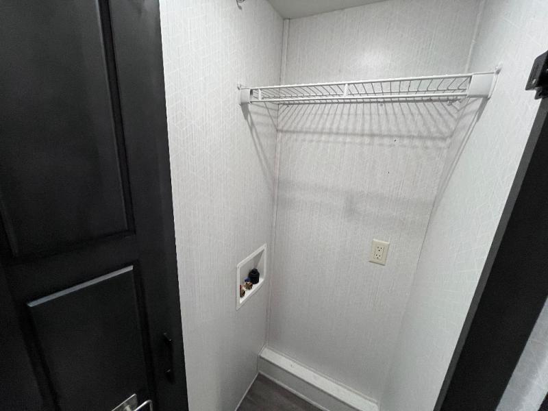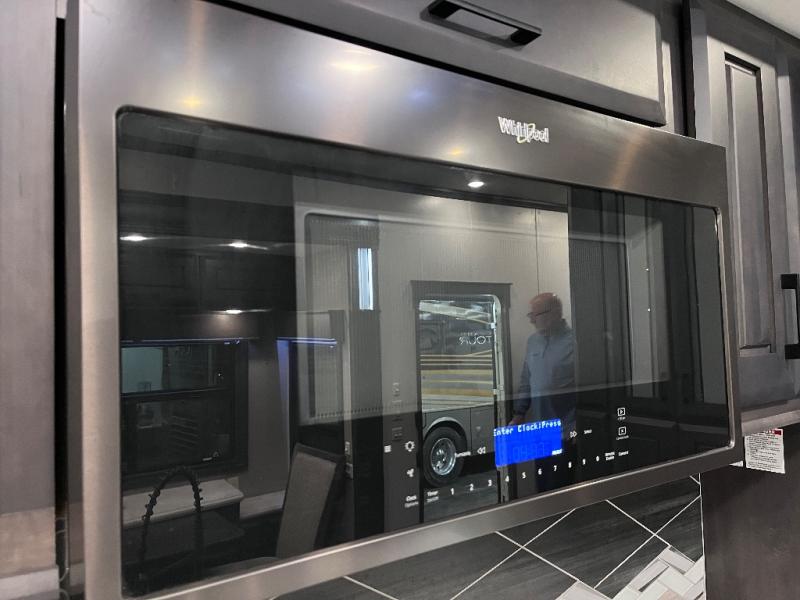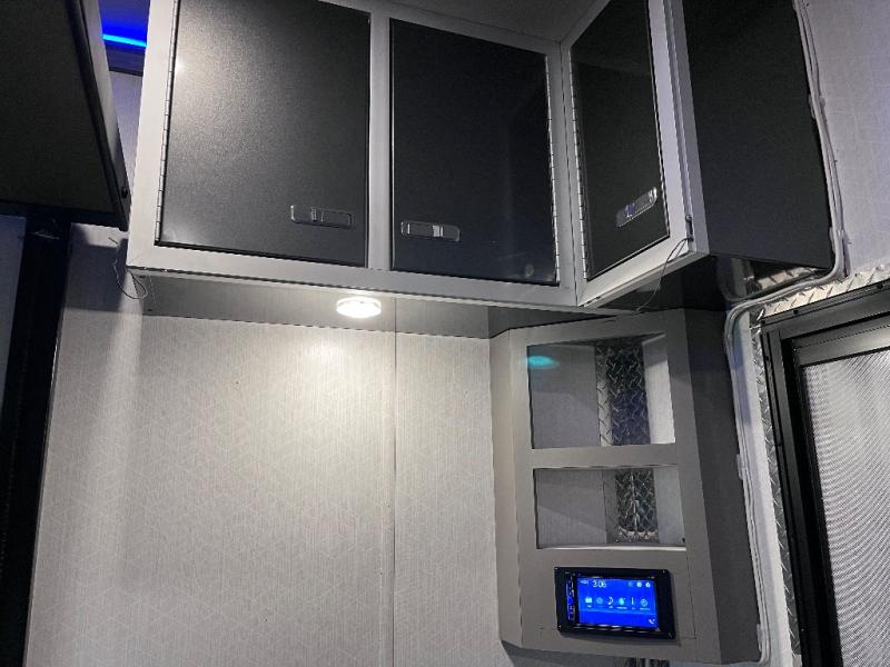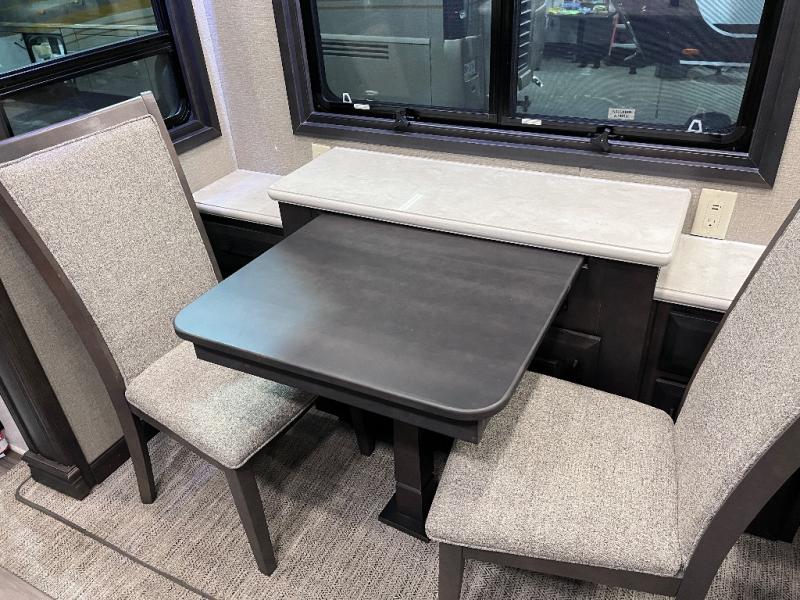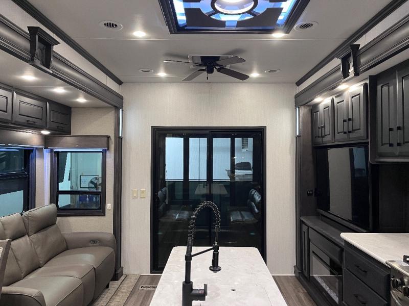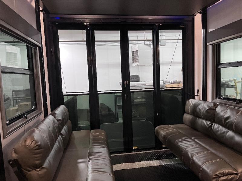 The decadent interior and high-class features are what will draw you in to this Full House fifth wheel toy hauler! The private bedroom is simply exceptional with its king bed slide, vanity slide, 32" LED TV, and walk-in closet, and right next to the bedroom is the full bathroom that will also wow you with its one-piece fiberglass shower, skylight, porcelain toilet, and Maxxair fan. When you step foot into the kitchen, you'll notice how stylish the stainless steel appliances are, and you will love the extra prep space that the kitchen island provides. There is also a free-standing table with chairs and theater seating right next to the kitchen so that your guests can sit down and chat with you while you finish dinner preparations.