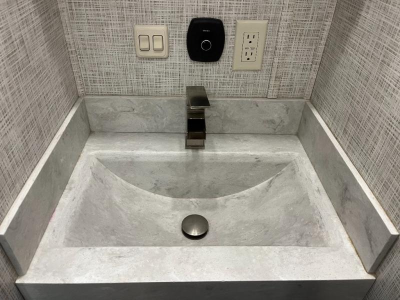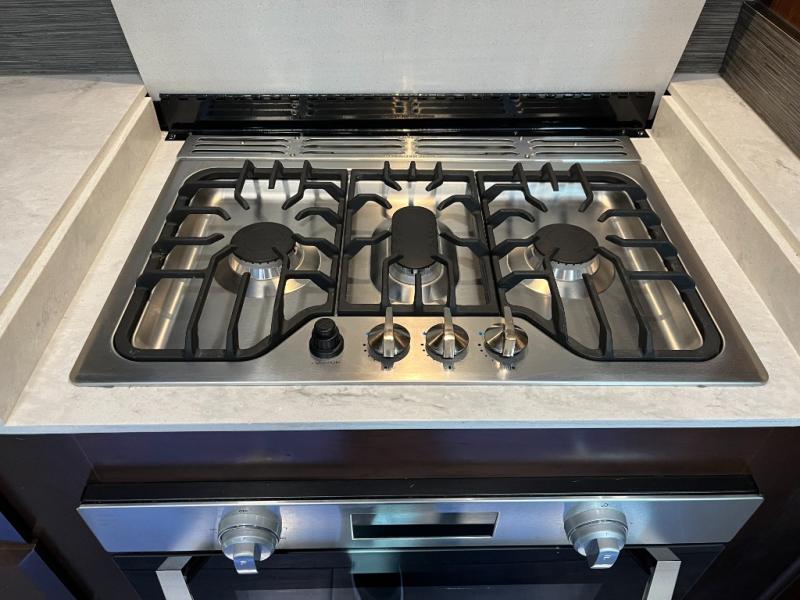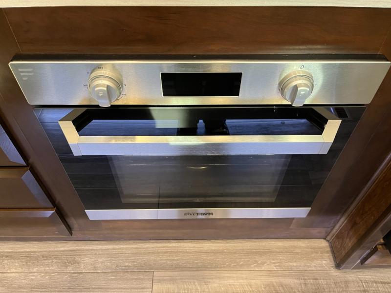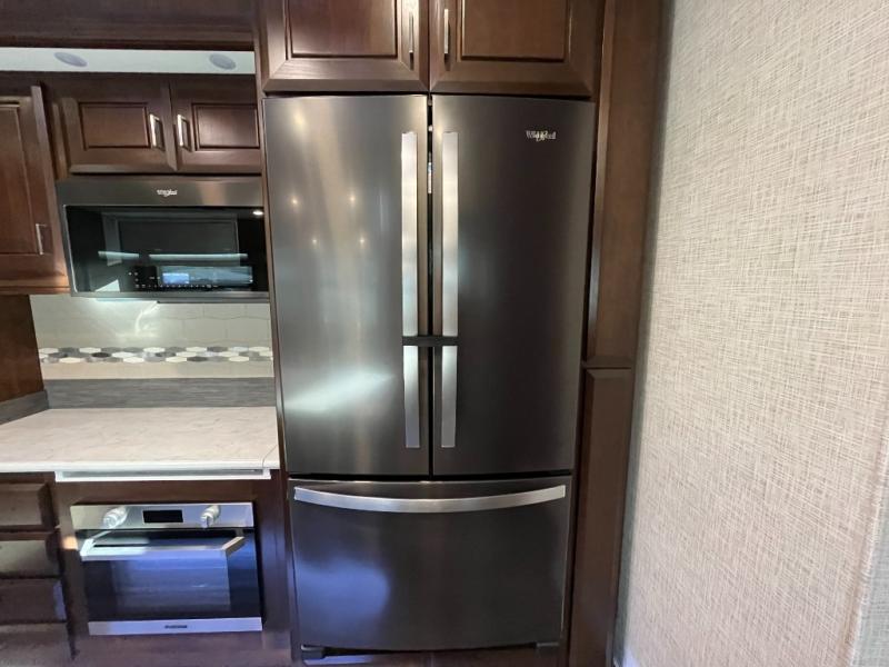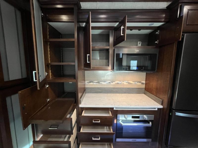 The kitchen in the FullHouse LX455 is designed for RVers who love to cook and entertain. With solid-surface countertops, residential-style appliances, a large refrigerator, generous pantry space, and abundant cabinetry, this kitchen supports everything from simple meals to gourmet creations. Thoughtful layout and quality materials make meal prep easy and enjoyable during extended stays.