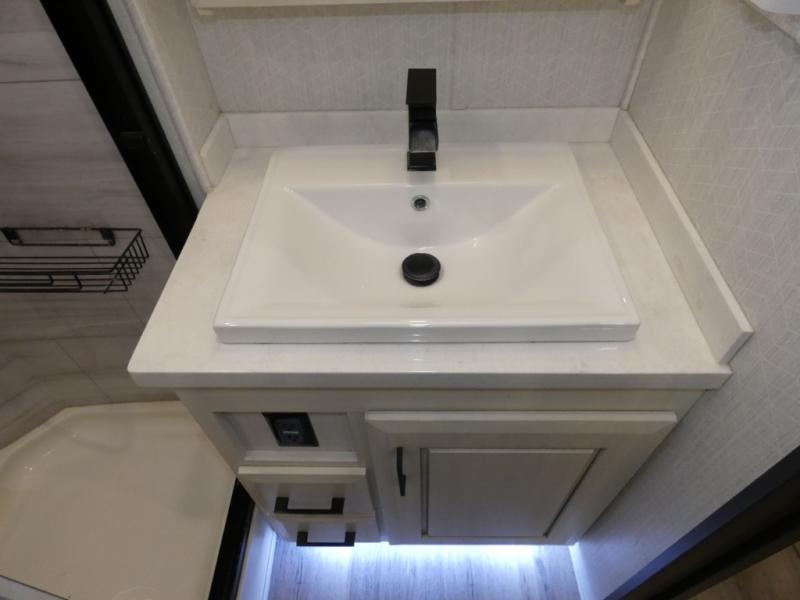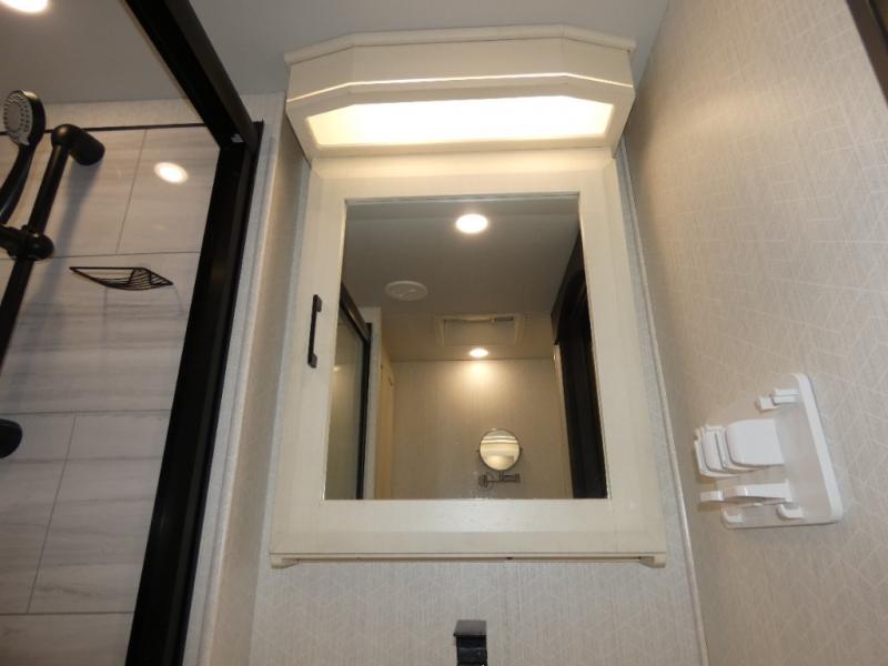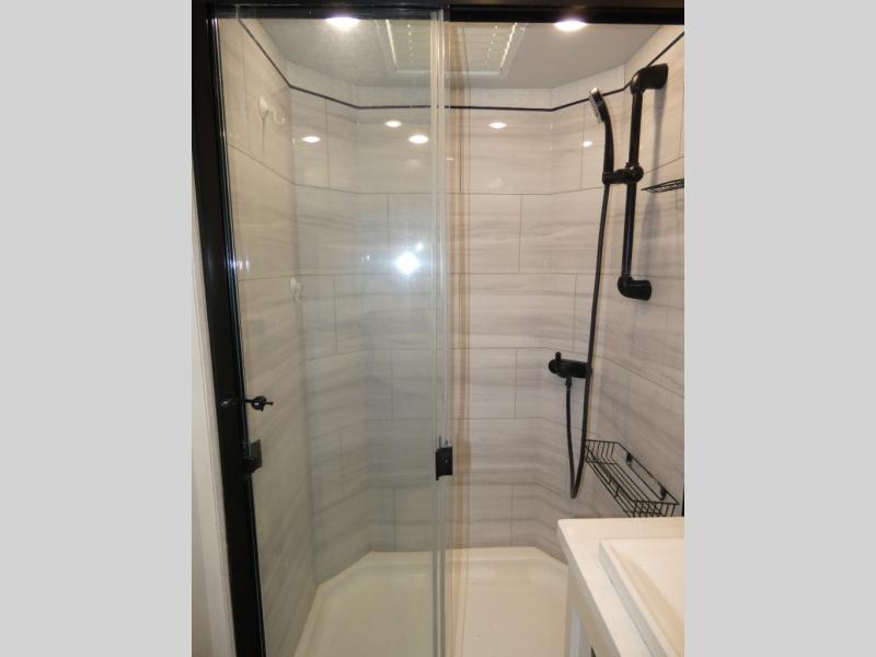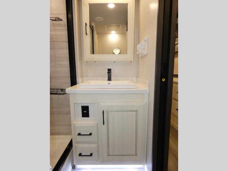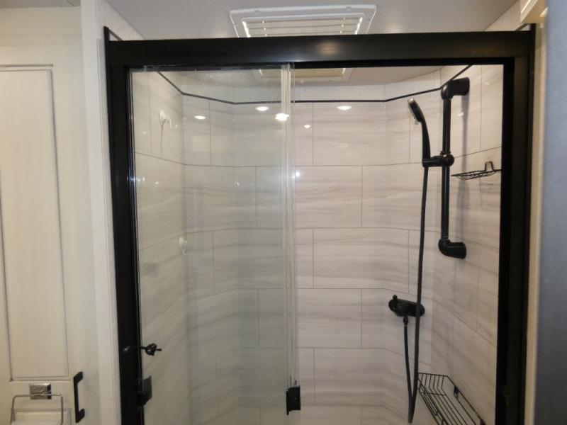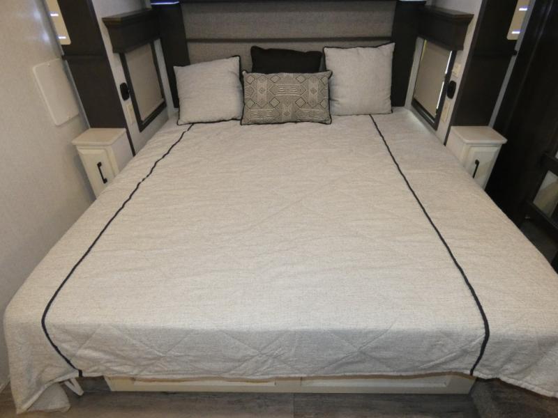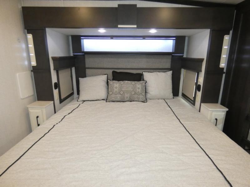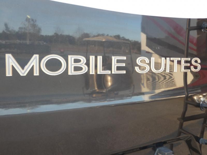 Enjoy the camping lifestyle in luxury with this Mobile Suites in tow. There are four slides for added space, plus a rear kitchen with a desk to get some work done. The pantry will be the perfect place to store paper goods and snacks, and the kitchen island will be a big hit with the chef of your group. Meals can easily be prepared on the three burner cooktop or in the stainless steel convection microwave, and the 13 gal. pull-out garbage can will make clean-up easier than ever. Within the full bath you'll find a one-piece fiberglass shower with a seat, a shower skylight with an LED pot light, plus a powered fan to keep everything fresh. After a day of adventuring outdoors or shopping, you will love the front bedroom with its slide out king bed and large front closet to store clothes, shoes, and bags!