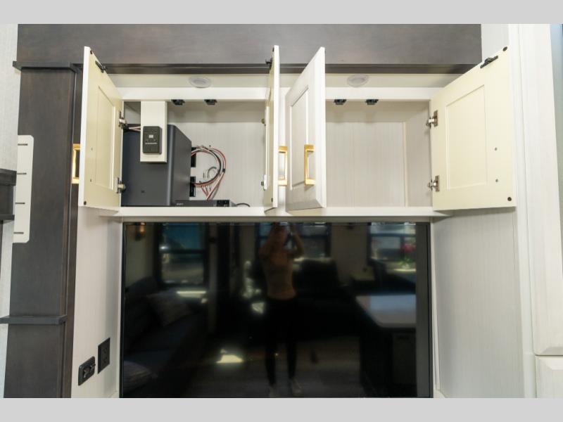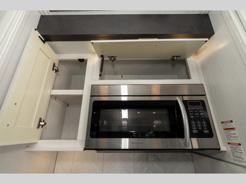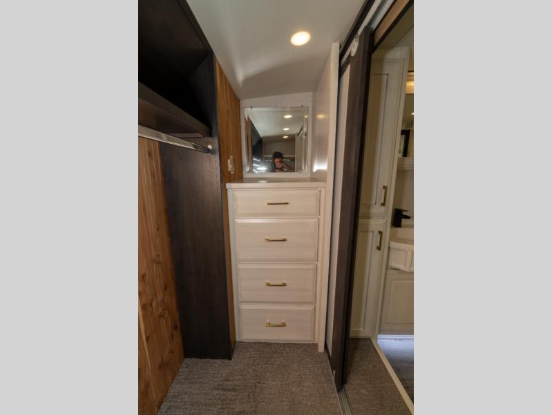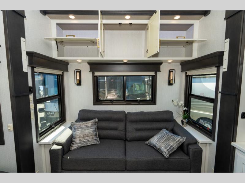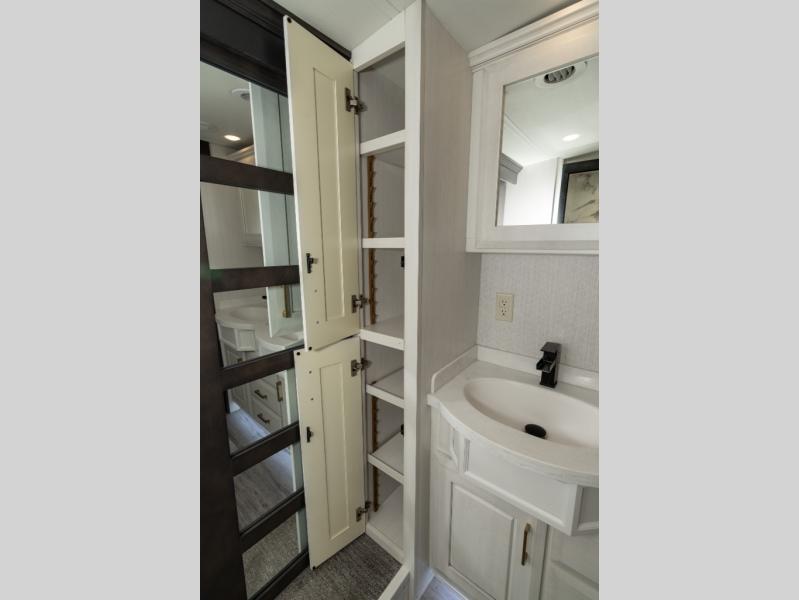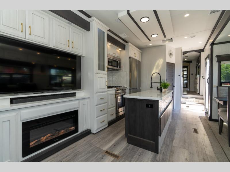 What could be better than enjoying the fresh mountain air and still having all of your creature comforts with you? This fifth wheel allows you to do just that, so come take a look! The dual opposing slides in the main living area provide ample space to relax on the theater seats, the residential hide-a-bed sofa, or play a game at the dinette table with a hidden leaf extension. The half bath bath right off of the kitchen is super handy when guests are over, plus there is a space that has been prepped to add an optional washer and dryer for full-time living. Head up the stairs to find the master suite fit for a king. Here, the slide out king bed is sure to bring comfort and there are reading lights over the bed to catch up on your mystery novel. The front full bath includes dual bath sinks so you and your spouse can freshen up at the same time, and the large front closet will allow you to keep your clothes wrinkle-free!
