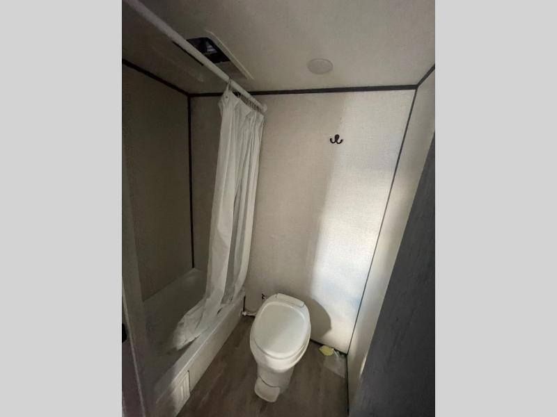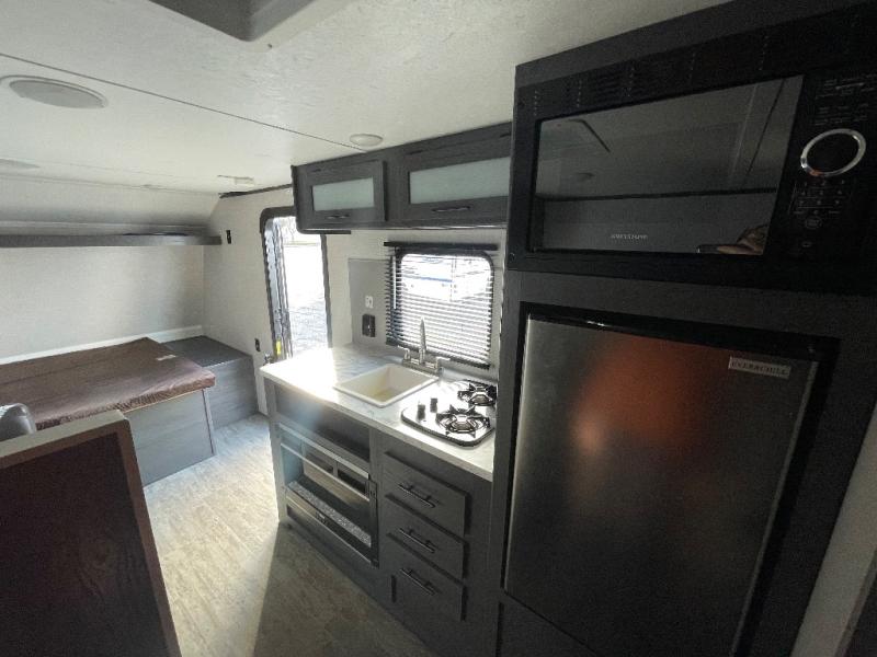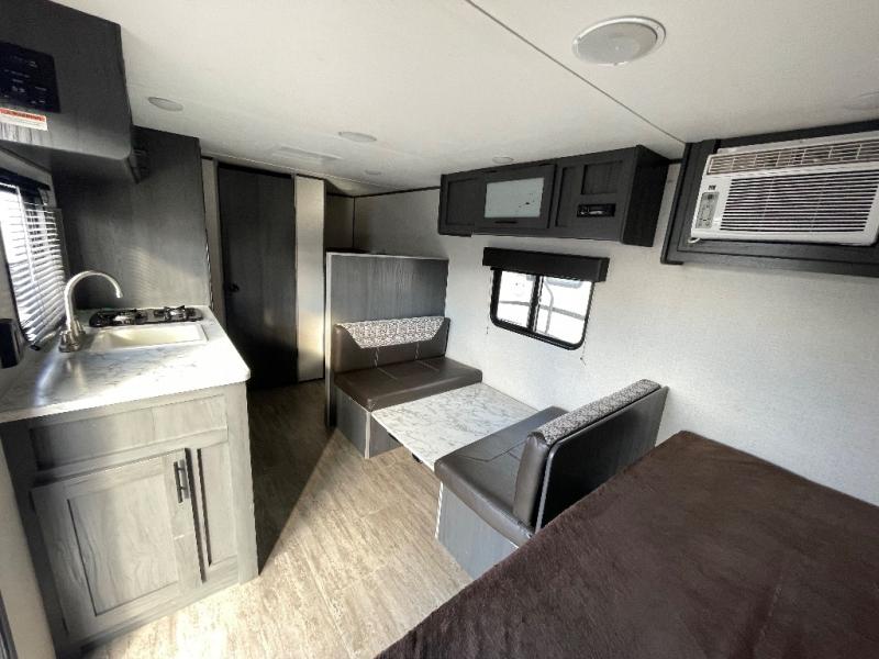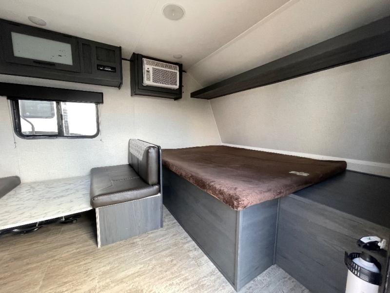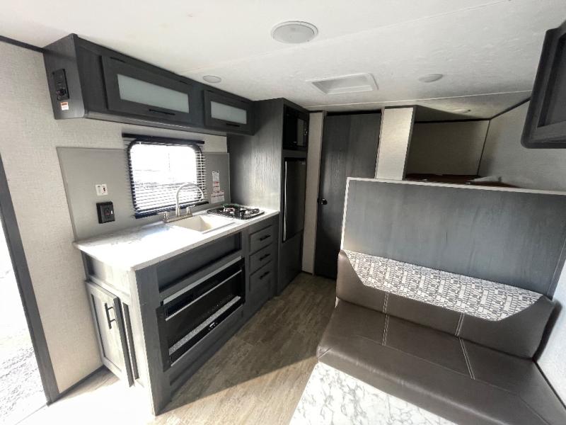 Step inside this travel trailer and see just how fun your next camping trip can be! The kids will love the set of rear corner bunk beds and you will love the front queen-size bed, plus the booth dinette can transform into an extra sleeping space when not in use. You can rinse the sand off in the rear corner bathroom, grab a cold drink from the 3.3 cu. ft. refrigerator, and then head outside and relax underneath the 10' power awning with LED lights!