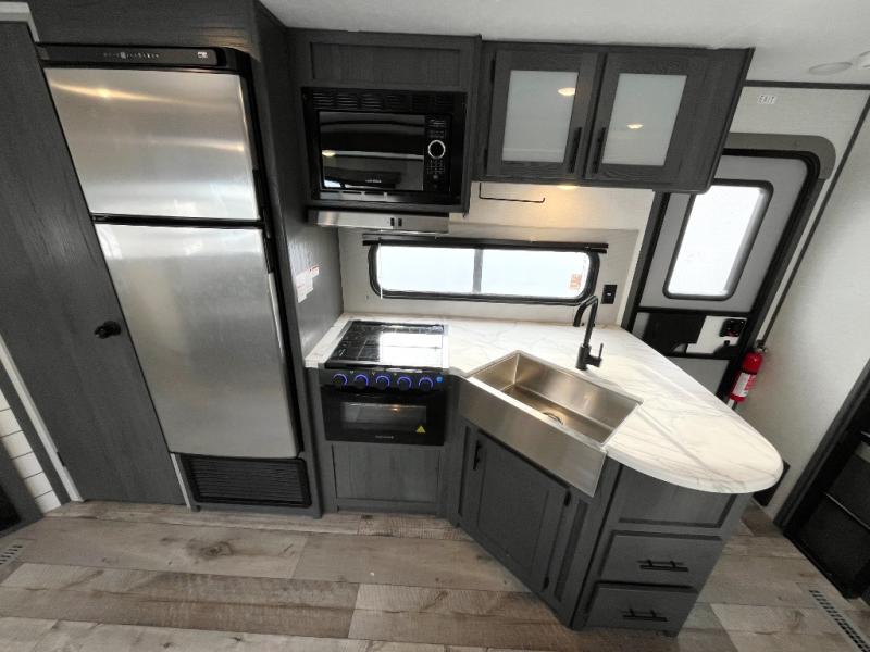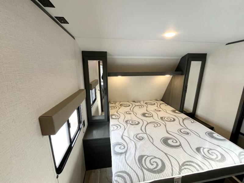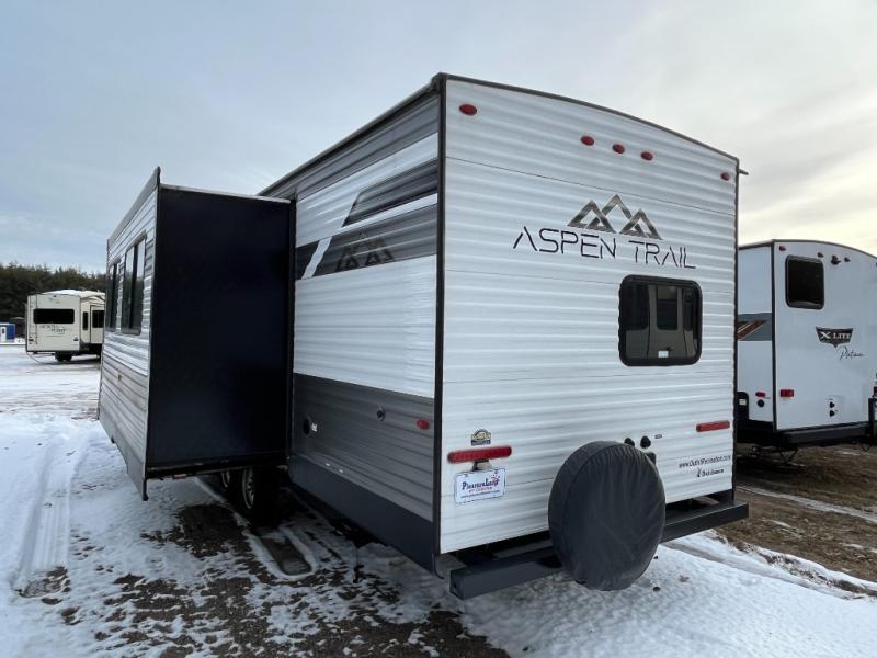 You won't know where to begin with this Aspen Trail travel trailer that has two entry doors! The kids will love sleeping on the rear set of double-size bunks, and you will love having your own private retreat in the front bedroom that has a queen-size Everdream mattress always waiting for you. The U-shaped dinette and sofa rest upon the large slide which provides extra moving space. Grab a snack from the large pantry and head outdoors to see what the chef is grilling up at the outdoor kitchen!