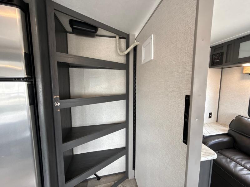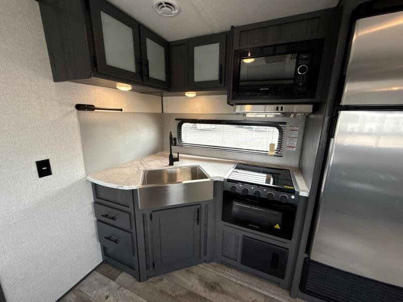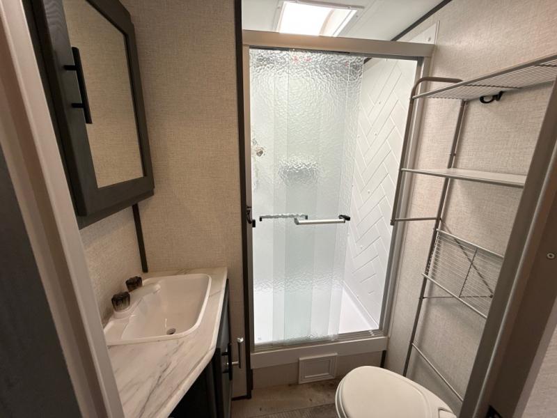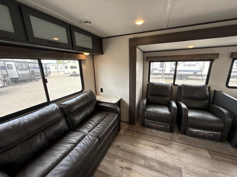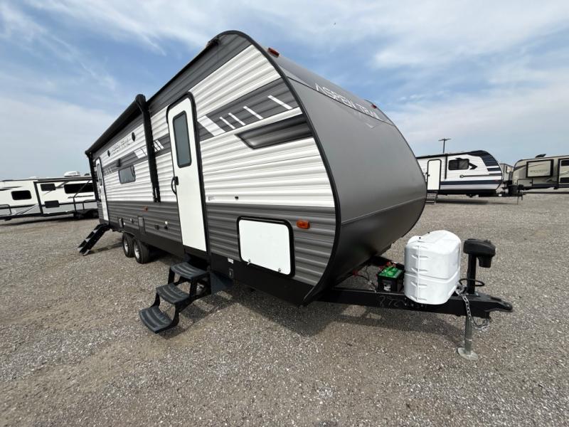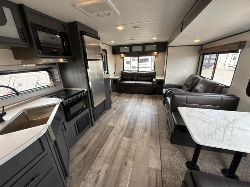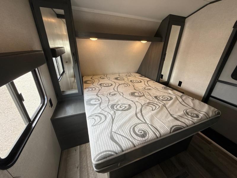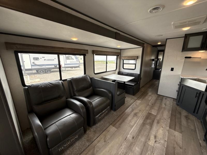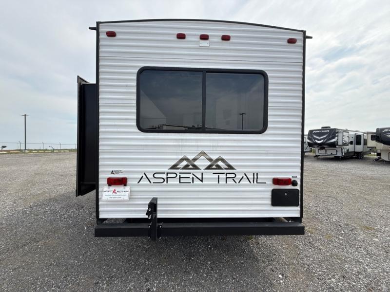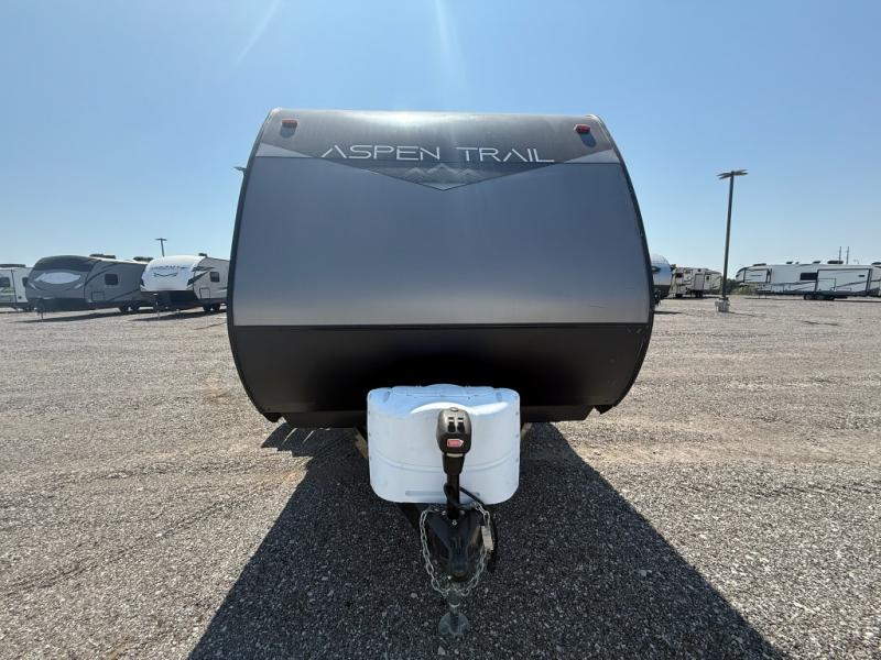 Pack up your gear and head out on your greatest camping adventure with this Aspen Trail travel trailer! You will love everything it has to offer, like the two entry doors that promote a smooth flow of traffic, the recliner chairs, and the sofa with end tables on either side. The booth dinette is the perfect place for you to enjoy your meals, play games, and even transform into an extra sleeping space. The front private bedroom welcomes you with a queen-size Everdream mattress to enjoy a good night's rest and even has a wardrobe for you to keep your hang-up clothes neat and tidy!