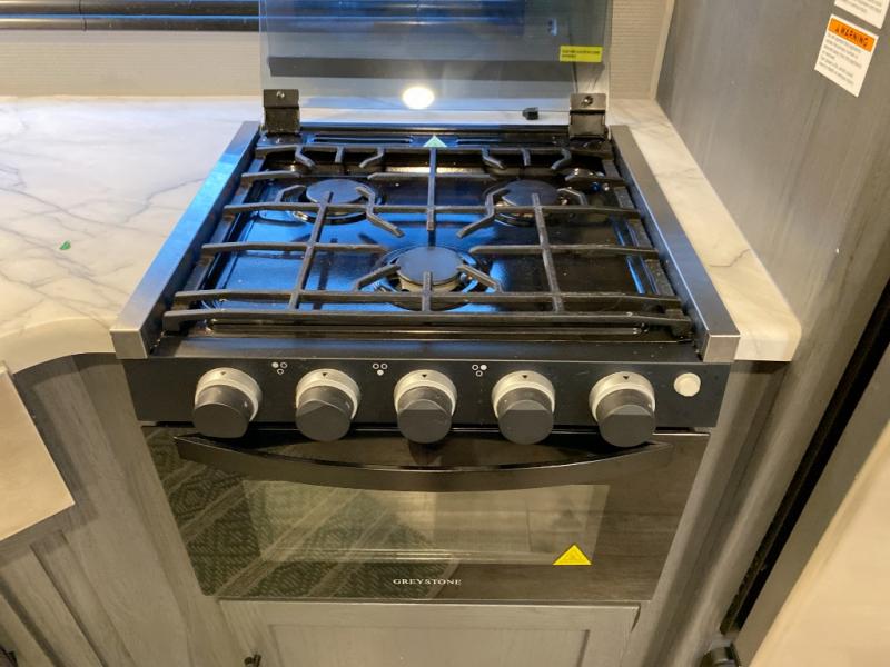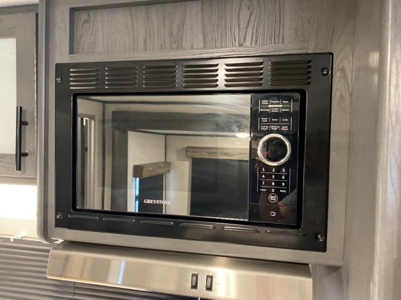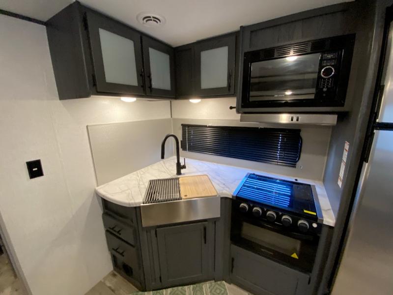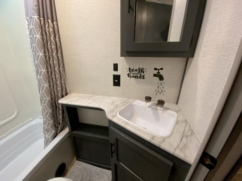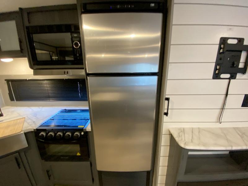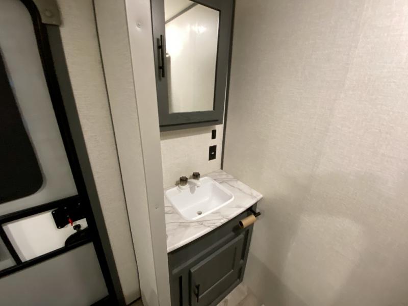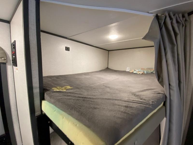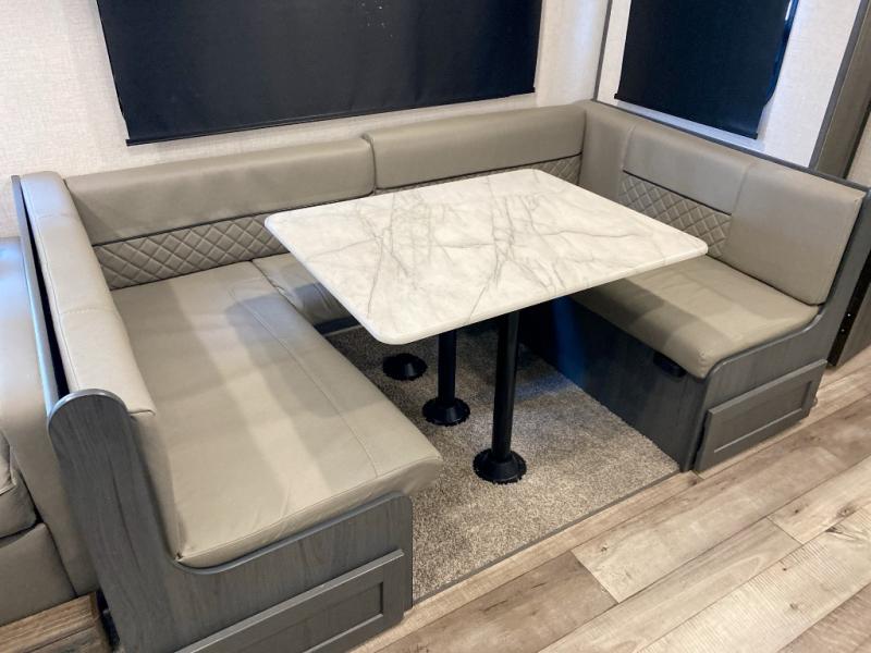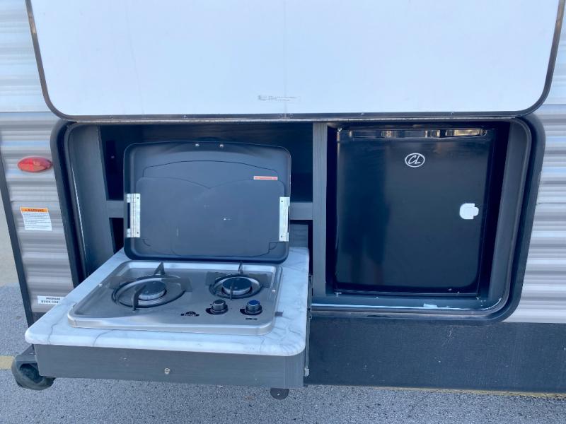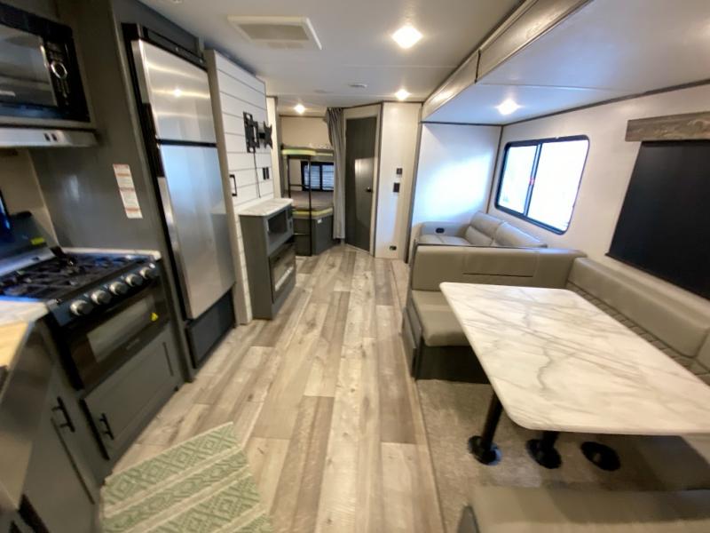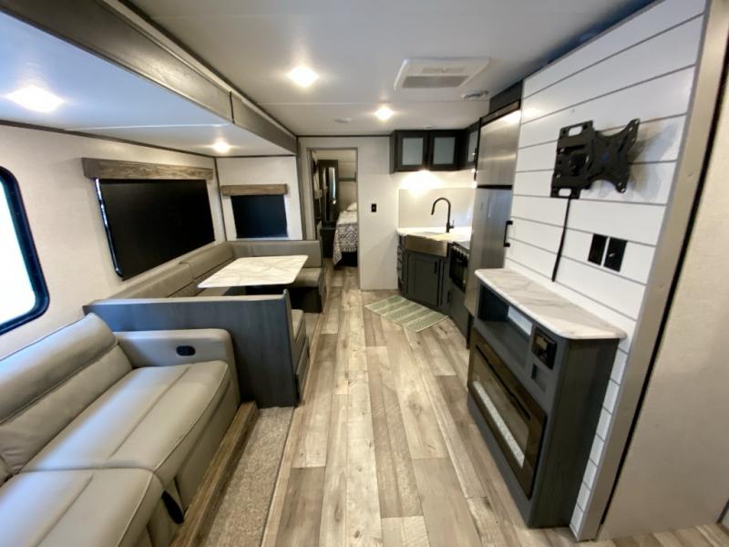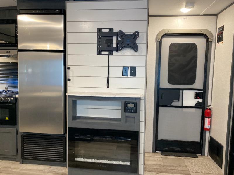 This travel trailer is decked out in features you will love! From the U-shaped dinette and sofa slide across from the hinged entertainment center with a fireplace to the front private bedroom with its very own private half bathroom. The kids will also have their own private bathroom with it being conveniently right next to the set of rear corner bunk beds. Whether you cook indoors on the three burner cooktop and oven or at the outdoor kitchen, you are sure to enjoy a delicious meal.