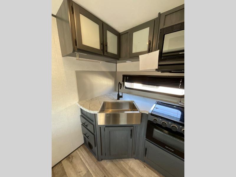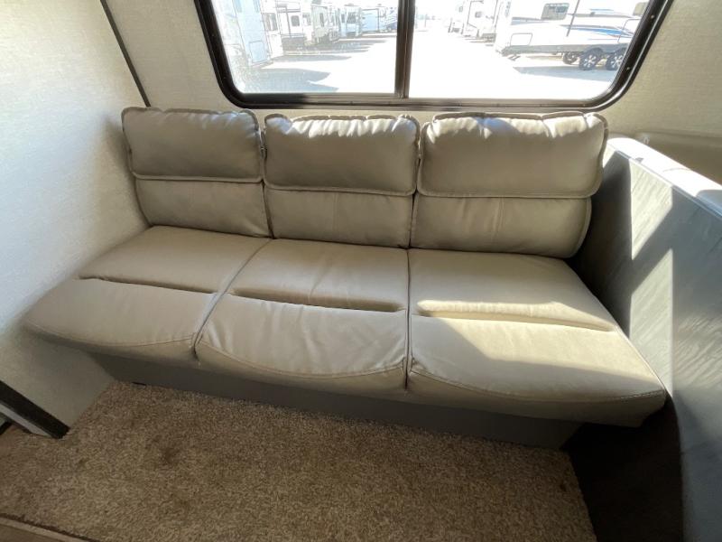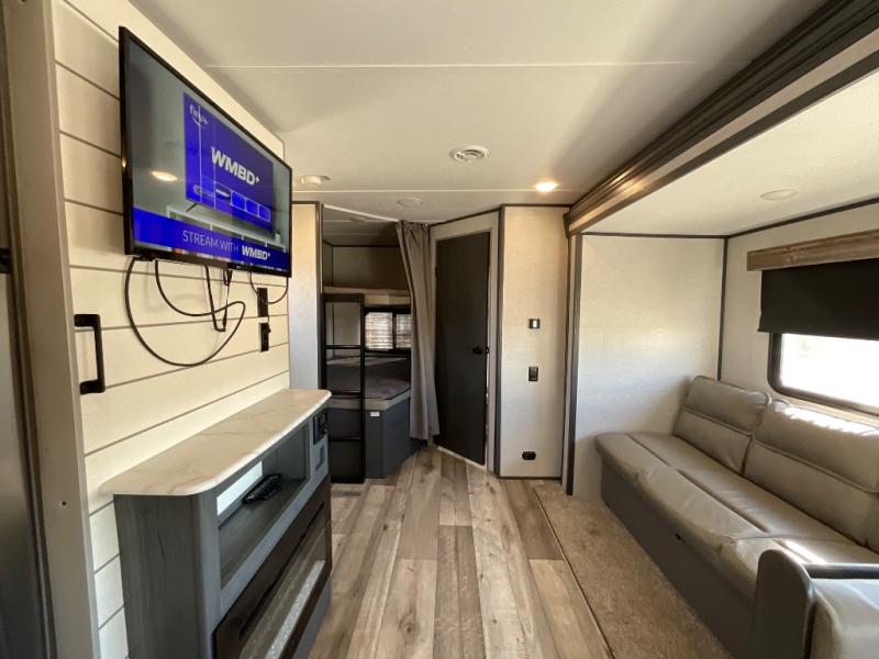 This travel trailer is decked out in features you will love! From the U-shaped dinette and sofa slide across from the hinged entertainment center with a fireplace to the front private bedroom with its very own private half bathroom. The kids will also have their own private bathroom with it being conveniently right next to the set of rear corner bunk beds. Whether you cook indoors on the three burner cooktop and oven or at the outdoor kitchen, you are sure to enjoy a delicious meal.