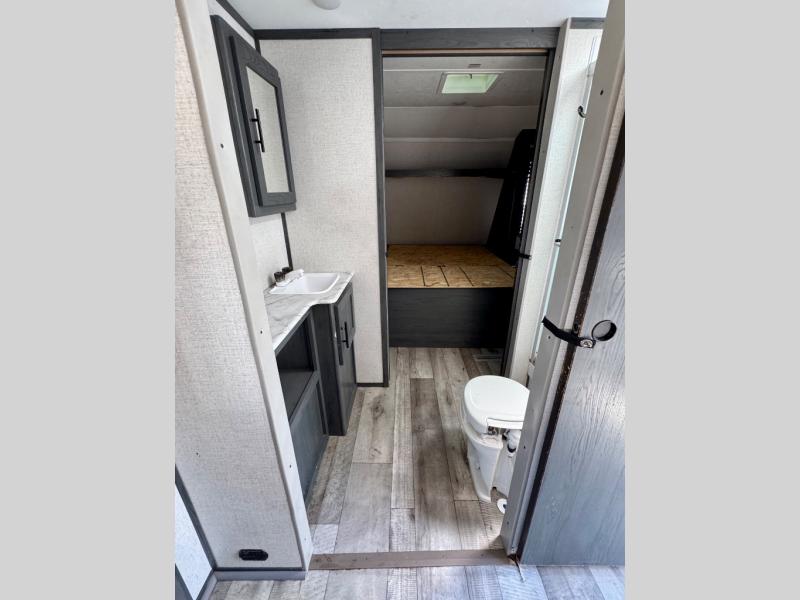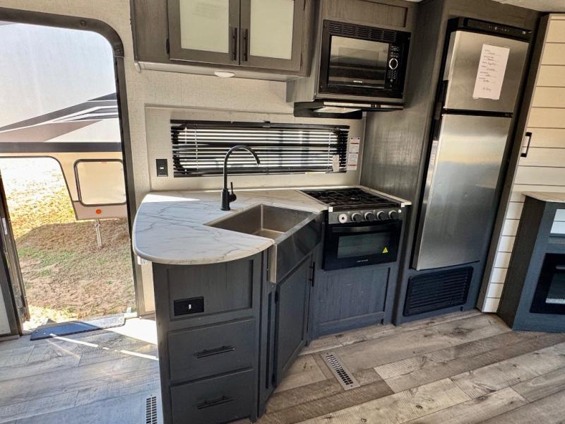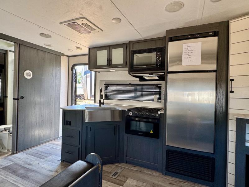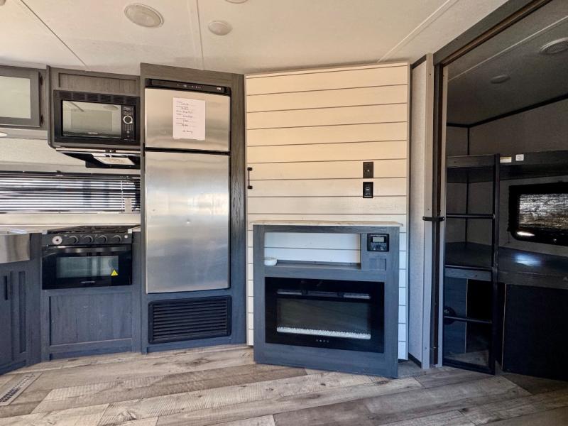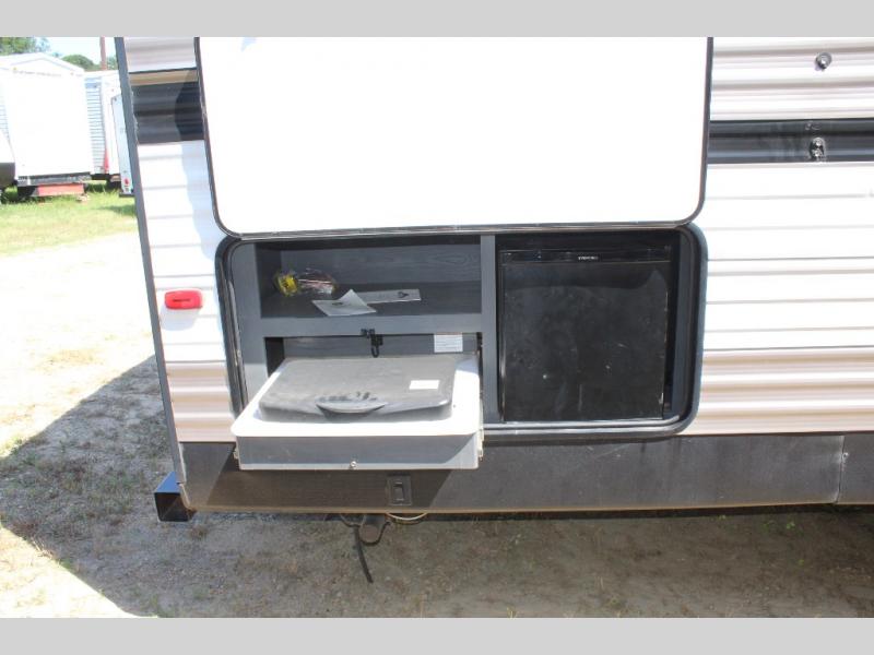 You won't want to camp any other way than in this Aspen Trail travel trailer! The rear private bunkhouse is sure to be a hit with the kiddos, and you will love the front private bedroom with its discreet access into the walk-through bath. The hinged entertainment center makes it easy for anyone to see while sitting on the sofa or U-shaped dinette. Grab your favorite snack from the large pantry and head outdoors while you talk with the chef who is preparing dinner at the outdoor kitchen!