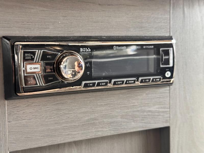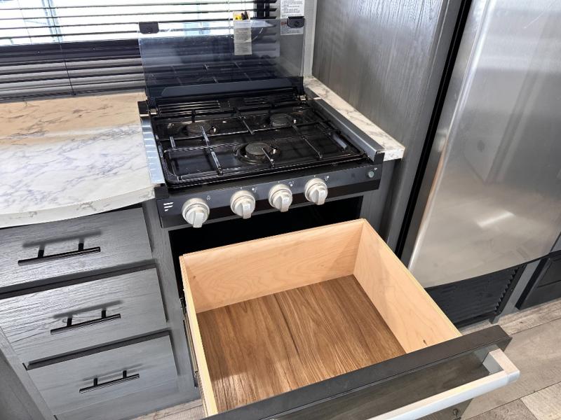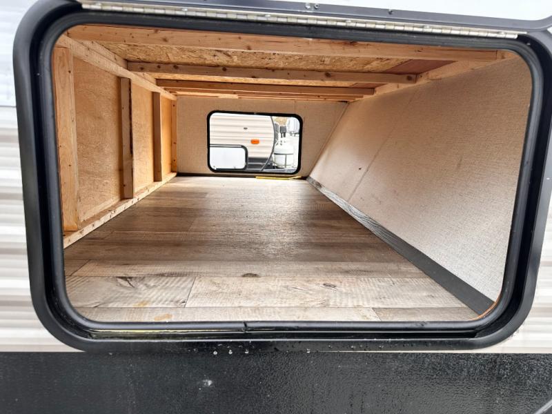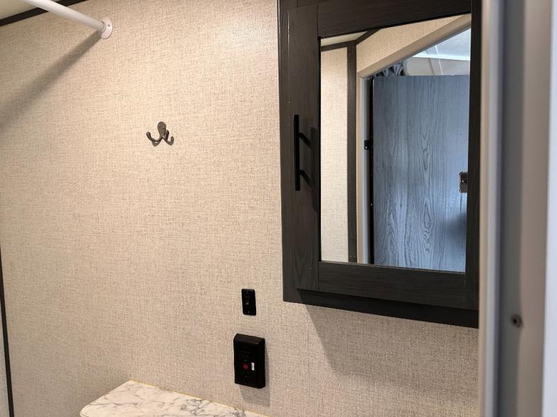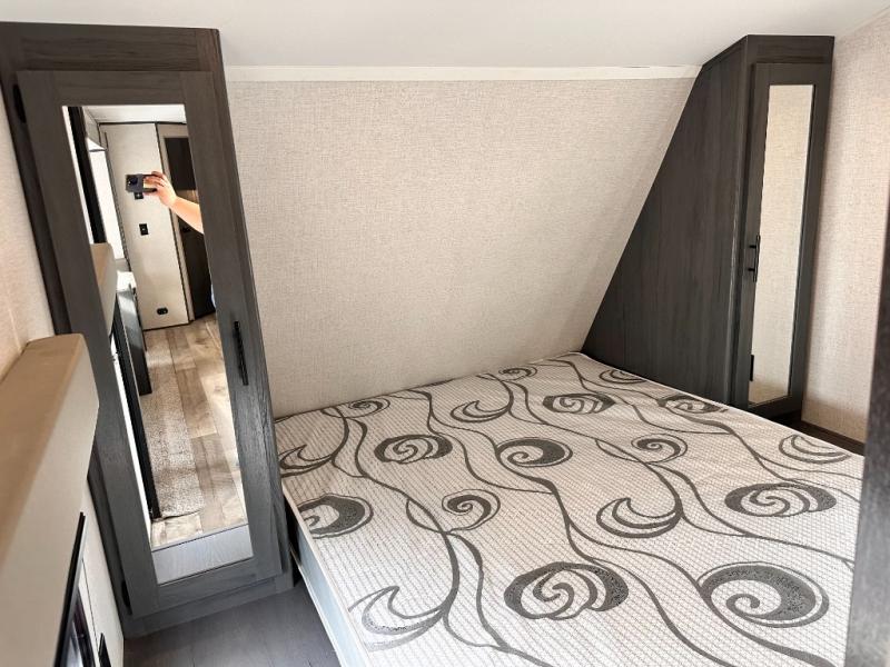 You will feel right at home camping in this travel trailer! The front private bedroom has a queen bed with wardrobes/nightstands on either side and doors on either side to exit the room. The sofa is a great place for an afternoon nap and comes with EZ storage to put your blankets or games that you can play at the booth dinette. Everyone can get cleaned up in the rear corner bathroom, and the set of bunk beds are conveniently right next to it!