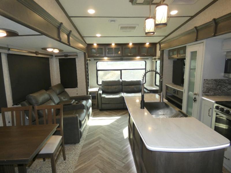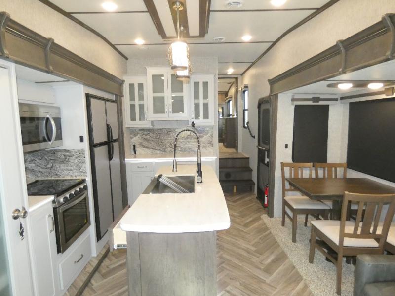 Whether you travel with your spouse or your family to state parks or RV resorts, this fifth wheel offers enough space and comfort! Enjoy the cozy 40" glass fireplace during chilly months, and the 50" LED TV on rainy days. The dual opposing slides in the rear living/kitchen area open up the whole space, and the kitchen island with solid surface countertop makes it feel more like home. You'll appreciate all the storage space you have, including a pantry and a 12 cu. ft. refrigerator for all your food for the week. This unit features a front private bedroom with a king-size bed slide and a large front wardrobe.